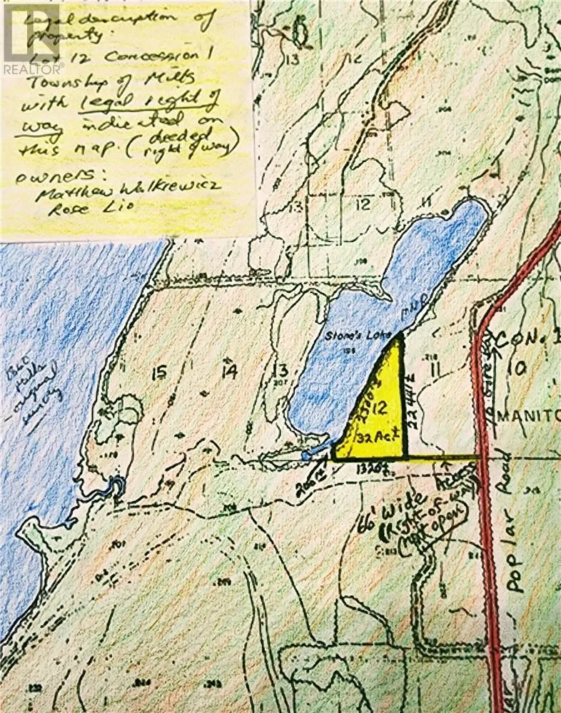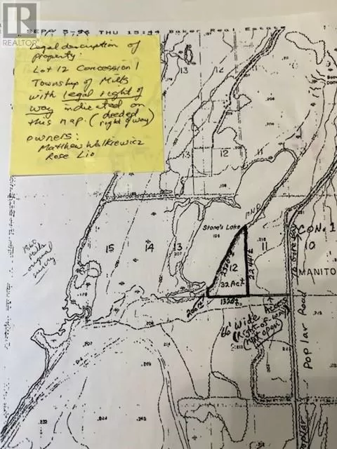 **Escape to nature and create your familyâs dream retreat with this stunning 30+ acre wooded waterfront lot on the peaceful shores of Stoneâs Lake** on Western Manitoulin Island just a short drive from the friendly and historic community of the Town of Gore Bay, this rare property offers the perfect balance of seclusion and accessibility. With approximately 2,300 feet of pristine shoreline, youâll enjoy breathtaking lake views, endless recreational opportunities, and complete privacy for generations to come. The land is beautifully forested with a mix of mature trees and natural bush, offering a classic Northern Ontario setting ideal for hiking, exploring, and enjoying the outdoors. The expansive size and generous waterfront make it an ideal location to design and build your family cottage estateâwhether you envision a cozy log cabin tucked among the trees, or a spacious year-round home with panoramic lake views. The calm waters of Stoneâs Lake are perfect for swimming, paddling, and fishing, while the surrounding property provides ample room for trails, gardens, and even additional guest cabins if desired. Access is via an unopened legal right of way off Poplar Road, adding to the private, off-the-beaten-path appeal. Yet you're still within easy reach of shops, services, marinas, and cultural attractions in nearby Gore Bay. Whether youâre looking to unplug on weekends, host family gatherings, or build a lasting legacy in the heart of Manitoulin Islandâs natural beauty, this property offers the canvas to make it all happen. Donât miss this rare opportunity to own a large, untouched piece of waterfront paradise. Contact us today for more details and start planning your ideal family getaway. (id:27476)