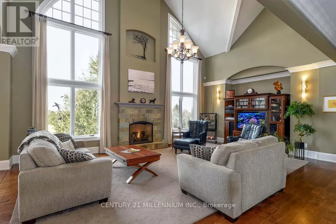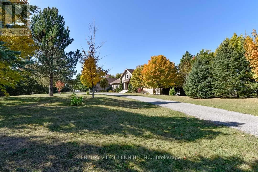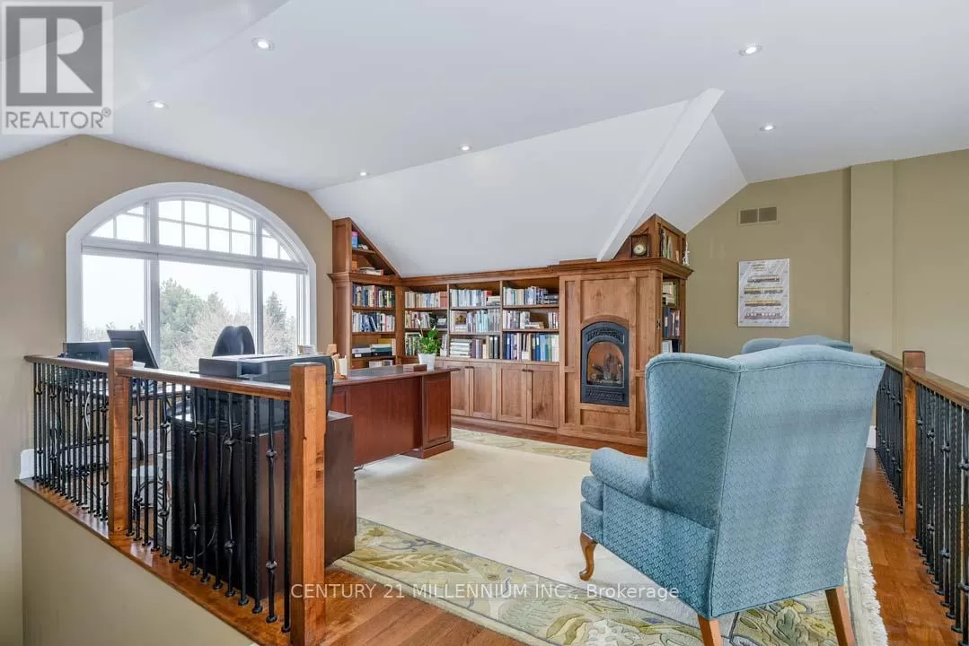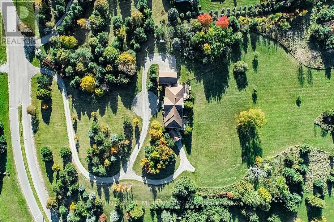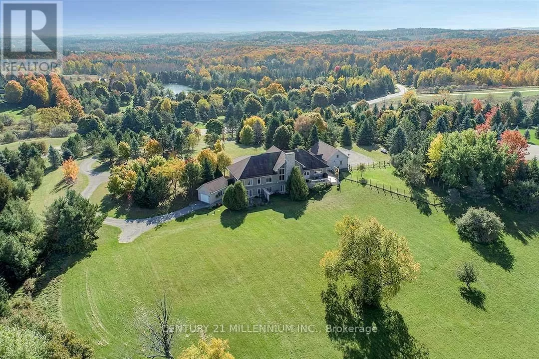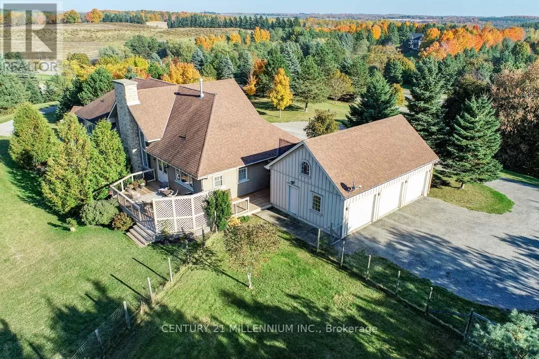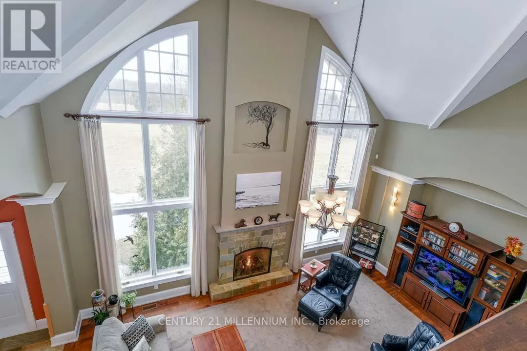 Cross Streets: Porterfield Rd (136)/Flaherty Lane. ** Directions: From the South - Hwy 10 North - West on 109 Bypass - South on 136 (Porterfield Rd) - West on Flaherty Ln. On a prestigious cul de sac, mins outside Alton & Orangeville, is this outstanding custom-designed 3+2 bed, 3.5 bath bungaloft with a finished walk-out bsmt in the French chateau style, with breathtaking views, both north and south, over the Caledon countryside. Sitting stately on the hillside w/ manicured grounds, this home features 4 fireplaces, multiple walkouts, a fenced dog run, a large wraparound deck w/ views of the private rear field w/ apple trees, and a 1+ acre pond. Bright & spacious 2-bed in-law suite has a 1-car attached garage (a rarity!), sep entry & a walk-out to a private patio w/ perennial garden. Extensive architectural qualities include elegant crown mouldings, bump-out niches & faux columns, pocket doors, arched hallways, strategically located pot lights, tray ceilings w/ ribbon lighting & quality materials such as cross-sawn oak floors thru/o. Dramatic Great room w/ soaring 19 ft. cathedral ceiling & stone-clad gas FP and mantle is open to the chefs Kitchen in natural maple wood w/ a large c-island w/ b-bar, granite c-tops, 12 ft. tray ceiling w/ lighting, SS appliances, a desk, wet bar, heated stone floors & a garden door to the deck w/ a gas BBQ hook-up. Primary has walk-in closet, gas FP, 5-piece ensuite w/ a glass shower & soaker tub. Laundry rm off the ensuite. Double French pocket doors on the main level offer privacy to the loft Office w/ a gas fireplace, built-in cabinetry & south-facing views. Lower level Rec rm has a garden door w/o to the b/yard. Rough-in 3-piece bath. Built in 2008, offering approx. 5100 sq.ft. of fin living space, 9 ft. ceilings on the main level, privacy, on 10.85 acres, while being close to Highways 10 and 9 for easy commuting, the hospital & Orangeville for all amenities. Near quaint restaurants, craft breweries, farmers markets, TPC Toronto Golf at Osprey Valley, Millcroft Inn & Spa, Hockley Valley Resort, hiking trails & conservation areas, and the Hill Academy. 45 mins to TO & Pearson Airport. (id:27476)