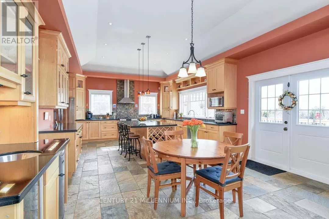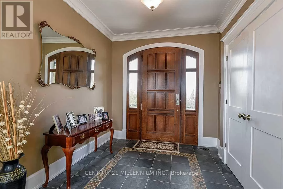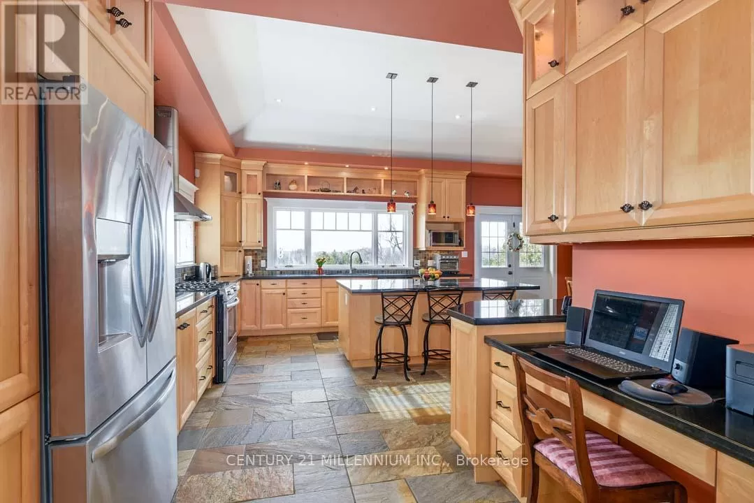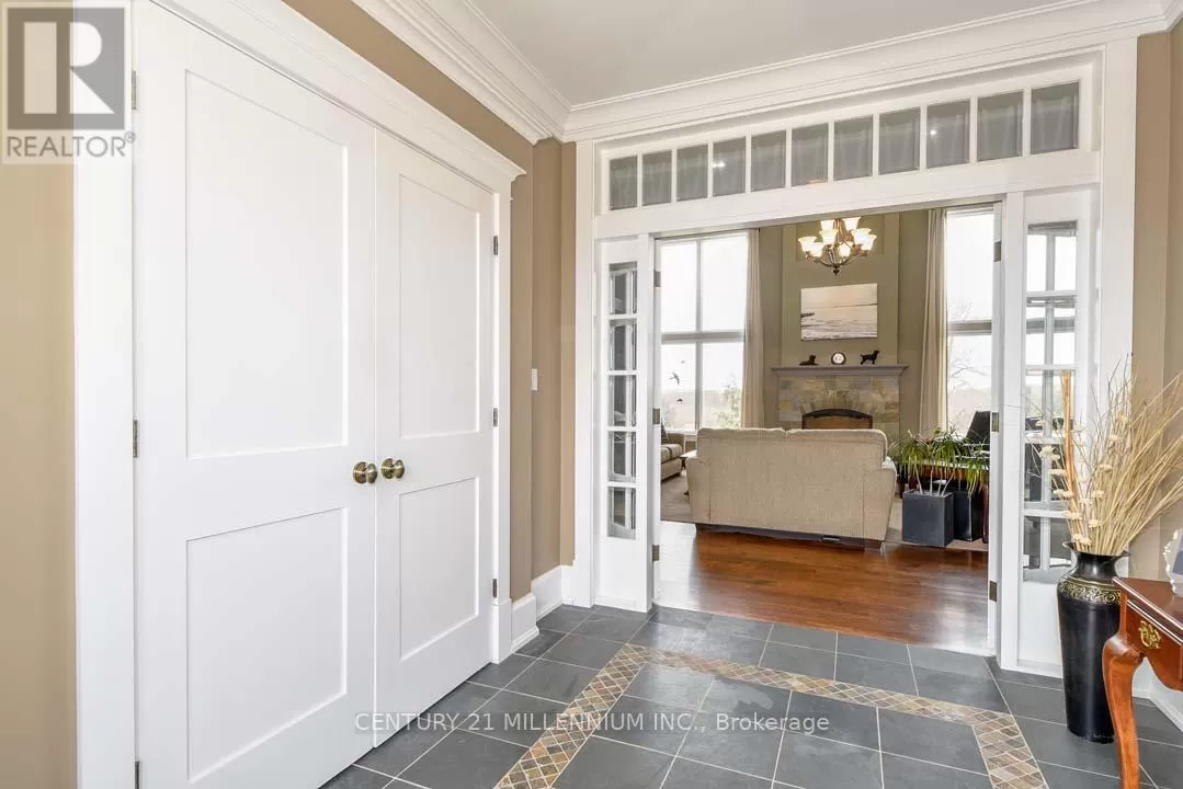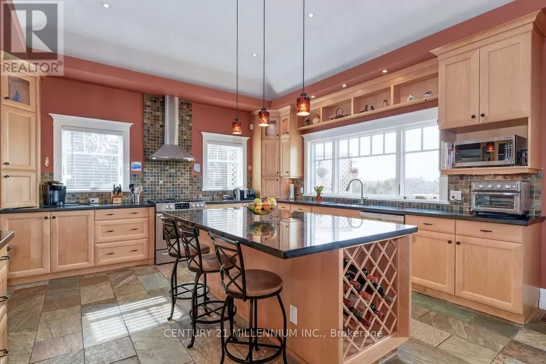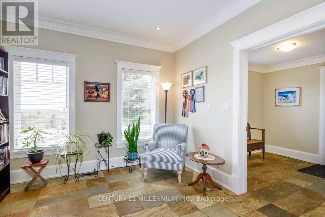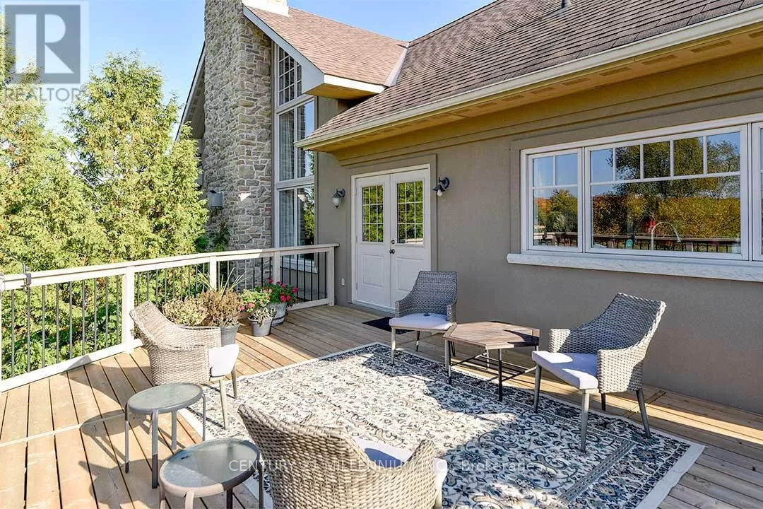 Cross Streets: Porterfield Rd (136)/Flaherty Lane. ** Directions: From the South - Hwy 10 North - West on 109 Bypass - South on 136 (Porterfield Rd) - West on Flaherty Ln. On a prestigious cul de sac, mins outside Alton & Orangeville, is this outstanding custom-designed 3+2 bed, 3.5 bath bungaloft with a finished walk-out bsmt in the French chateau style, with breathtaking views, both north and south, over the Caledon countryside. Sitting stately on the hillside w/ manicured grounds, this home features 4 fireplaces, multiple walkouts, a fenced dog run, a large wraparound deck w/ views of the private rear field w/ apple trees, and a 1+ acre pond. Bright & spacious 2-bed in-law suite has a 1-car attached garage (a rarity!), sep entry & a walk-out to a private patio w/ perennial garden. Extensive architectural qualities include elegant crown mouldings, bump-out niches & faux columns, pocket doors, arched hallways, strategically located pot lights, tray ceilings w/ ribbon lighting & quality materials such as cross-sawn oak floors thru/o. Dramatic Great room w/ soaring 19 ft. cathedral ceiling & stone-clad gas FP and mantle is open to the chefs Kitchen in natural maple wood w/ a large c-island w/ b-bar, granite c-tops, 12 ft. tray ceiling w/ lighting, SS appliances, a desk, wet bar, heated stone floors & a garden door to the deck w/ a gas BBQ hook-up. Primary has walk-in closet, gas FP, 5-piece ensuite w/ a glass shower & soaker tub. Laundry rm off the ensuite. Double French pocket doors on the main level offer privacy to the loft Office w/ a gas fireplace, built-in cabinetry & south-facing views. Lower level Rec rm has a garden door w/o to the b/yard. Rough-in 3-piece bath. Built in 2008, offering approx. 5100 sq.ft. of fin living space, 9 ft. ceilings on the main level, privacy, on 10.85 acres, while being close to Highways 10 and 9 for easy commuting, the hospital & Orangeville for all amenities. Near quaint restaurants, craft breweries, farmers markets, TPC Toronto Golf at Osprey Valley, Millcroft Inn & Spa, Hockley Valley Resort, hiking trails & conservation areas, and the Hill Academy. 45 mins to TO & Pearson Airport. (id:27476)