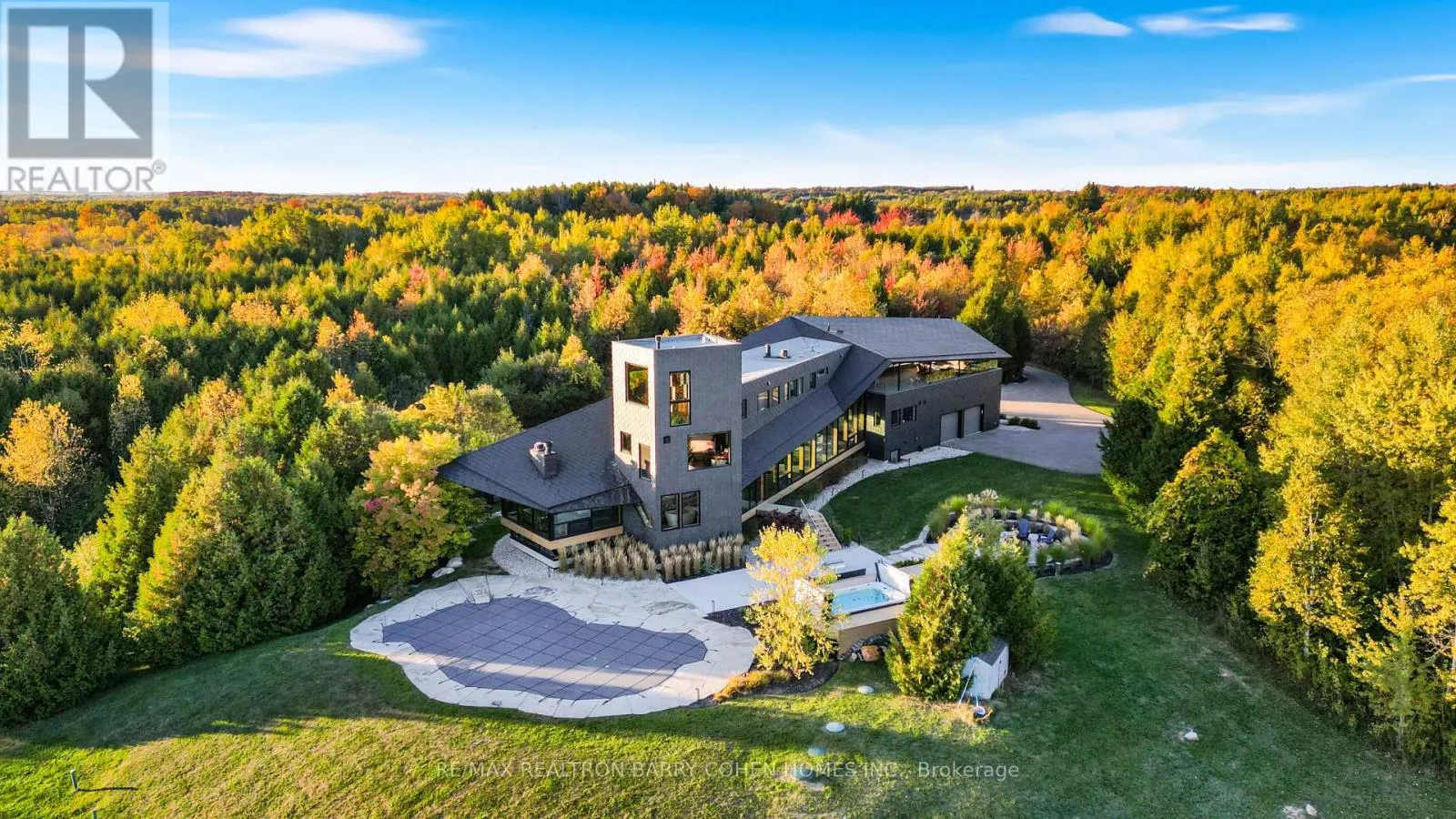 Cross Streets: Charleston Sideroad/Heart Lake Rd. ** Directions: Heart Lake S Of Beech Grove. A jaw-dropping architectural statement in the heart of Caledon! This one-of-a-kind residence blends world-class design, natural beauty & uncompromising craftsmanship across 10,300 square feet of living space. Designed by Kariouk Architects w/interiors curated by the renowned Karin Bohn, the home has been celebrated in films, fashion shoots, & multiple design awards, standing as a true icon of modern architecture in Ontario. The exterior showcases a copper roof & natural slate stone siding wrapping both the façade & select interior feature walls-materials chosen for their rarity, permanence, & sculptural quality. Inside, the atmosphere is defined by floor-to-ceiling windows, dramatic lighting & solid white oak tongue-and-groove ceilings. The raised ground-floor design allows for continuous transom windows around the perimeter, filling the lower level w/natural light. A large central floor opening connects the two levels visually & spatially, framing the home's main fireplace & creating a dynamic double-height volume. Throughout the home, you'll find extensive custom millwork, steel beam & suspended walkways, & dramatic vaulted ceilings w/ambitious angles that celebrate the artistry of structure & form. The oak interior doors w/oil-rubbed bronze hardware add a warm, tactile contrast to the sleek architecture. The gourmet kitchen features Gaggenau appliances & is complemented by a secondary prep kitchen/pantry designed for seamless entertaining. Beyond the interior, an impressive covered deck-integrated into the roof system with Ipe floors & B/I speakers, oriented toward stunning elevated views. Outdoor living continues w/a fire pit, hot tub, & inground pool, all set against almost 100 acres of private, forested land-providing tranquility, privacy & notably reduced property taxes. This is not simply a home-it is a work of art, designed for those who value architecture, privacy & the seamless connection between design & nature. (id:27476)