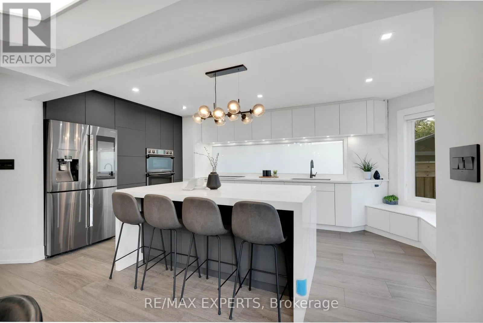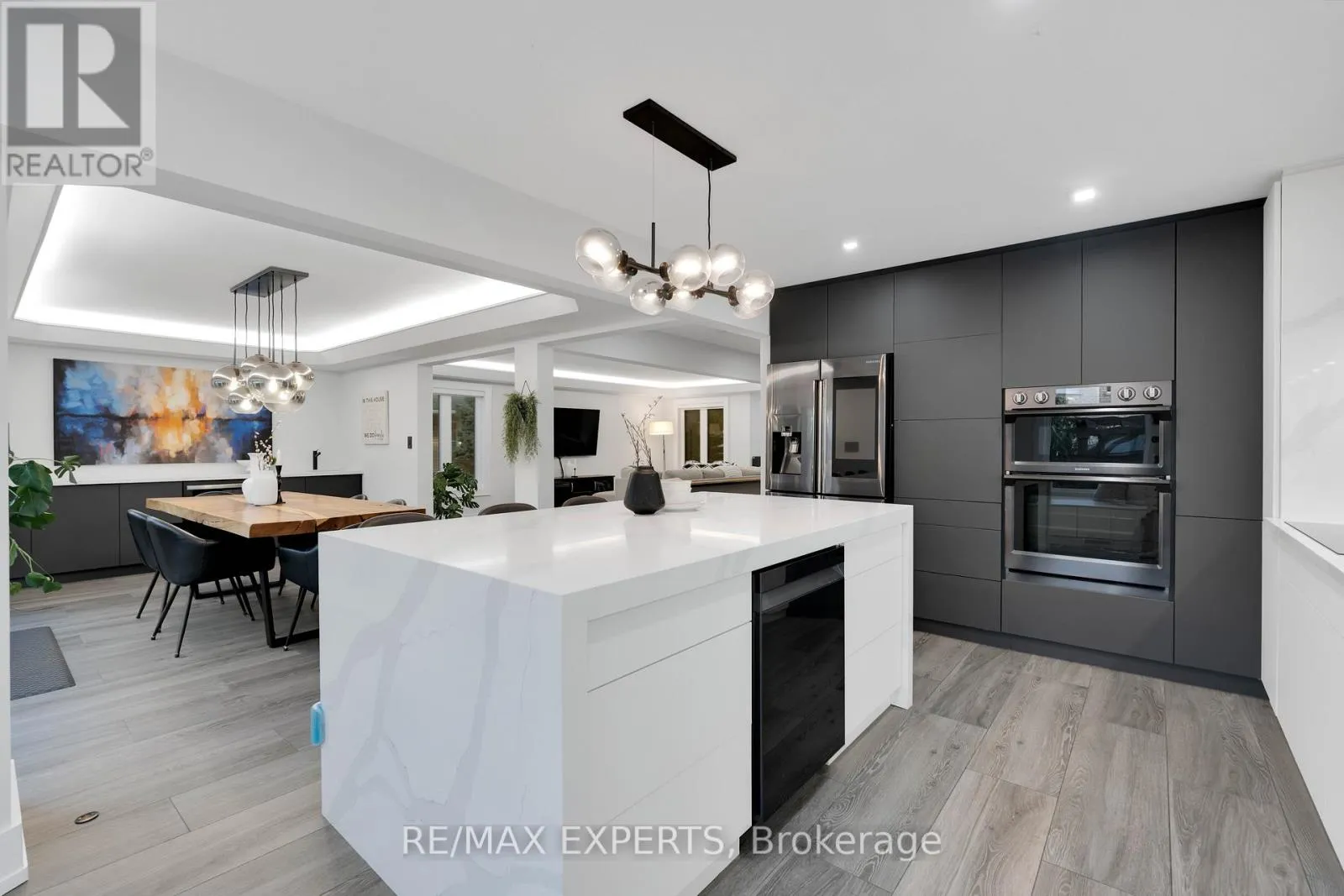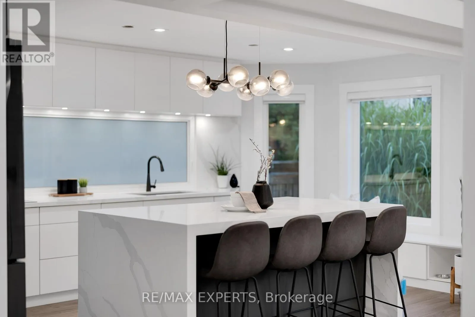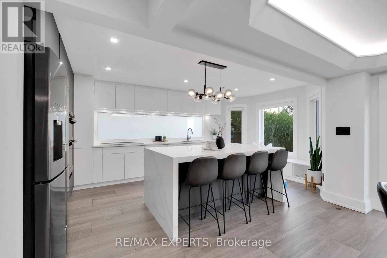 Harvestmoon/King Welcome to refined modern living in the heart of sought-after Bolton West. This exceptional detached residence showcases striking curb appeal, a double-car garage, and a beautifully landscaped lot that sets the tone for the elegance found within. Step inside to a fully customized interior where meticulous attention to detail is evident throughout.The open-concept main floor is anchored by a stunning chef-inspired kitchen featuring a dramatic waterfall island, premium built-in appliances, and a sophisticated combination of matte oak and crisp white cabinetry. Oversized windows bathe the space in natural light, highlighting the designer finishes and wide-plank flooring.The seamless flow between the kitchen, dining, and living areas creates an ideal setting for both everyday living and entertaining. Contemporary lighting and clean architectural lines further enhance the home's modern aesthetic.Thoughtfully upgraded from top to bottom, this turnkey home offers luxury, comfort, and style in one of Bolton's most desirable family-friendly communities. (id:27476)