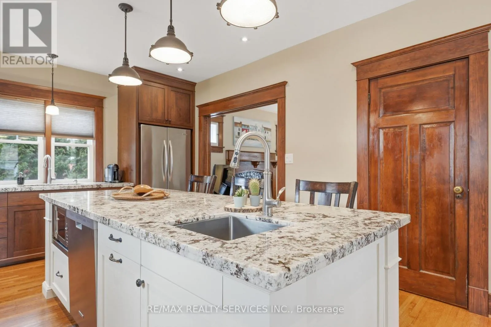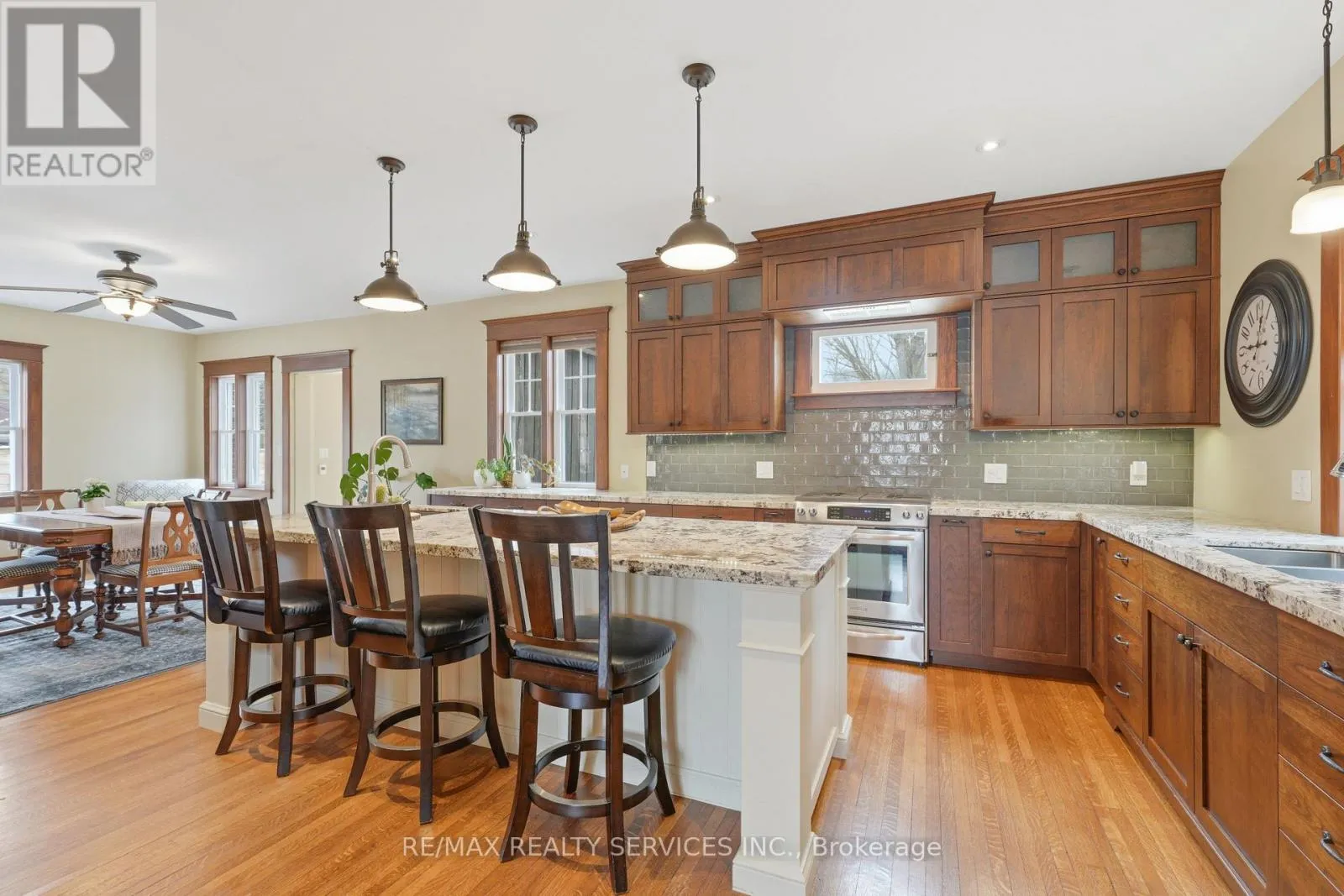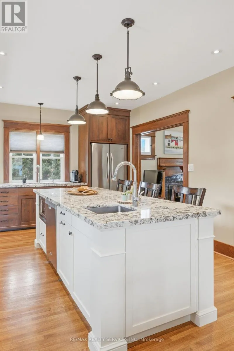 Cross Streets: Emma/Maple. ** Directions: Airport Rd/Emma or Parsons/Maple. The gorgeous Century Home has it all! Tucked away in a pocket of Caledon East downtown and it's amenities, this home has been lovingly maintained and updated through the years! Only 4 owners for this special girl, as whoever comes to live here, doesn't want to leave! This is your opportunity to live with old world character, and all the comforts of a newer home! The covered front porch welcomes you to sit and relax - upon entering the home's large foyer, you're greeted with hardwood flooring and a large closet, high ceilings and entry to the massive renovated kitchen! The custom built kitchen was designed with the original details in mind, blending two-toned cabinetry, a huge island with granite counters, pot lights & tons of built-ins, all relating back to the original trim. A walk-in pantry offers even more storage! The formal living room js cozy with a gas fireplace, quality windows & hardwood floors. Beyond the kitchen is a large mud/laundry room with an up to date 3 pc bathroom and a patio door walk-out to a large deck, extending your indoor-outdoor living. The upper level boasts hardwood floors and 4 spacious bedrooms, with the Primary suite offering a big L-shaped walk-in closet, consisting of two clothing areas, built-in cabinets and a long vanity & windows for natural light! The 3rd bedroom has a rough-in for a 3rd bathroom (under the carpet). Nicely updated 4 pc bathroom. One more level up is a massive attic space with windows, just waiting for your imagination and ideas! The lower level has a large finished rec room with quality LVP flooring, a large window & pot lights; furnace room and large storage area, & a 2nd storage space under the laundry room.The lot here is spectacular, with gorgeous gardens, mature trees and backs onto a farm field. A large double workshop/garage tops the list, with two full garage doors with openers, a separate man door and a huge loft, perfect for entertaining or a perfect man cave! (id:27476)