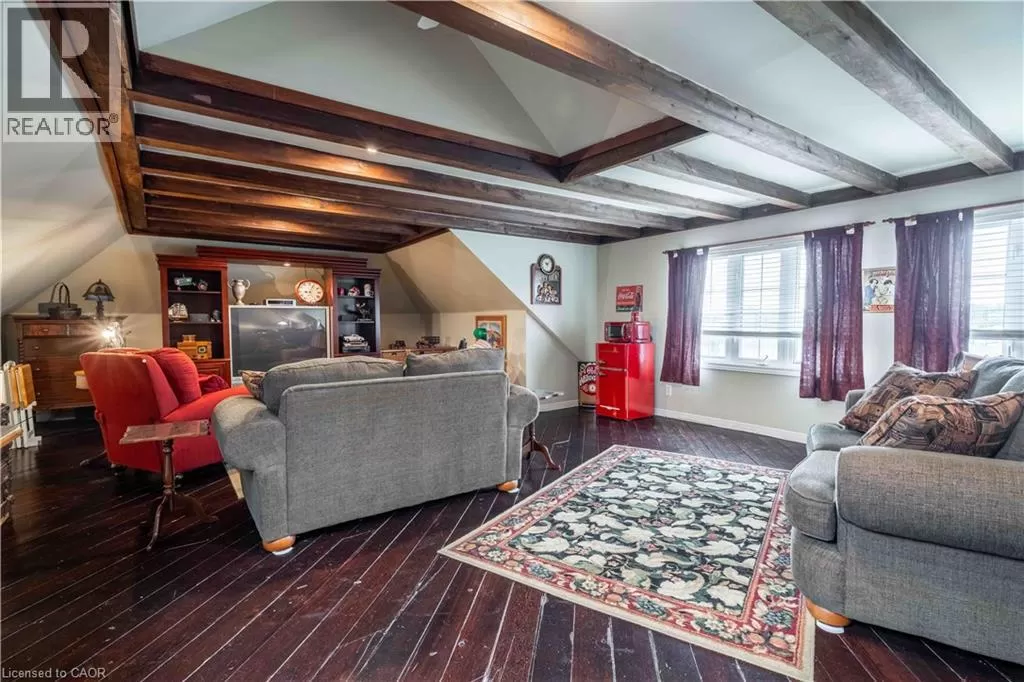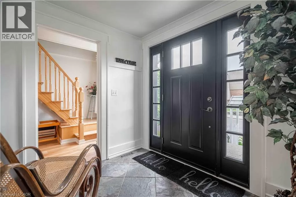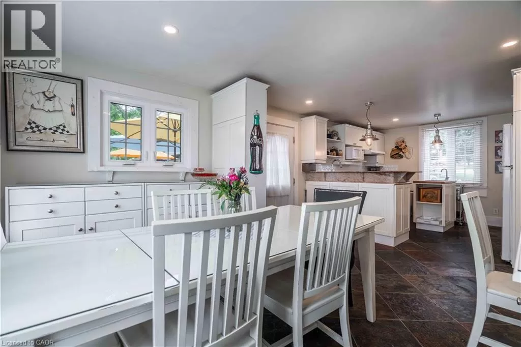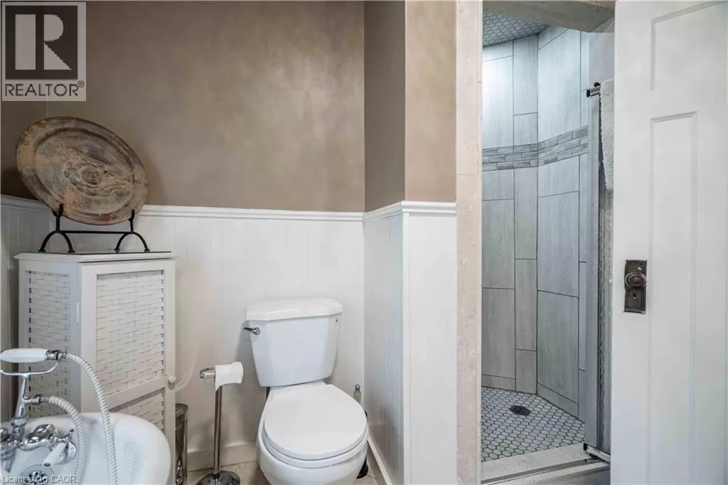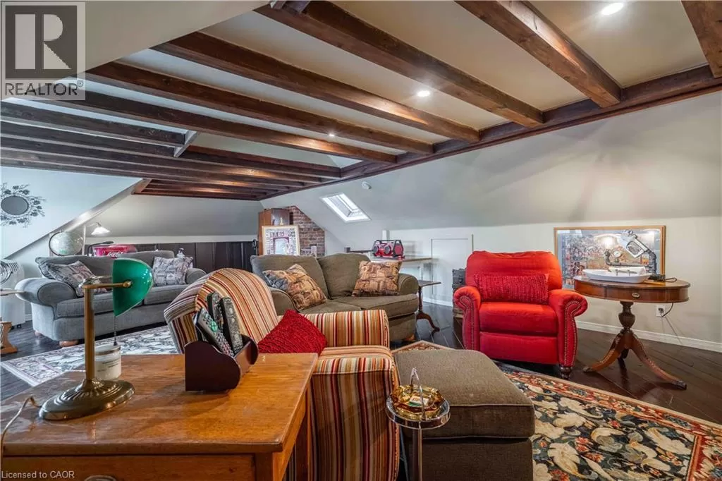From Hwy # 6, take Argyle St North Here is your opportunity to own one of Caledoniaâs notable homes. Enjoy this lovely home is surrounded by gardens & shady green space. Until recently, it was also the location of The Proper Topper Bridal shop -undergoing a metamorphosis to become a lovely family home which can be used for a home-based business. The owners have thoughtfully transformed this home while respecting itâs past. Boasting large principal rooms, light-filled rooms embrace a modern esthetic with neutral colours & lovely restored floors and/or engineered wood floors (carpet-free home!). Main level boasts a chef style kitchen, updated bath & incredible living room anchored with a whitewashed brick fireplace & refinished hardwood. Main floor laundry with newer washer/dryer. (Laundry hook-ups also on second level.) Restored bonus room for office or playroom. 2nd floor can be accessed by one of two staircases & has 3 generous sized bedrooms & a loft plus renovated bath with clawfoot tub & fully tiled shower. The showstopper is a double sized master bedroom oasis with windows overseeing backyard with mature shade trees. A 3rd level is a unique family room or private office with beamed ceilings, skylight, wooden floors & windows affording a view towards the Grand River. Many improvements: upgrades to all bathrooms, most newer windows, dramatic entrance door with sidelights, new wide baseboards, subway tile backsplashes, new & restored flooring, new light fixtures & pot-lighting. Building upgrades: metal roof (2006), newer appliances, new sump pump & drainage system in basement, all owned furnace, water heater & AC (2021). Some windows (2010,2015);Siding, eaves, soffits (2010). You will appreciate that there are no popcorn ceilings here! Offering a place of calm in a busy world. Kick back on your cedar deck, walk to local grocery & restaurants. Stroll along the river walk or visit Jones Bakery. This home has it all! (id:27476)