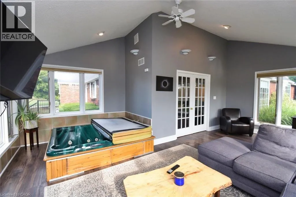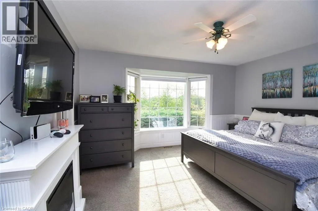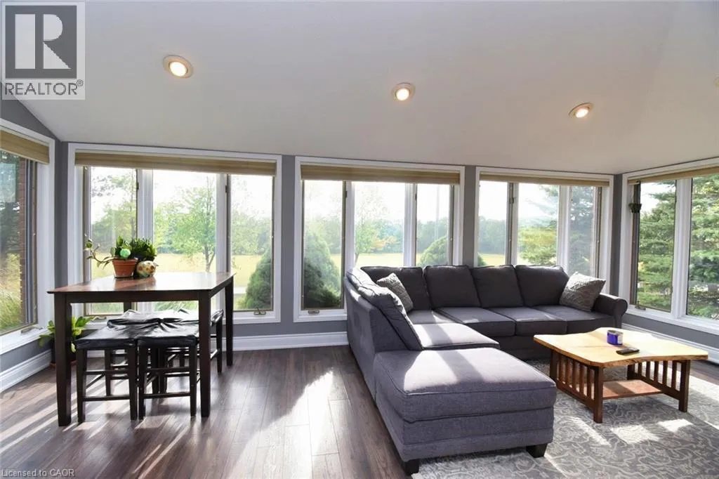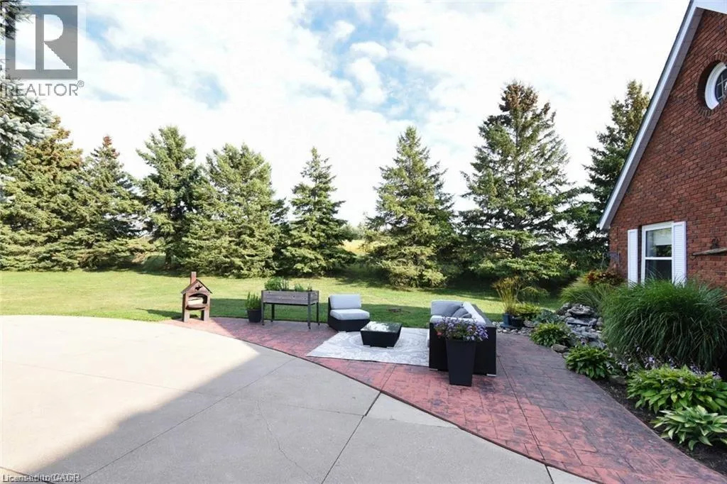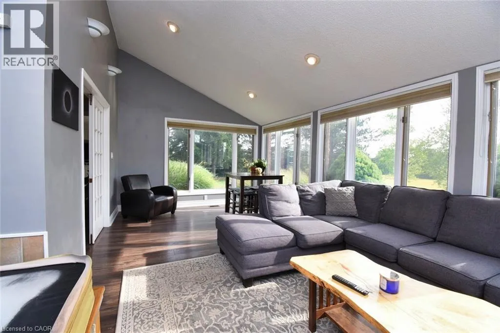 From Caledonia Hwy 54 just past Young Road on Left Beautifully maintained 3+1 bed, 4-bath home on almost 1 acre with panoramic views of the Grand River and surrounding fields. Located just 100m from walking trail, this rare property features two double garages on separate levels, offering incredible space for vehicles, storage, or workshop use. The main floor boasts an open-concept layout, ideal for family living and entertaining. The updated kitchen features quartz countertops, stainless steel appliances, and a large breakfast island. The adjacent dining room includes a charming brick fireplace, while the bright family room boasts custom built-in shelving and a media centre. French doors open to a stunning sunroom, featuring a hot tub for year round relaxation. Enjoy breathtaking sunsets from this serene and light filled space. Down the hall are 3 generously sized bedrooms, including a primary suite with 3 piece ensuite and walk-in closet. The lower level offers excellent granny/ nanny suite, or potential income generator with access to outside. A full kitchen, bath, bedroom, office, and large living/dining area. A spacious laundry room adds ample storage. Bonus features: newer roof (2023), new furnace (2025), climate-controlled basement, radiant-heated upper garage, 3000-gallon cistern, 200 & 100 amp electrical, wired security system and a lamp-lit driveway for beautiful evening ambiance. This one-of-a-kind property blends space, privacy, and flexibility. Ideal for families , hobbyists etc. A peaceful rural setting with river views.. (id:27476)