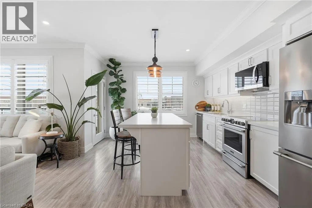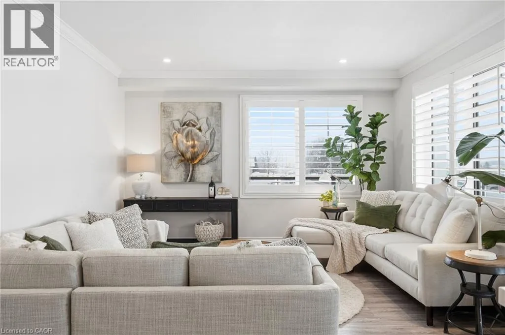 South on Highway 6/Upper James to Argyle St South, East on Haddington St Rarely offered corner unit in Harrison Flats. This bright 2-bedroom, 2-bath condo offers carefree living in one of Caledoniaâs most sought-after buildingsâideal for downsizers, professionals, and couples alike. The northwest-facing suite is filled with natural light and showcases beautiful afternoon sun and evening sunsets, enhanced by oversized windows throughout, all fitted with quality 4.5â shutters. Enjoy year-round use of the covered corner balconyâperfect for relaxing, reading, or taking in the vibrant community across the street, including the arena, events centre, library, park, and baseball diamond. The spacious primary bedroom features a 3-piece ensuite and two closets, while the generous second bedroom includes a walk-in closet. All closets are outfitted with California Closet organizers. Additional highlights include a full-size washer/dryer combo in a large in-suite laundry room with extra storage, two above-ground side-by-side parking spaces, and excellent building amenities such as a party room, common BBQ area, bike racks, and visitor parking. Conveniently located for commuters to Hamilton, Burlington, Toronto, Kitchener, and Niagara. Move in and enjoy elegant, low-maintenance living in a welcoming, established community. (id:27476)