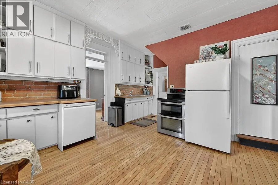 #6 Hwy into Caledonia, which turns into Argyle St. At NW Corner of Argyle St N and Orkney St W. Welcome to 149 Argyle St. N., a charming Victorian home filled with original character and period details, blended with everyday modern comforts. This spacious property features large principal rooms and tall ceilings and windows. The main level offers a generous eat-in kitchen, formal dining room, and living room with a double-sided gas fireplace and two impressive bay windows that bring in plenty of natural light. Thereâs also a bedroom with a 4-piece ensuite, a large second bedroom, mudroom with side entrance, and a 2-piece bath. The second floor has its own separate entrance and functions as a self-contained in-law suite. It includes a spacious living/dining area with walk-out to a balcony, an eat-in kitchen with ample cabinetry, a large bedroom, and a 4-piece bath with vaulted ceiling, clawfoot tub, skylight, and exposed beams. The suite also has its own washer and dryer. The laundry servicing the main floor is located in the unfinished basement. Outside, youâll find two separate paved driveways - providing 2 spaces for the 2nd floor and 3 spaces for the main floor, a large landscaped lot with custom fencing, a wraparound side/rear porch, separate front porch, a 10 x 10 shed with power and a 12 x 16 work shed, which has itâs own panel. An excellent opportunity for an owner-occupied business, multi-generational living, or owner/tenant setup. With some updating, it could easily be converted back into a spacious 5-bedroom family home. Great curb appeal and ideally located within walking distance to the Grand River, trails, schools, parks, and shopping. (id:27476)