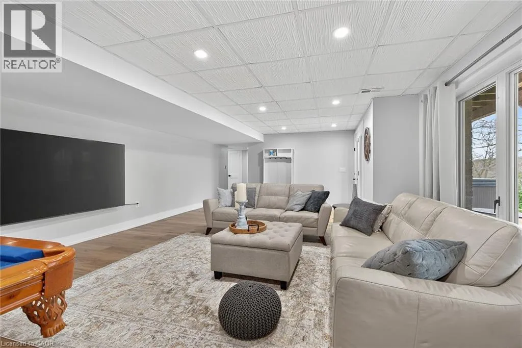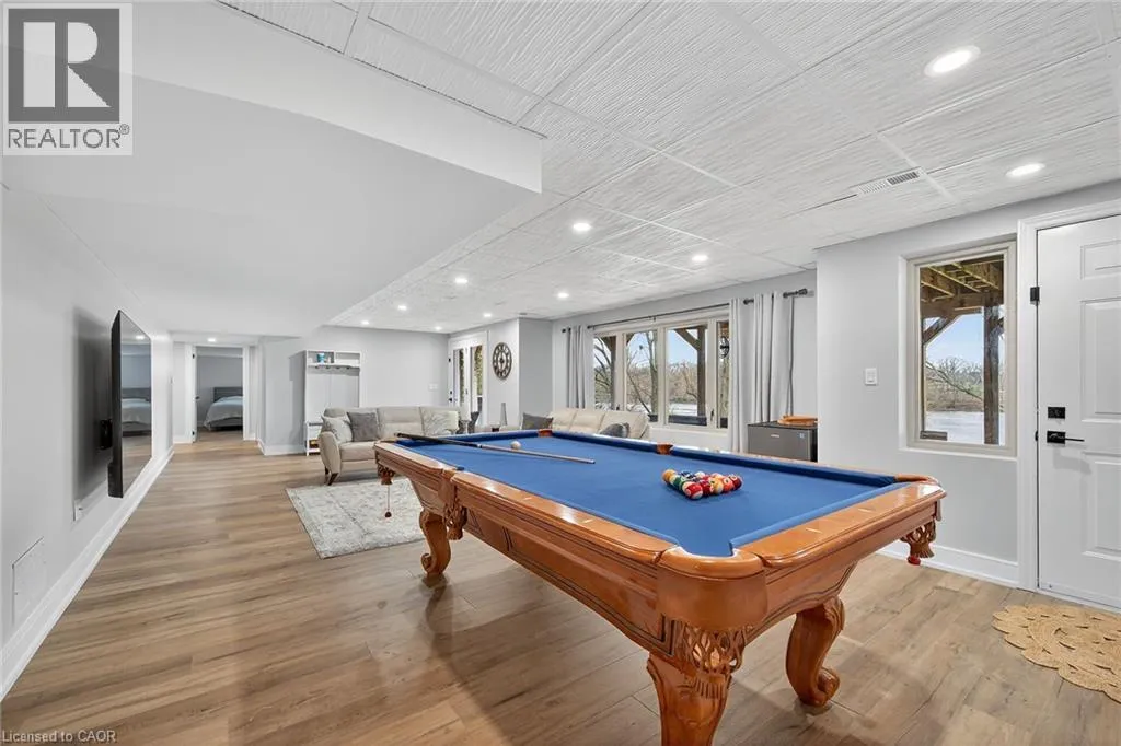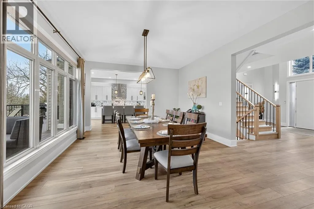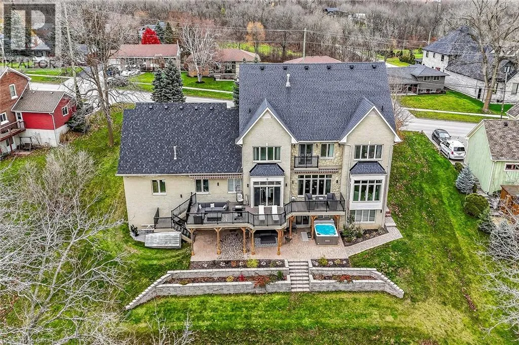 Argyle St. N to Caithness St. E. This stunning home backing onto the Grand River has been completely renovated from top to bottom! This beautiful home sits on a double lot with over 5000 sq ft of living space. Amazing curb appeal with a circular driveway big enough for 10 cars and an oversized double garage. A grand foyer welcomes you to the spacious main level with 10' ceilings. You will notice the amazing nature light from the front foyer window and a wall of windows along the back of the home. A cozy living room awaits you with a gas fireplace leading to a lovely dining room perfect for meals with family and friends and an amazingly large functional kitchen with cabinets galore and a 10' island. Patio doors from the kitchen open to an upper deck with stunning views of the Grand River, an expansive backyard with a firepit and a 30' dock, you'll will feel like you're on vacation everyday. The main level also includes an office/bedroom off the front foyer, a 2 piece bathroom, laundry room and automatic blinds on the front foyer window, living room and dining room windows. Moving up to the 2nd floor, you will find a gorgeous primary bedroom with a walk in closet, a spa like ensuite with a walk in shower and soaker tub, also 3 generous sized bedrooms and a 4 piece bathroom. All bedroom closets have closet organizers. The expansive lower level includes a large family room with pool table, 3 more bedrooms and a bright 3 piece bathroom. The lower level family room leads you to a covered patio with an 8 person Beachcomber hot tub, enjoy peaceful evenings star gazing and river views. In addition to the oversized double garage, there is a utility garage at the back of the house which is perfect for your riding lawnmower and anything other landscaping equipment. Country feels with all the amenities near by! Don't miss out on this wonderful family home! (id:27476)
