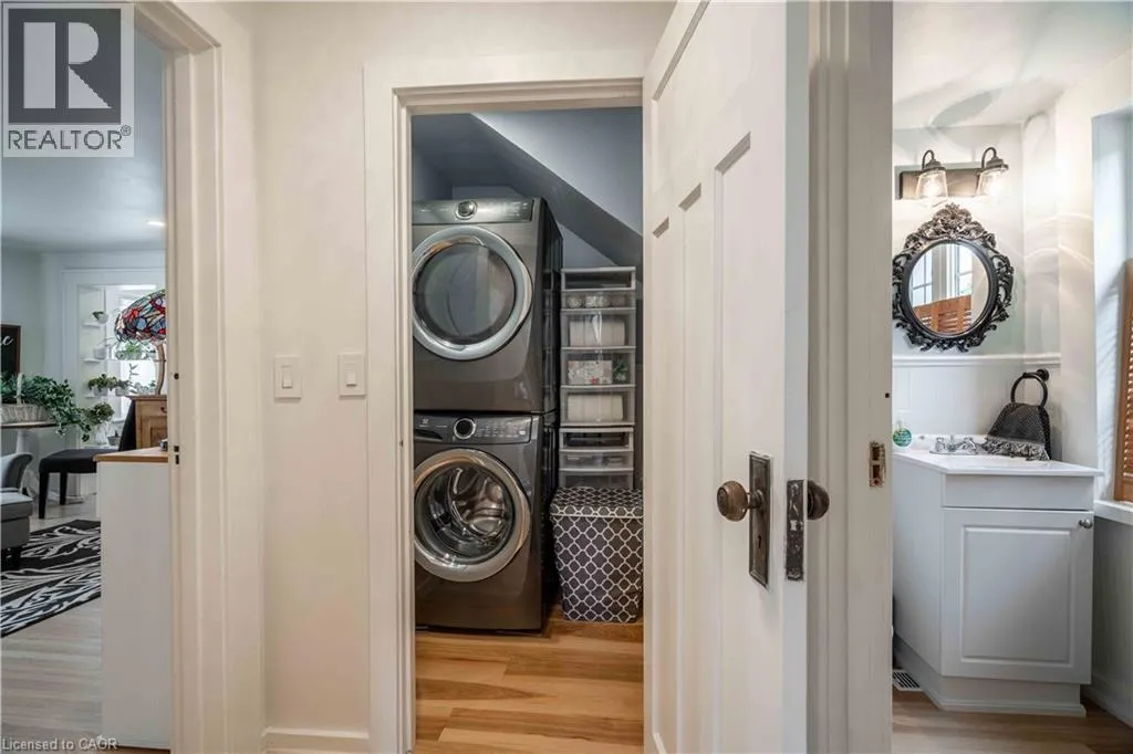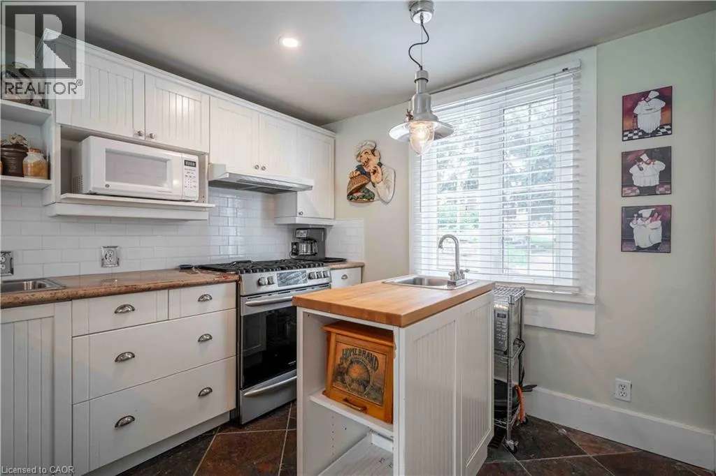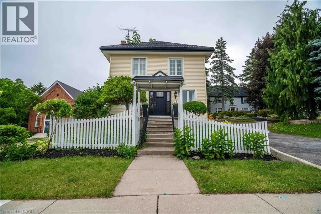 From Hwy # 6, take Argyle St North Here is your opportunity to own one of Caledoniaâs notable homes. Enjoy this lovely home is surrounded by gardens & shady green space. Until recently, it was also the location of The Proper Topper Bridal shop -undergoing a metamorphosis to become a lovely family home which can be used for a home-based business. The owners have thoughtfully transformed this home while respecting itâs past. Boasting large principal rooms, light-filled rooms embrace a modern esthetic with neutral colours & lovely restored floors and/or engineered wood floors (carpet-free home!). Main level boasts a chef style kitchen, updated bath & incredible living room anchored with a whitewashed brick fireplace & refinished hardwood. Main floor laundry with newer washer/dryer. (Laundry hook-ups also on second level.) Restored bonus room for office or playroom. 2nd floor can be accessed by one of two staircases & has 3 generous sized bedrooms & a loft plus renovated bath with clawfoot tub & fully tiled shower. The showstopper is a double sized master bedroom oasis with windows overseeing backyard with mature shade trees. A 3rd level is a unique family room or private office with beamed ceilings, skylight, wooden floors & windows affording a view towards the Grand River. Many improvements: upgrades to all bathrooms, most newer windows, dramatic entrance door with sidelights, new wide baseboards, subway tile backsplashes, new & restored flooring, new light fixtures & pot-lighting. Building upgrades: metal roof (2006), newer appliances, new sump pump & drainage system in basement, all owned furnace, water heater & AC (2021). Some windows (2010,2015);Siding, eaves, soffits (2010). You will appreciate that there are no popcorn ceilings here! Offering a place of calm in a busy world. Kick back on your cedar deck, walk to local grocery & restaurants. Stroll along the river walk or visit Jones Bakery. This home has it all! (id:27476)