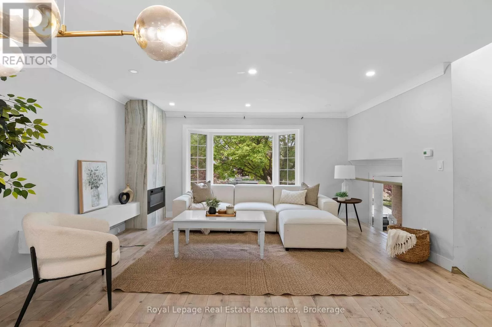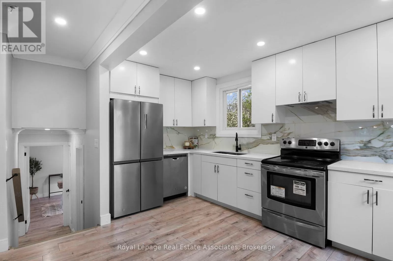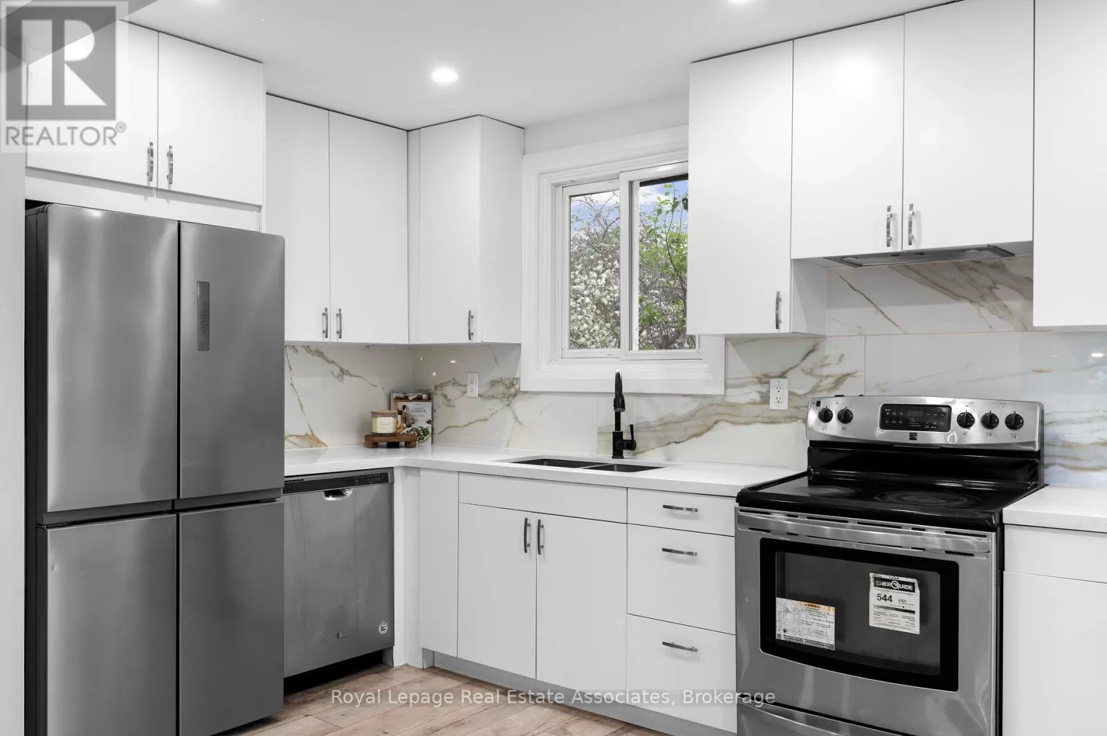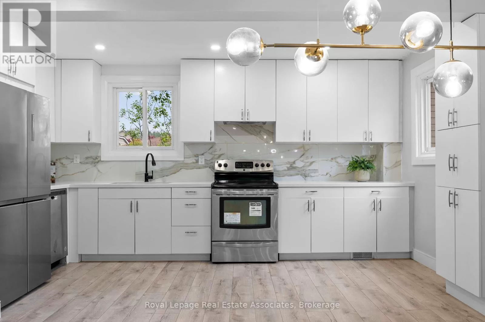 Industrial Rd / Dunbar Rd Welcome to 1236 Avonlea Road, a stunning, carpet-free 4-bedroom, 3-bath home in one of Cambridge's most sought-after areas! This bright and modern home features high-end laminate flooring throughout, an open-concept design, and an abundance of natural light from large windows. The custom kitchen is the heart of the home, showcasing stainless steel appliances, quartz countertops, and a trendy backsplash. The bathrooms offer sleek floating vanities and contemporary finishes, adding a touch of luxury throughout. Elegant crown moulding, upgraded trim, and loads of pot lights create a warm and sophisticated atmosphere. The living room features an electric fireplace with a custom floor-to-ceiling surround, a true focal point for relaxing and entertaining. A fully finished basement with a 3-piece bath adds even more functional living space. Step outside to a fully fenced backyard with mature trees and a garden shed perfect for outdoor enjoyment. Ideally located close to Hwy 401, shopping, schools, parks, and all amenities, this home offers the perfect blend of style, comfort, and convenience. A true must-see! Roof (2021) (id:27476)