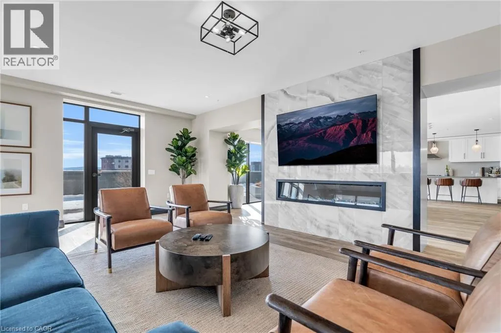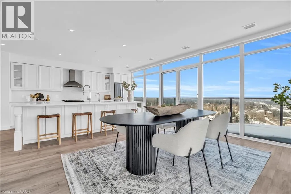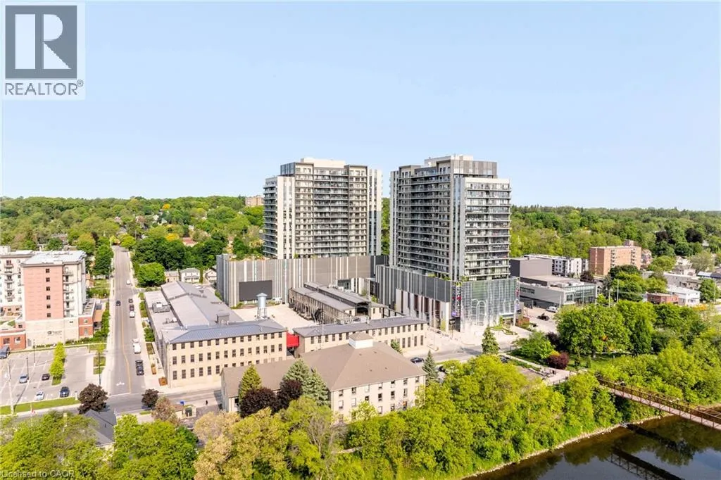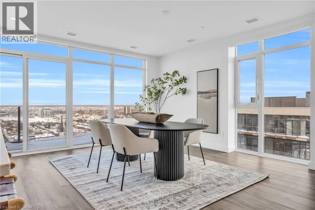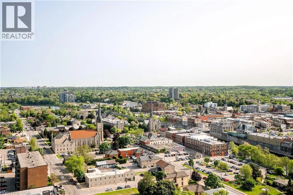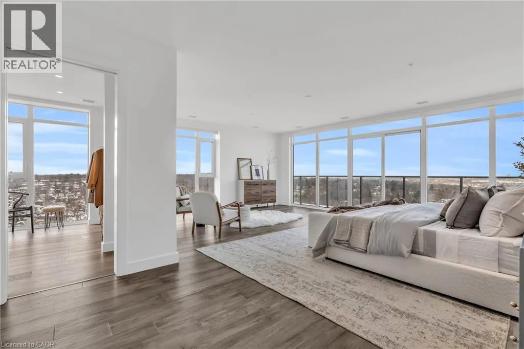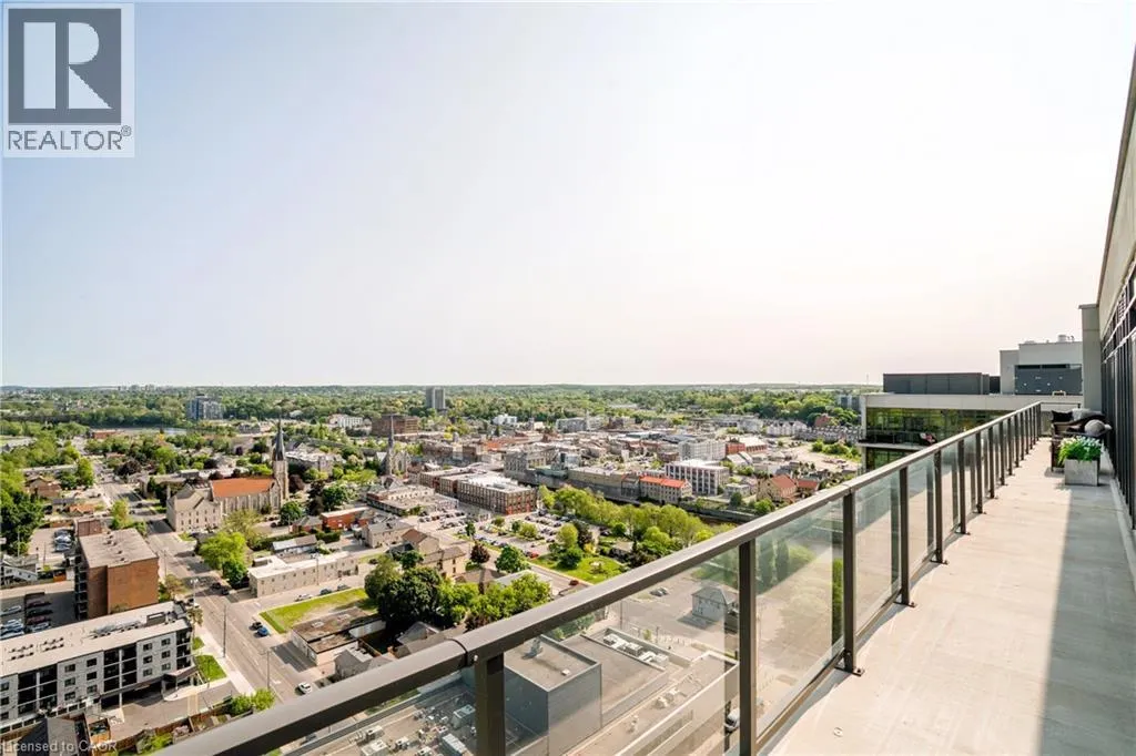 St. Andrews St to Glebe St Luxury Penthouse Living in the Heart of the Gaslight District! An extraordinary 2,300 sq. ft. residence created by seamlessly combining two expansive units. Spanning the entire side of the building, this one-of-a-kind three-bedroom, three-bathroom home offers breathtaking panoramic views of historic downtown Cambridge and the Grand River. Step into a grand foyer that opens into a sun-drenched, open-concept living space. Floor-to-ceiling windows bathe the home in natural light, while engineered hardwood floors add warmth and sophistication. The thoughtful layout includes pocket doors in every bedroom, maximizing both space and functionality. At the heart of the home is a chefs dream kitchen, fully upgraded with quartz countertops and backsplash, an oversized island, and premium finishes. Designed for both style and efficiency, this space is perfect for intimate dinners or lavish gatherings. The primary suite is a private retreat, complete with a spacious walk-in closet/dressing area with custom organizers and a large window. The spa-like ensuite boasts a walk-in glass shower and dual sinks, while sliding glass doors provide direct access to the penthouses expansive 100-ft. terrace. The second bedroom features floor-to-ceiling windows, a wall-to-wall closet, and its own private three-piece ensuite. A third generous bedroom currently configured as an office/den offers additional flexibility. This extraordinary residence also features a wraparound balcony accessible from every room, offering spectacular sunrise and sunset views over the city skyline and Grand River. Additional features include two underground parking spaces (one with an EV charging station), two private storage lockers, and access to state-of-the-art amenities: a rooftop terrace, private dining room, fitness center, yoga & Pilates studio, and an elegant lobby. (id:27476)