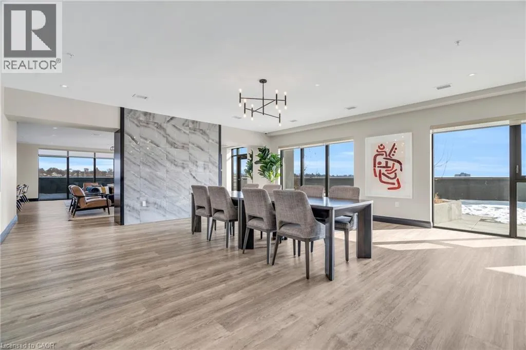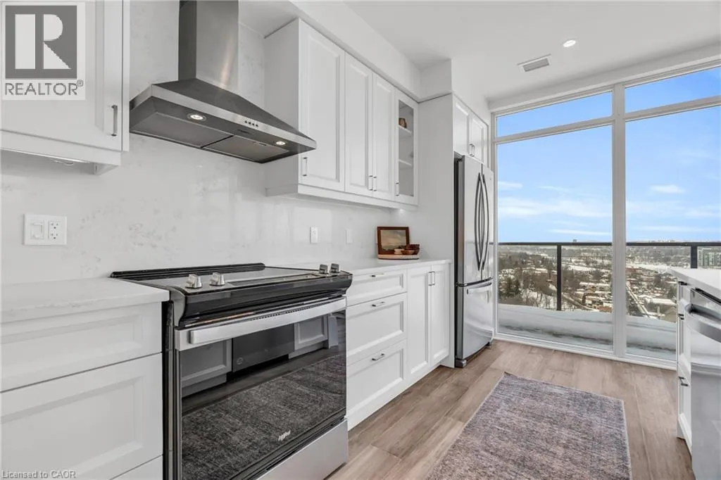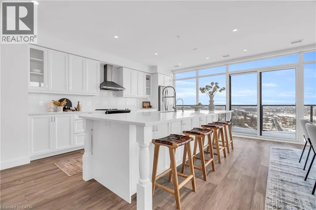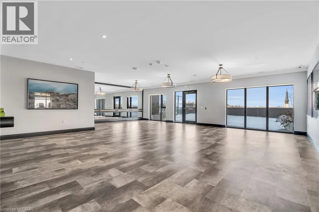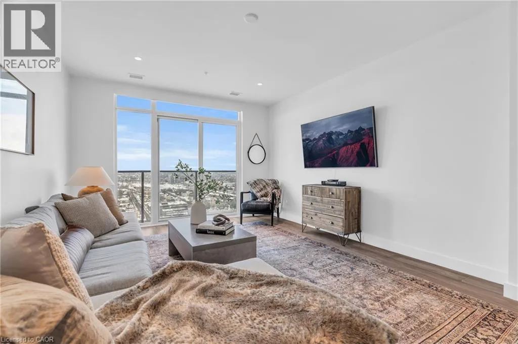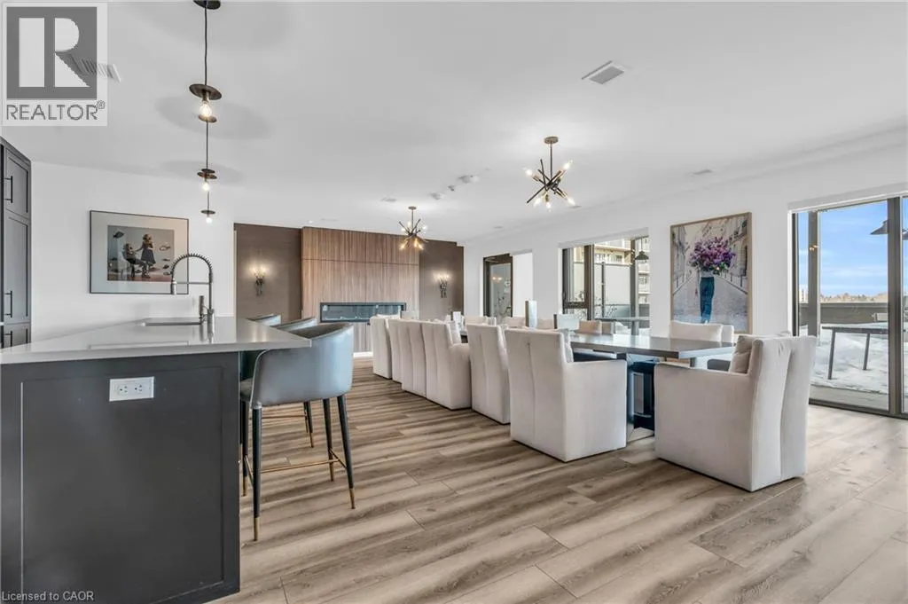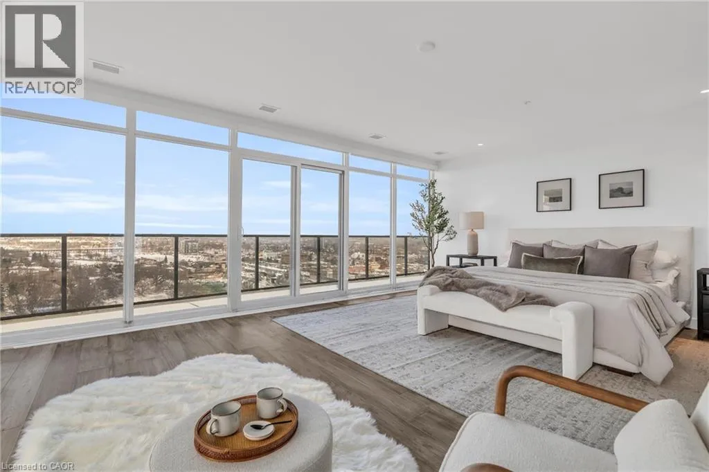 St. Andrews St to Glebe St Luxury Penthouse Living in the Heart of the Gaslight District! An extraordinary 2,300 sq. ft. residence created by seamlessly combining two expansive units. Spanning the entire side of the building, this one-of-a-kind three-bedroom, three-bathroom home offers breathtaking panoramic views of historic downtown Cambridge and the Grand River. Step into a grand foyer that opens into a sun-drenched, open-concept living space. Floor-to-ceiling windows bathe the home in natural light, while engineered hardwood floors add warmth and sophistication. The thoughtful layout includes pocket doors in every bedroom, maximizing both space and functionality. At the heart of the home is a chefs dream kitchen, fully upgraded with quartz countertops and backsplash, an oversized island, and premium finishes. Designed for both style and efficiency, this space is perfect for intimate dinners or lavish gatherings. The primary suite is a private retreat, complete with a spacious walk-in closet/dressing area with custom organizers and a large window. The spa-like ensuite boasts a walk-in glass shower and dual sinks, while sliding glass doors provide direct access to the penthouses expansive 100-ft. terrace. The second bedroom features floor-to-ceiling windows, a wall-to-wall closet, and its own private three-piece ensuite. A third generous bedroom currently configured as an office/den offers additional flexibility. This extraordinary residence also features a wraparound balcony accessible from every room, offering spectacular sunrise and sunset views over the city skyline and Grand River. Additional features include two underground parking spaces (one with an EV charging station), two private storage lockers, and access to state-of-the-art amenities: a rooftop terrace, private dining room, fitness center, yoga & Pilates studio, and an elegant lobby. (id:27476)