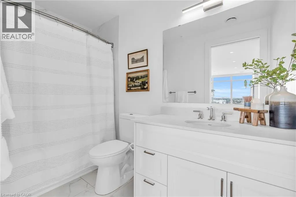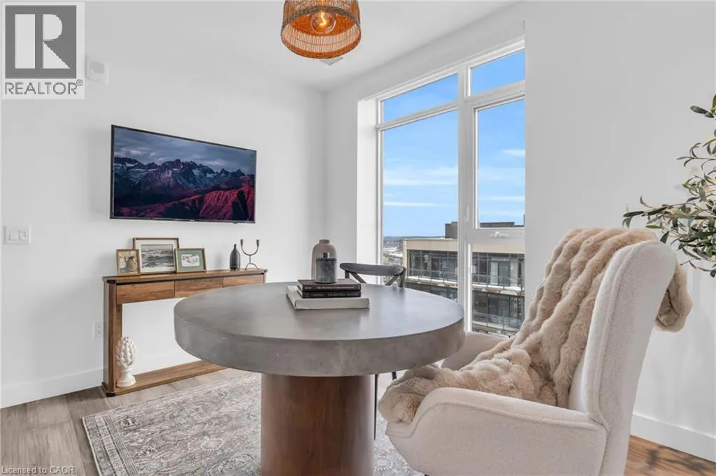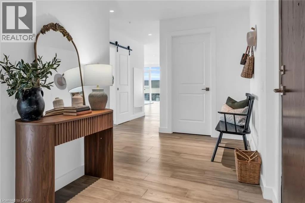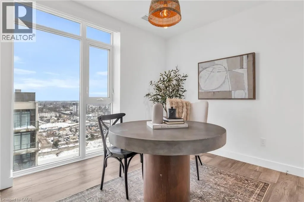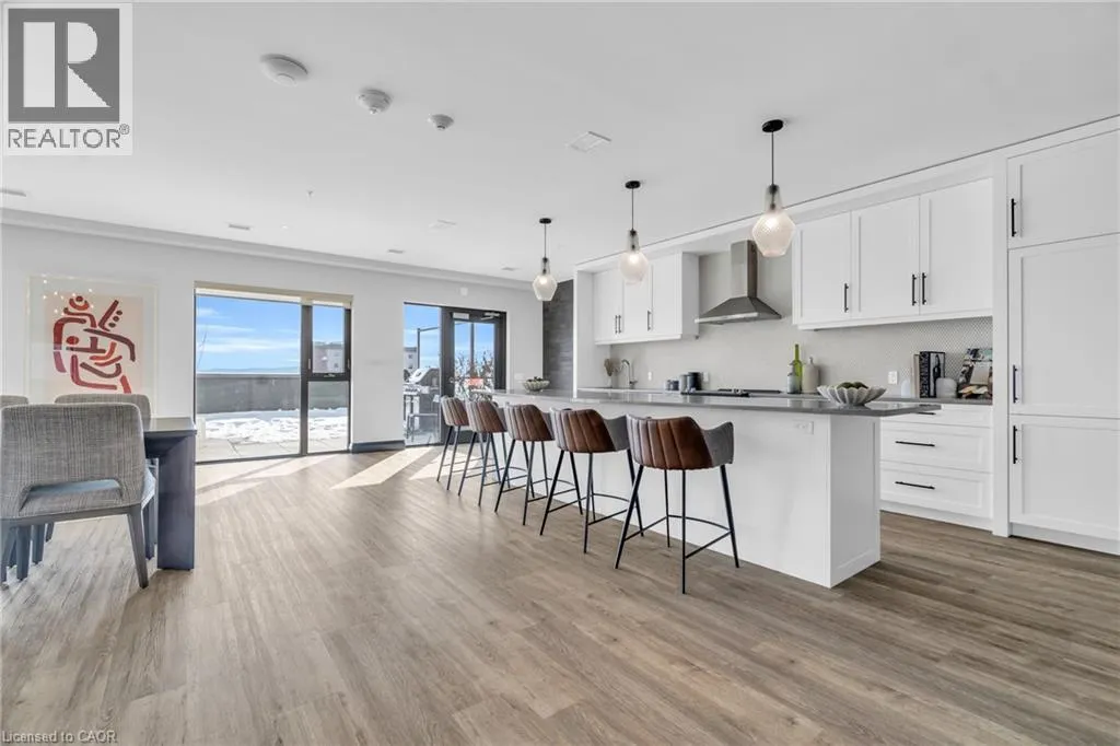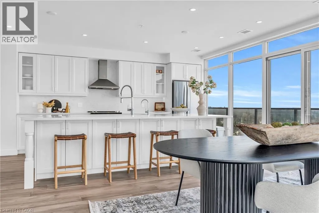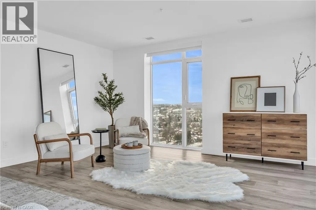 St. Andrews St to Glebe St Luxury Penthouse Living in the Heart of the Gaslight District! An extraordinary 2,300 sq. ft. residence created by seamlessly combining two expansive units. Spanning the entire side of the building, this one-of-a-kind three-bedroom, three-bathroom home offers breathtaking panoramic views of historic downtown Cambridge and the Grand River. Step into a grand foyer that opens into a sun-drenched, open-concept living space. Floor-to-ceiling windows bathe the home in natural light, while engineered hardwood floors add warmth and sophistication. The thoughtful layout includes pocket doors in every bedroom, maximizing both space and functionality. At the heart of the home is a chefs dream kitchen, fully upgraded with quartz countertops and backsplash, an oversized island, and premium finishes. Designed for both style and efficiency, this space is perfect for intimate dinners or lavish gatherings. The primary suite is a private retreat, complete with a spacious walk-in closet/dressing area with custom organizers and a large window. The spa-like ensuite boasts a walk-in glass shower and dual sinks, while sliding glass doors provide direct access to the penthouses expansive 100-ft. terrace. The second bedroom features floor-to-ceiling windows, a wall-to-wall closet, and its own private three-piece ensuite. A third generous bedroom currently configured as an office/den offers additional flexibility. This extraordinary residence also features a wraparound balcony accessible from every room, offering spectacular sunrise and sunset views over the city skyline and Grand River. Additional features include two underground parking spaces (one with an EV charging station), two private storage lockers, and access to state-of-the-art amenities: a rooftop terrace, private dining room, fitness center, yoga & Pilates studio, and an elegant lobby. (id:27476)