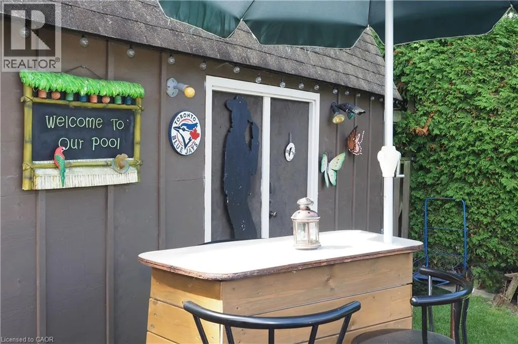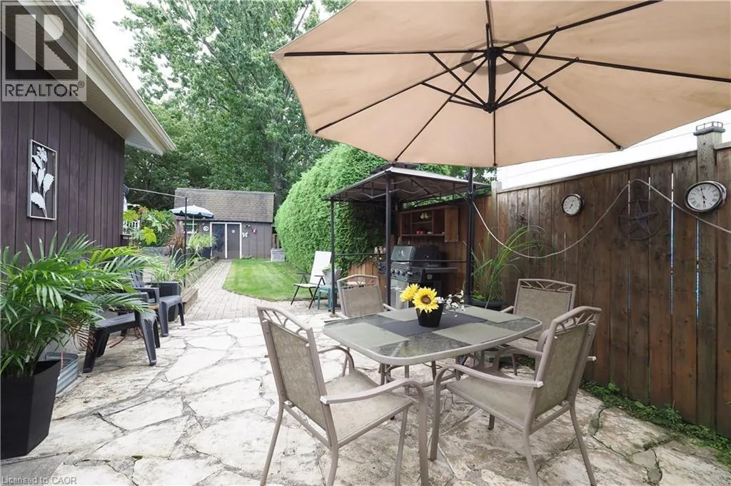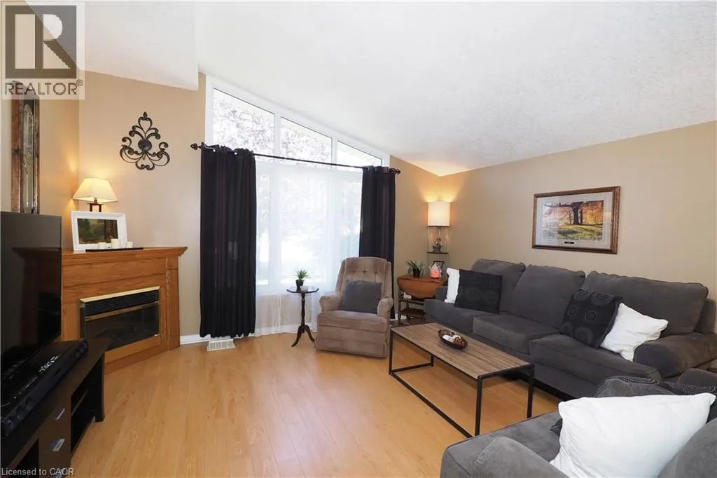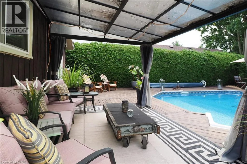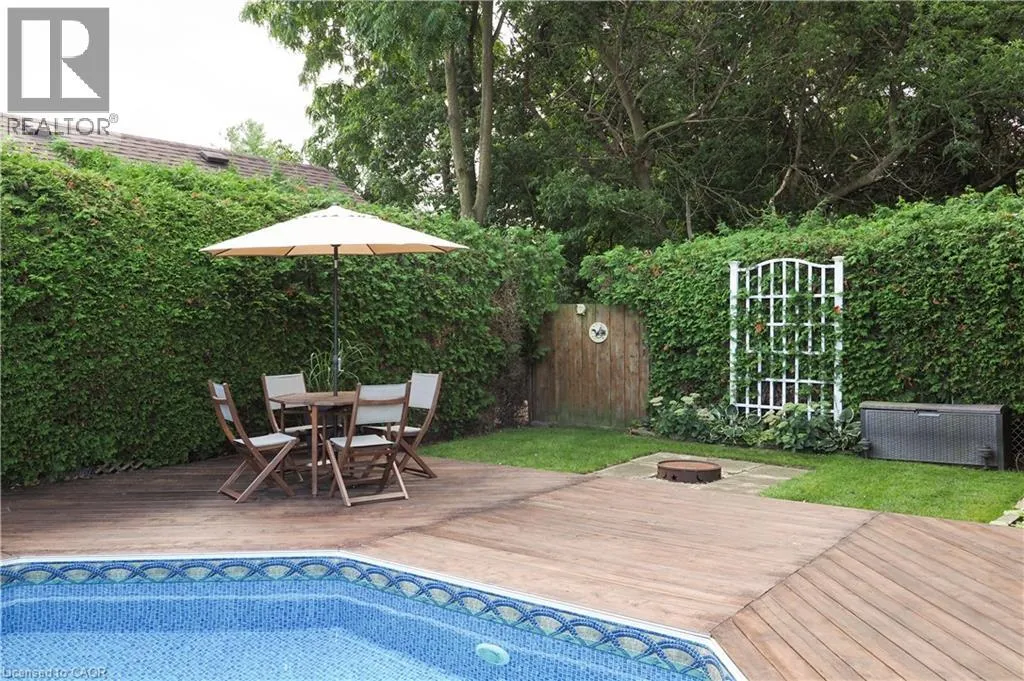 Guelph Ave to Milton AVe Welcome to this well-maintained bungalow located in the desirable Silver Heights neighbourhood of Hespeler, Cambridge. Ideally situated within walking distance to Silverheights Public School and St. Gabriel Catholic School, and just a short walk to Victoria Park, this home offers a convenient lifestyle with quick access to Guelph, Kitchener, and Highway 401. The exterior features beautiful landscaping, a carport that could easily be enclosed as a single garage, and paved parking for up to five vehicles. Inside, the main level offers a comfortable and practical layout. The eat-in kitchen is equipped with plenty of oak cabinetry, along with a fridge and stove and built in microwave, providing ample storage and workspace. The living room features an electric fireplace, laminate flooring, and a large picture window that fills the space with natural light. Three well-sized bedrooms complete the main floor, with the primary bedroom offering patio door access to the rear yardâperfect for enjoying your morning coffee outdoors. The finished lower level provides additional living space with a spacious recreation room, gas fireplace, and bar areaâideal for entertaining or relaxing with family and friends. A 3-piece bathroom and a bonus room offer flexible options for a guest room, bedroom, office, gym, or hobby space. The private backyard is deep and thoughtfully designed for both relaxation and enjoyment. It includes a heated sunken onground pool with a surrounding deck, a flagstone patio, a fish pond with waterfall, and two large storage sheds, all framed by mature landscaping and fencing for privacy. The gas furnace and central air are about 1 year old so that is something you don't have to budget for. This property is a wonderful combination of comfort, space, and location. Donât miss your opportunity to make this lovely home yoursâbook your private showing today. (id:27476)