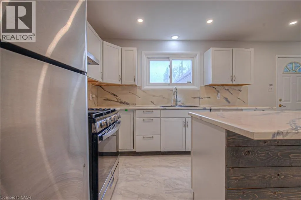 MAPLE GROVE RD - FOUNTAIN ST N INCREDIBLE LOCATION. DUPLEX POTENTIAL - SEPERATE ENTRANCE ALREADY HERE. 118 ft X 150 ft LOT. 2 DRIVEWAYS. Plenty of room for your boats, trailers and toys. Endless potential in this spacious 2-bedroom with potential for 5, 3-bathroom home located in the heart of Cambridge! Situated on a large lot with separate driveways and parking for up to 6 vehicles, this property offers incredible duplex potential with a fully separate basement apartment. Both units offer their own kitchen space, living rooms and laundry! The main level offers 3 bedrooms and 2 bathrooms, the living space offers a gas fireplace. The basement unit offers a large living space, 2 bathrooms, a den, and large rec room, which can easily be converted into 3 bedrooms. Whether you're looking for a multi-generational living setup or an investment opportunity, this home has it all. The large back space can be used for a workshop for the every day handyman. The large backyard spaces offer potential for kids play areas, sheds and more! Centrally located with easy access to Highway 401 and Highway 8, and just minutes from Kitchener, Waterloo, and Guelph. Recent updates include a new roof (2020). Donât miss this versatile and well-located property! (id:27476)