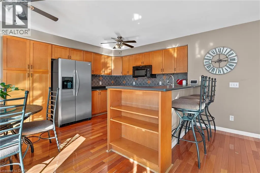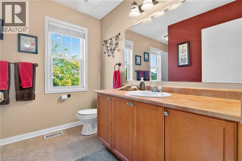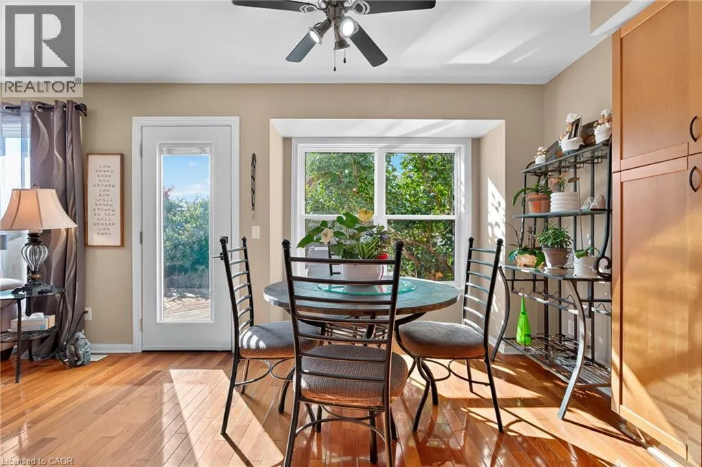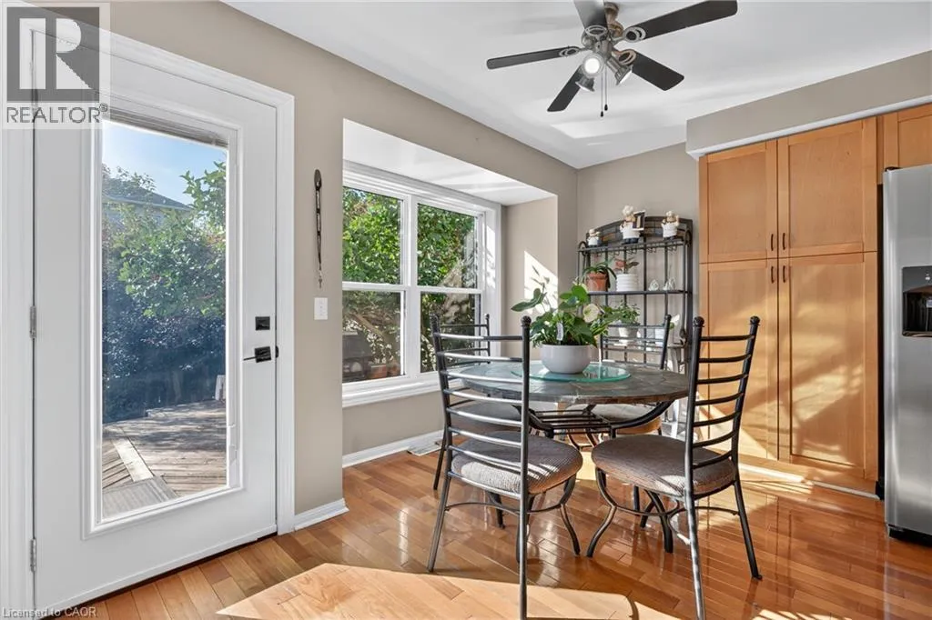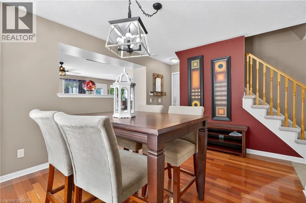 From Townline RD, take Coulthard Blvd to Arthur Fach Drive to Baggs Crescent The perfect layout for family life and entertaining! This beautiful Cambridge home features a spacious eat-in kitchen that flows seamlessly into the family room. Both spaces offer direct access to a large, private deck and backyard â making indoor/outdoor living a breeze. Picture hosting BBQs, watching the kids play, and relaxing in your own private yard. Plus a separate formal dining room. From the moment you walk in, youâll notice the thoughtful layout â a large front closet for shoes and coats, a convenient 2-piece bathroom, and inside entry from the single-car garage. Upstairs, the primary bedroom is your retreat, complete with a walk-in closet, soaker tub, and separate shower. The two additional bedrooms share a connecting bathroom, and the second-floor laundry makes life that much easier. Enjoy peace of mind with a new roof (2020), upgraded A/C (2022), patio door and rear windows (2022), plus new vinyl and aluminum board-and-batten detailing on the back northwest corner (2022). Located just minutes from Hwy 401 & Townline, this home is ideal for commuters and close to schools, shopping, golf courses, parks, arenas, grocery stores, and the mall â everything you need right at your fingertips. Donât miss this one â it truly has it all! (id:27476)