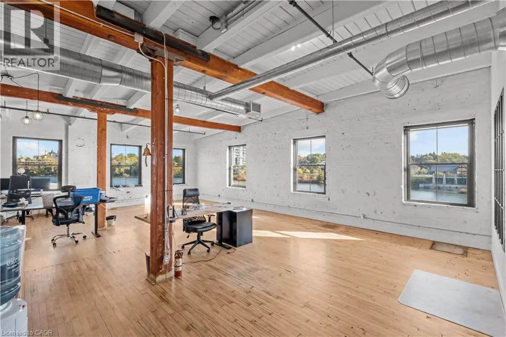 North of Park Hill Road and George Street Bright, open loft office located on the Grand River, across from the Cambridge Mill. Features ample natural light, views of the Grand River, easy access to walking trails and ample parking. Just 10 minutes from Highway 401 and steps from downtown amenities. Suite comes with access to a shared kitchen. Soon to open Willibald Pizza is located on the ground floor; ideal for lunch and treating your staff or clients. Join the growing community of Downtown Galt. (id:27476)