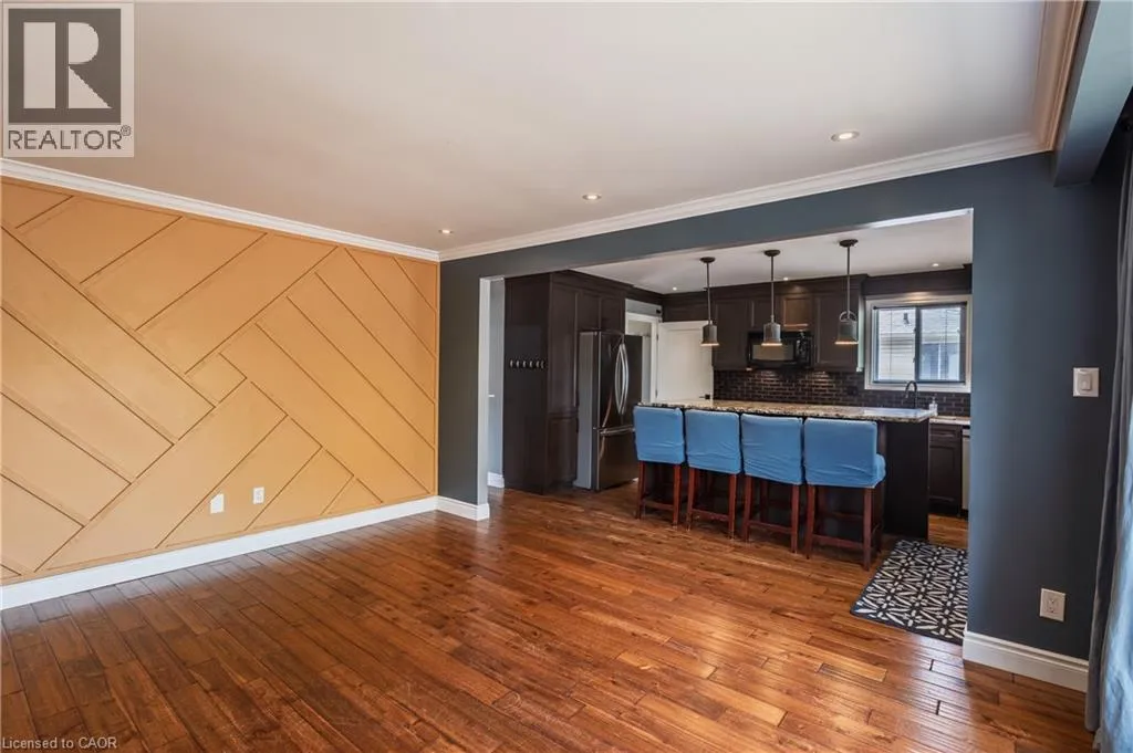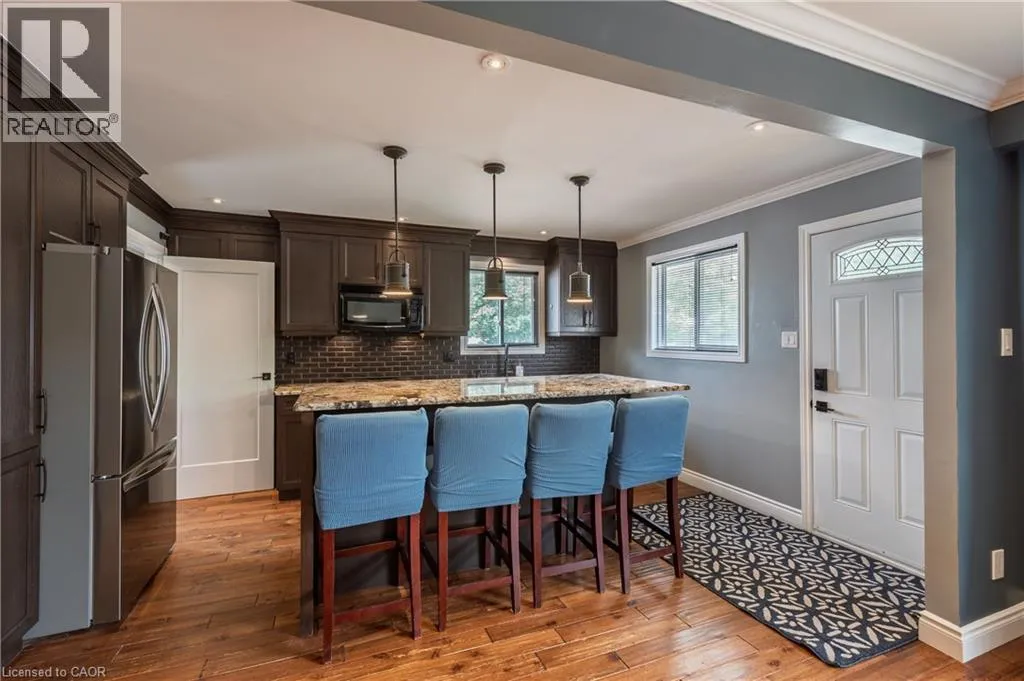 Fisher Mills Rd to Fearnwood St Welcome to this beautifully updated 3-bedroom, 2-bathroom bungalow in the highly sought-after Hespeler community, offering the perfect blend of charm, functionality, and location. Ideally situated with easy access to Highway 401, and just steps from picturesque walking trails, parks, shops, restaurants, public transit, and moreâthis home truly offers convenience and lifestyle. This solid bungalow showcases fantastic curb appeal with a custom-built privacy screen, a lush perennial garden, and a nearly-new front porch. The 20' x 30' detached workshop is a rare findâfully equipped with heat, hydro, and a newer roof and eaves (2021)âideal for hobbyists, a home business, or extra storage. Inside, the home has been professionally updated and freshly painted, offering a bright and inviting open-concept layout. The main level features choice finishes, including crown moulding, acacia hardwood flooring, and LED pot lights throughout the kitchen, living area, and hallway. The heart of the home is a stunning custom oak and granite kitchen complete with a grand bar-height island, rollaway bamboo workspace, and generous storageâperfect for entertaining or everyday living. The updated bathrooms offer modern touches and style. The mostly finished basement includes a bedroom, second kitchen, and family roomâideal for an in-law suite, multi-generational living, or a teen retreat. This turn-key home is perfect for families, down-sizers, or investors looking for a move-in-ready property with exceptional value and versatility. Don't miss your chance. (id:27476)