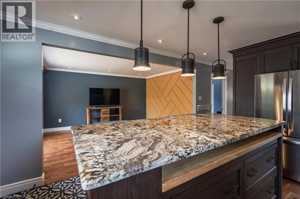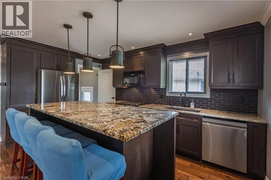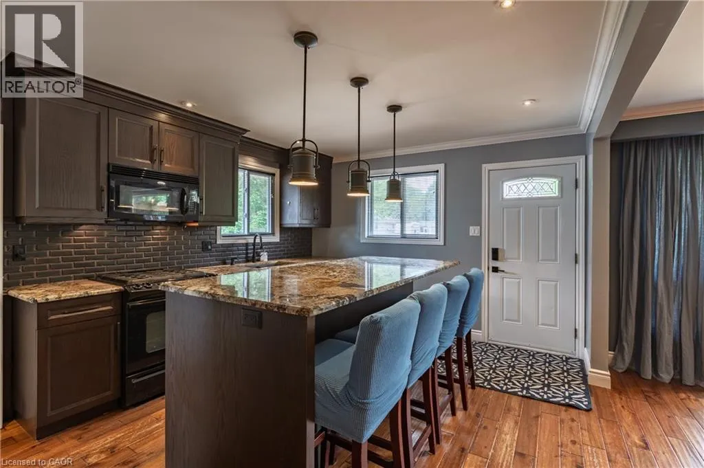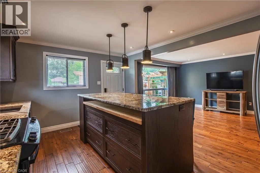 Fisher Mills Rd to Fearnwood St Welcome to this beautifully updated 3 +1 bedroom, 2-bathroom bungalow in the highly sought-after Hespeler community, offering the perfect blend of charm, functionality, and location. Ideally situated with easy access to Highway 401, and just steps from picturesque walking trails, parks, shops, restaurants, public transit, and moreâthis home truly offers convenience and lifestyle. This solid bungalow showcases fantastic curb appeal with a custom-built privacy screen, a lush perennial garden, and a nearly-new front porch. The 20' x 30' detached workshop is a rare findâfully equipped with heat, hydro, and a newer roof and eaves (2021)âideal for hobbyists, a home business, or extra storage. Inside, the home has been professionally updated and freshly painted, offering a bright and inviting open-concept layout. The main level features choice finishes, including crown moulding, acacia hardwood flooring, and LED pot lights throughout the kitchen, living area, and hallway. The heart of the home is a stunning custom oak and granite kitchen complete with a grand bar-height island, rollaway bamboo workspace, and generous storageâperfect for entertaining or everyday living. The updated bathrooms offer modern touches and style. The finished basement includes a bedroom, SECOND KITCHEN, and family roomâideal for an IN-LAW SUITE, MULTI-GENERATIONAL LIVING, or a teen retreat. This turn-key home is perfect for families, down-sizers, or investors looking for a move-in-ready property with (id:27476)
