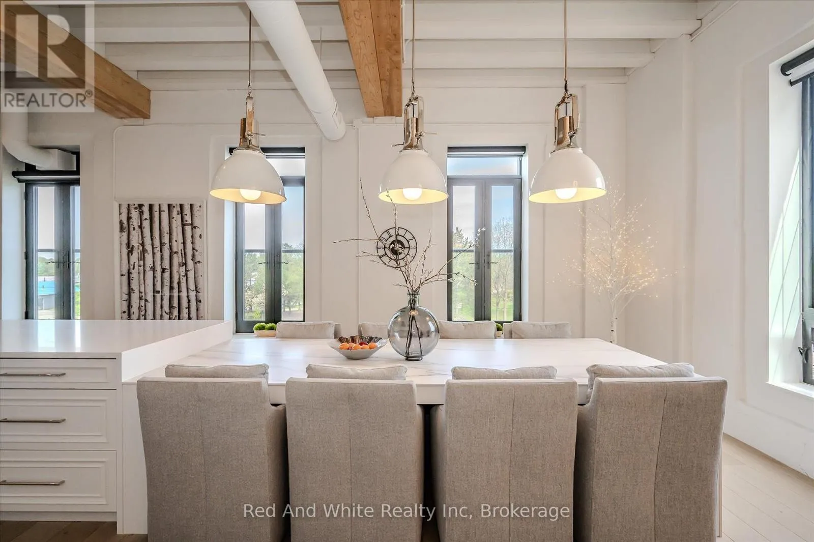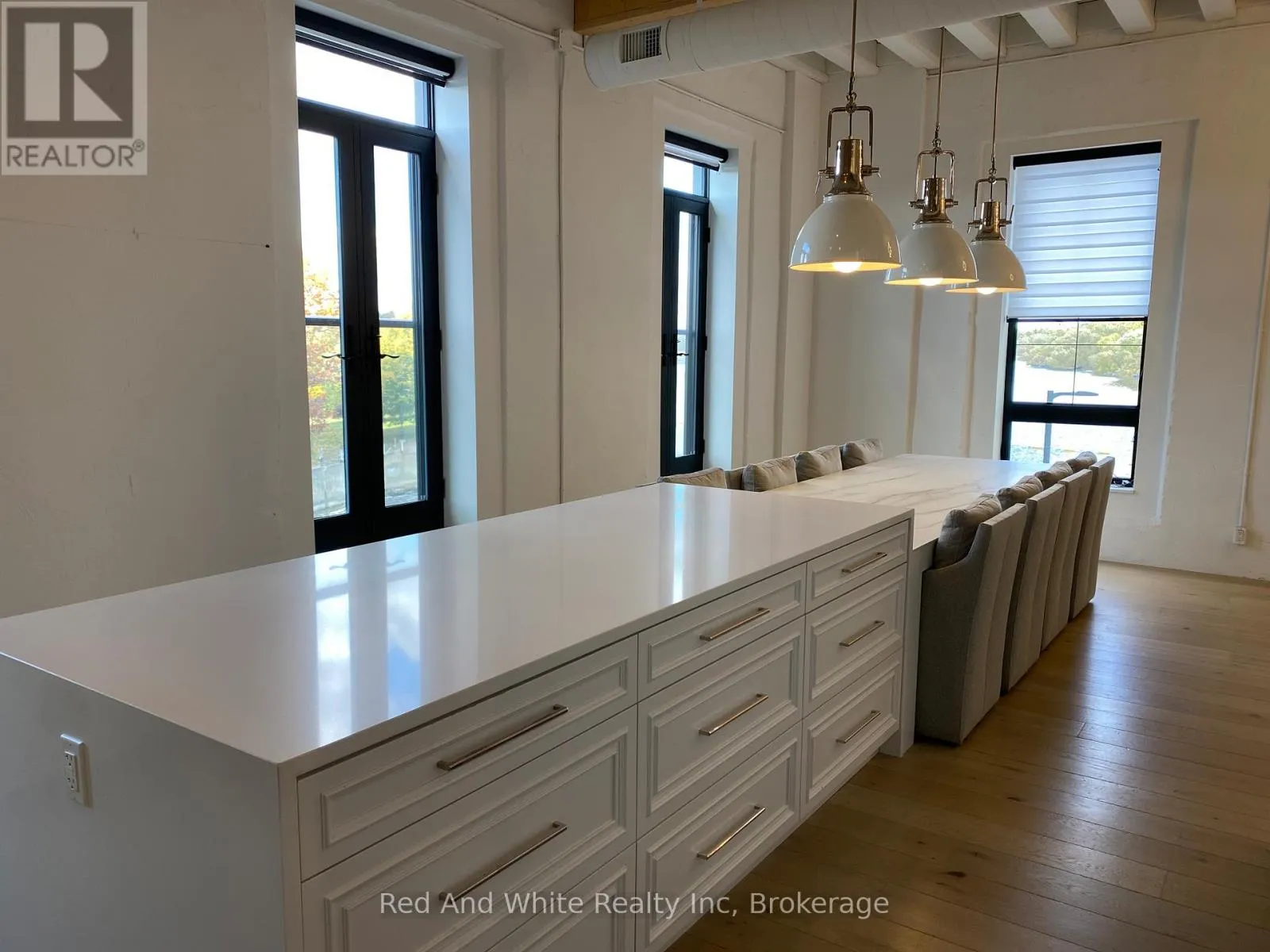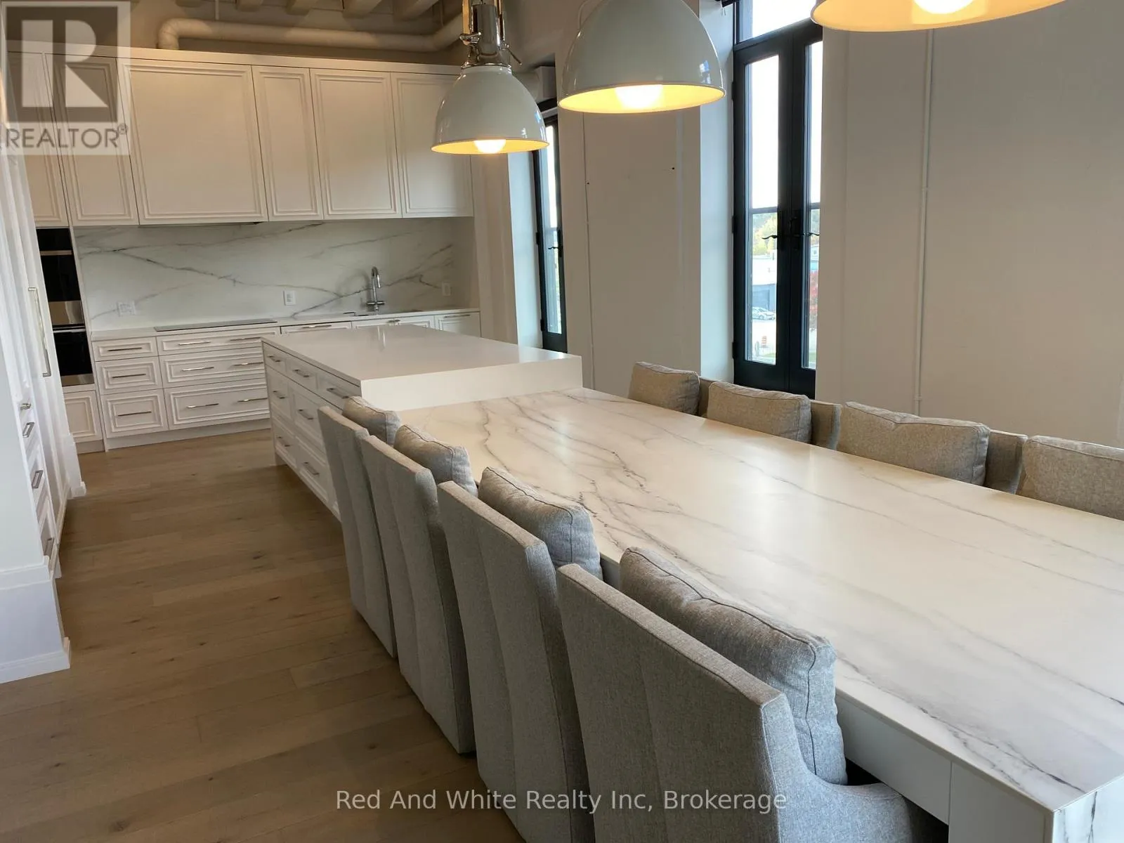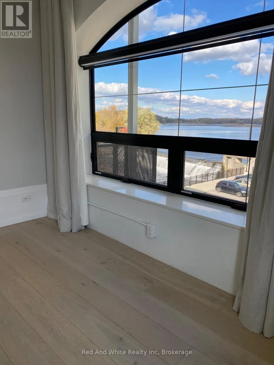 Cross Streets: Guelph Ave. South, on left before Queen Street Intersection. ** Directions: 401 from Guelph, turn right on Townline Rd, left on River road it turns into Queen Street turn right on to Guelph Ave, Riverbank Lofts on right. Welcome to Riverbank Lofts, a boutique historic stone conversion on the Speed River in the heart of Hespeler Village. This rare corner unit offers luxury with 12' ceilings, exposed beams, and oversized windows showcasing river, pond and waterfall views. Featuring 2 bedrooms with private ensuites, a powder room, and a show-stopping 18' island kitchen with built-in appliances, servery, and pantry. High-end finishes include European white oak flooring, heated floors in baths and laundry, custom built-ins, automatic blinds, and designer lighting. One of only three units with a private river-view balcony and a 2-car garage. Enjoy amenities like a fitness centre, common lounges, bike storage, and direct access to trails and the river. Steps to shops, restaurants, and cafes, with easy access to Hwy 401-this is elevated loft living in one of Cambridge's most desirable locations. Virtual tour and some photos are staged. (id:27476)