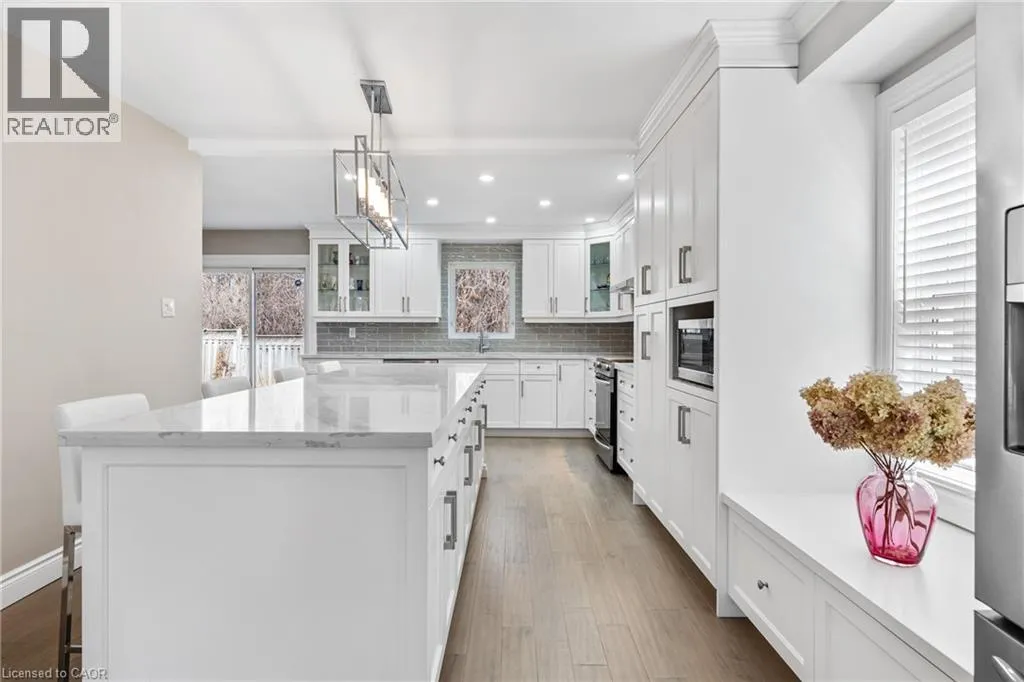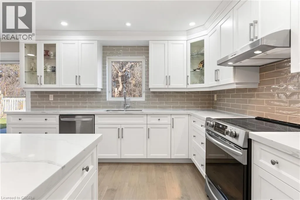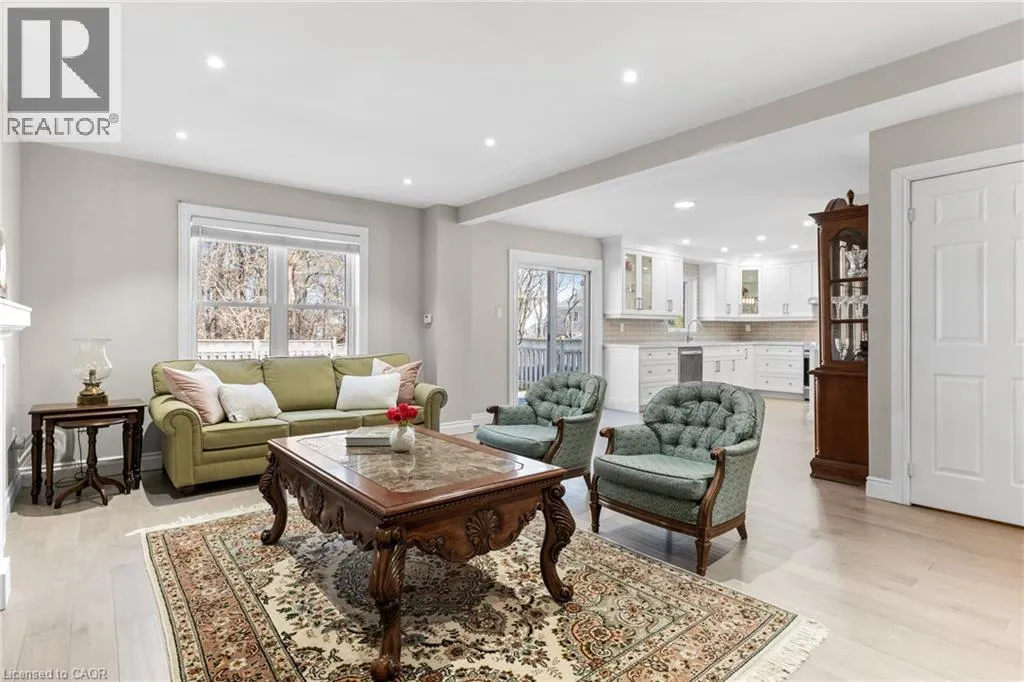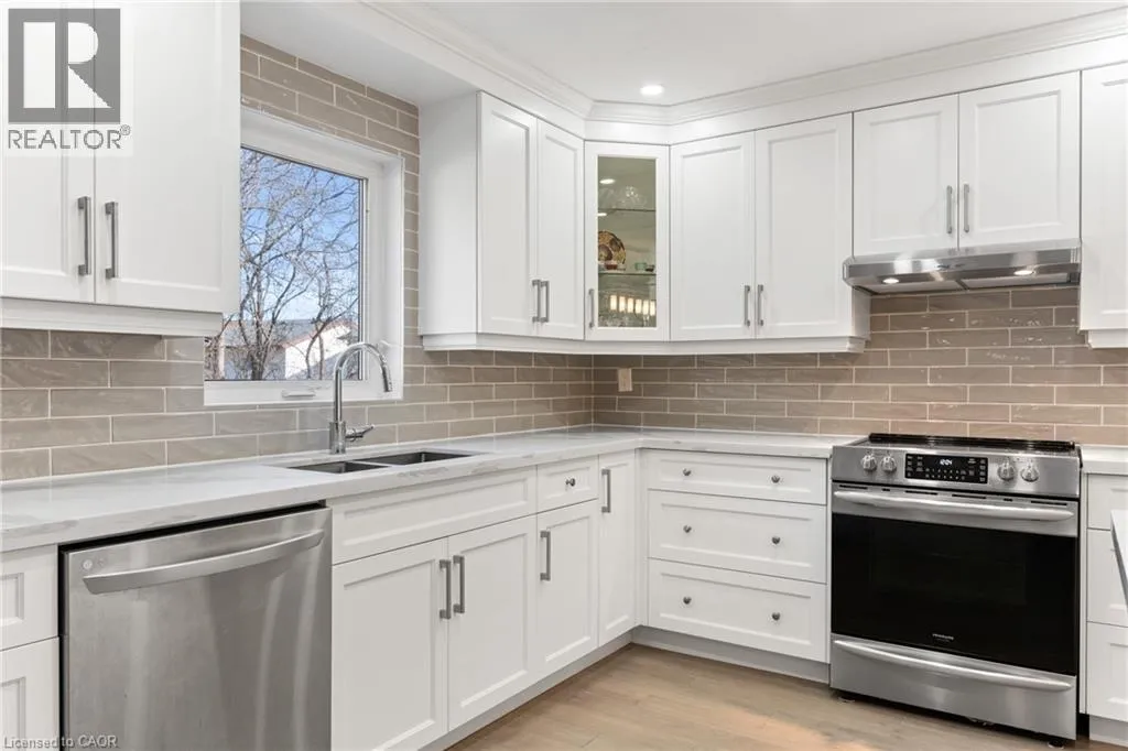 Myers Rd to Lisbon Pines to Santa maria Drive With almost 4ooo sqft of usable space, you will have plenty of room for the entire family. This home has had an amazing transformation that was completed in 2022 with every detail on point. As soon as you enter the front door you will quickly be impressed. On the main floor there is a powder room, laundry with entry to the garage, a door to the side yard and an office space which could also be used as a guest bedroom. Now the show stopper, the rest of the main floor is open concept! There are no walls between the family room, kitchen and dinning room. The kitchen was custom designed by Barzotti. Beautifully crafted and includes a giant 10-foot island that easily sits 6 people, quartz counter tops, stainless-steel appliances. Upstairs: Massive primary bedroom with ensuite (soaker tub, glass shower, double sinks), a large walk-in closet, 3 more large bedrooms and a full washroom. Downstairs: two bonus rooms, rec room, kitchenette and full washroom, large storage room and cold room. Backyard: gorgeous stone patio approximately 560 sqft (2023), and a shed. Private yard with no back neighbors, a gate at the back fence to take walks through the forest which leads to Santa Maria Park. Great location. Close to schools, shopping, parks, river trails, and quick access to 401 or 403. (id:27476)