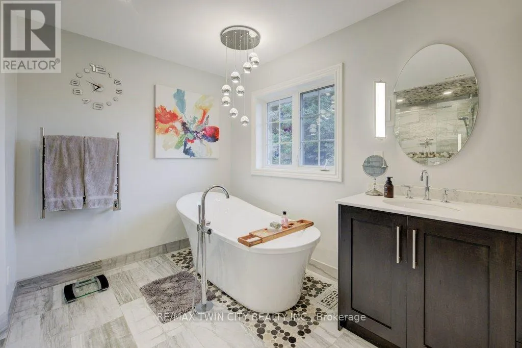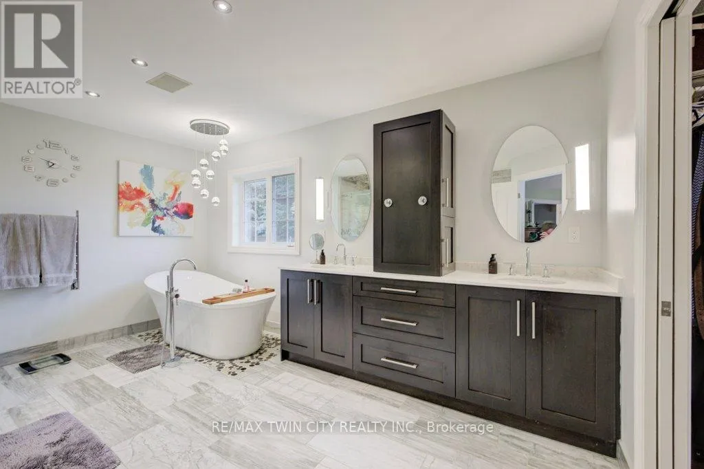 Cross Streets: Fountain. ** Directions: 401, Fountain to Dickie Settlement. This stunning stone home, nestled on a mature treed lot in Cambridge, is made for life's biggest moments. Step through the grand double doors into a welcoming foyer with soaring ceilings and natural light pouring in-you feel it right away: there's room to breathe here. The main floor flows effortlessly for everyday living or hosting everyone you love. A spacious kitchen and breakfast nook open onto a massive deck with a fire pit, BBQ zone, and a hot tub ready for starry nights. Morning coffee, summer dinners, late-night laughs-this backyard is ready for it all. Inside, there's space for every generation. Multiple family rooms let everyone spread out. A bright office gives you a quiet place to work. Downstairs, the finished basement offers a rec room, bar, gym, bedroom, and bath-perfect for teens, in-laws, or overnight guests. Upstairs, the primary suite is your private retreat with big windows, a walk-in closet, and a spa bath with a soaking tub that's perfect for winding down. With over 5,000 sq.?ft. of finished living space, there's room for big family dinners, holiday sleepovers, and cozy Sundays at home. The double garage and spacious driveway make parking easy. When it's time to get out, Whistle Bear Golf Club is just minutes away for your Sunday tee time, and quick access to Hwy 401 keeps you connected to KW, Guelph, and the GTA. This is where families grow, friends gather, and memories last. Book your tour-this one won't wait. (id:27476)