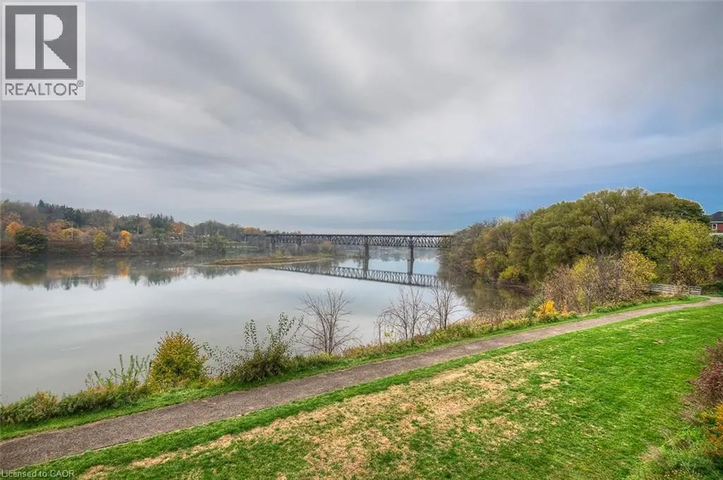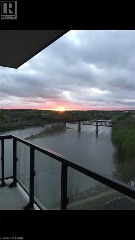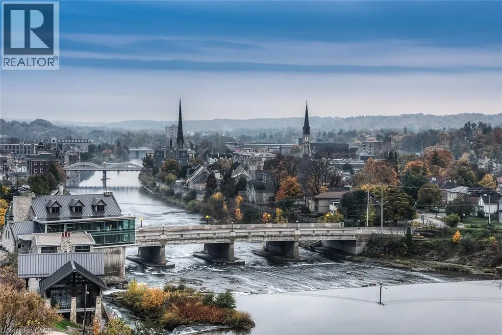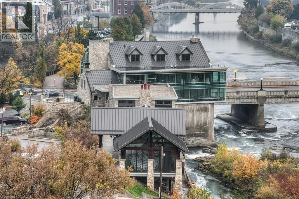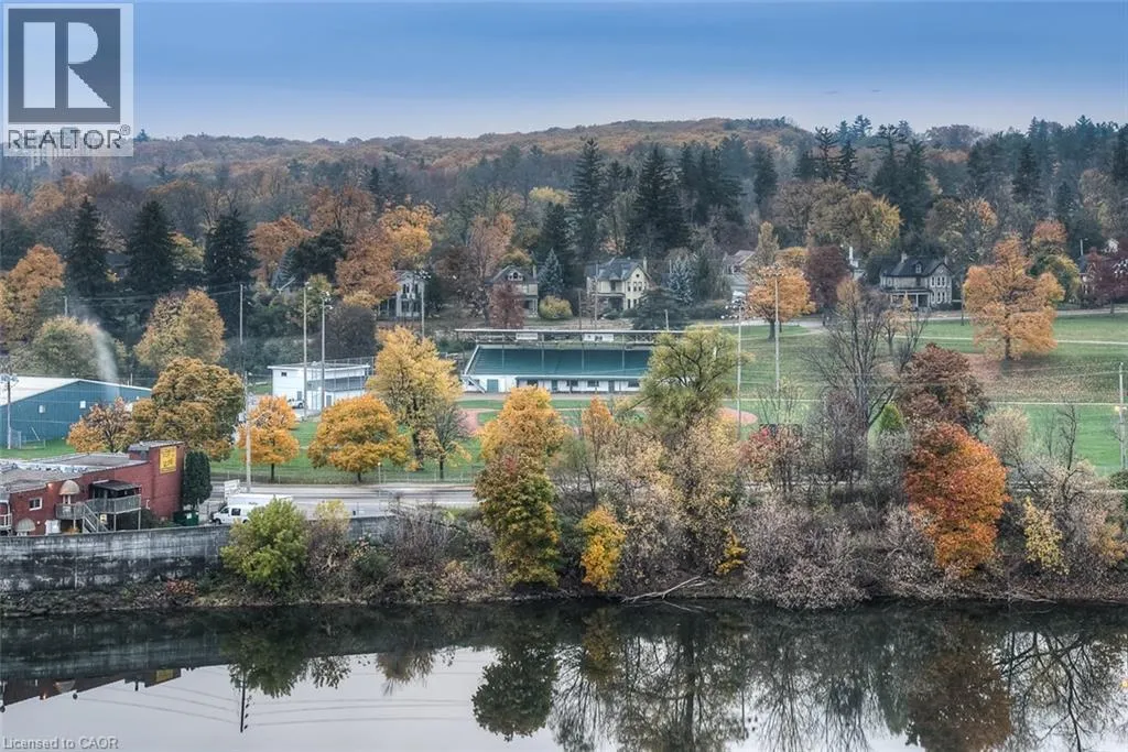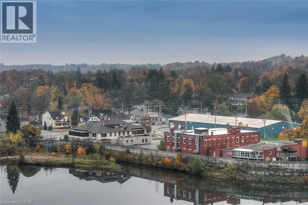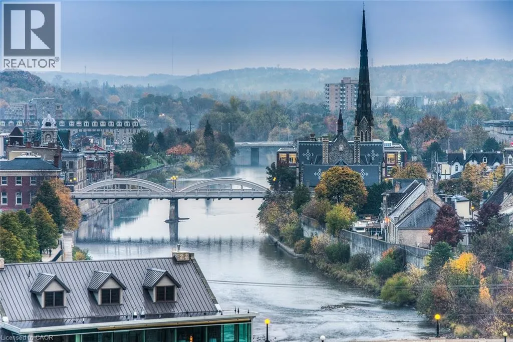 Ainslie St N and Water St N This Stunning 1 bed 1 bath corner end unit offers stunning picturesque views of the Grand River from the 105sq.ft balcony. Additional large airy windows also give you views of the gardens and street, this unit is really a must see to appreciate it. This unit offers laminate flooring, granite countertops, SS appliances and separate storage/laundry room that contains a stackable washer and dryer leaving plenty of room for your storage needs. 2 seperate owned parking spots come with this unit, 1 underground and 1 at the front of the building. A Storage locker, gym and party room round out the added features included. You will be steps away from Shopping, restaurants, trails and the Hamilton Family Theater. (id:27476)