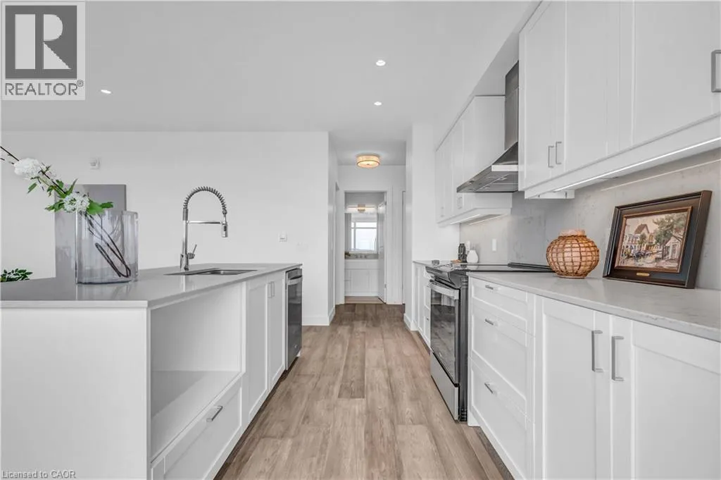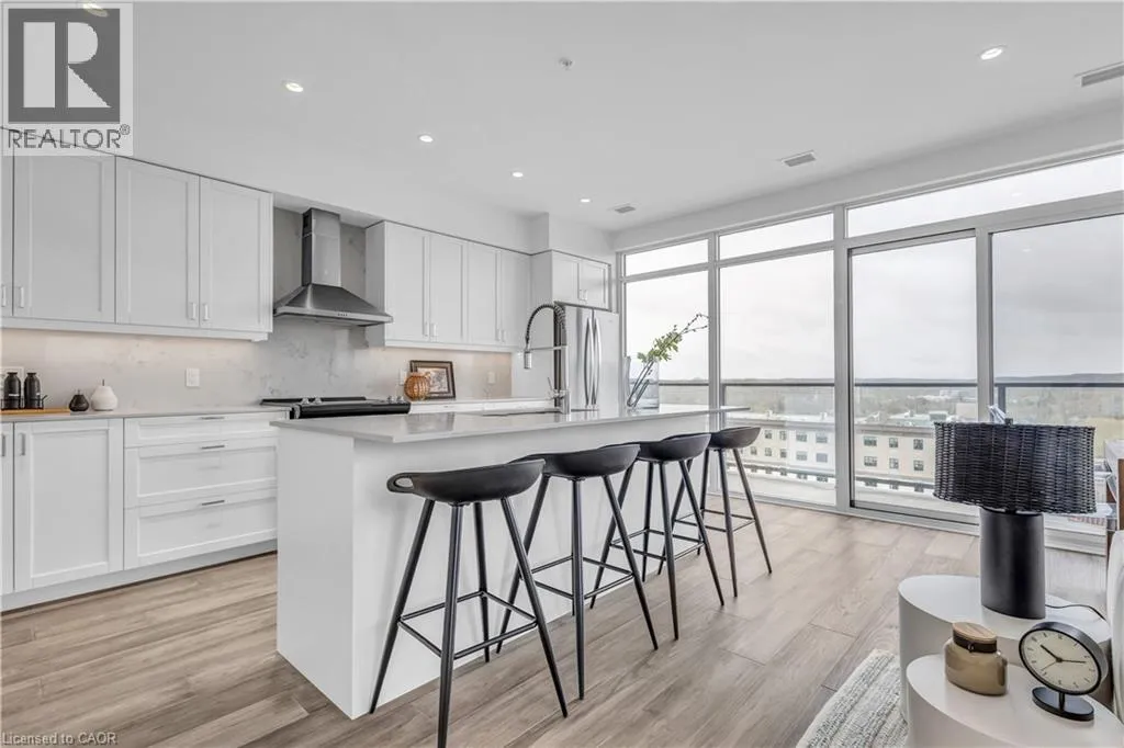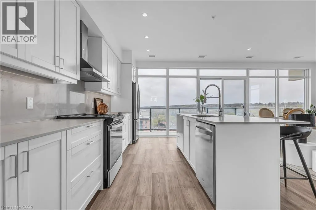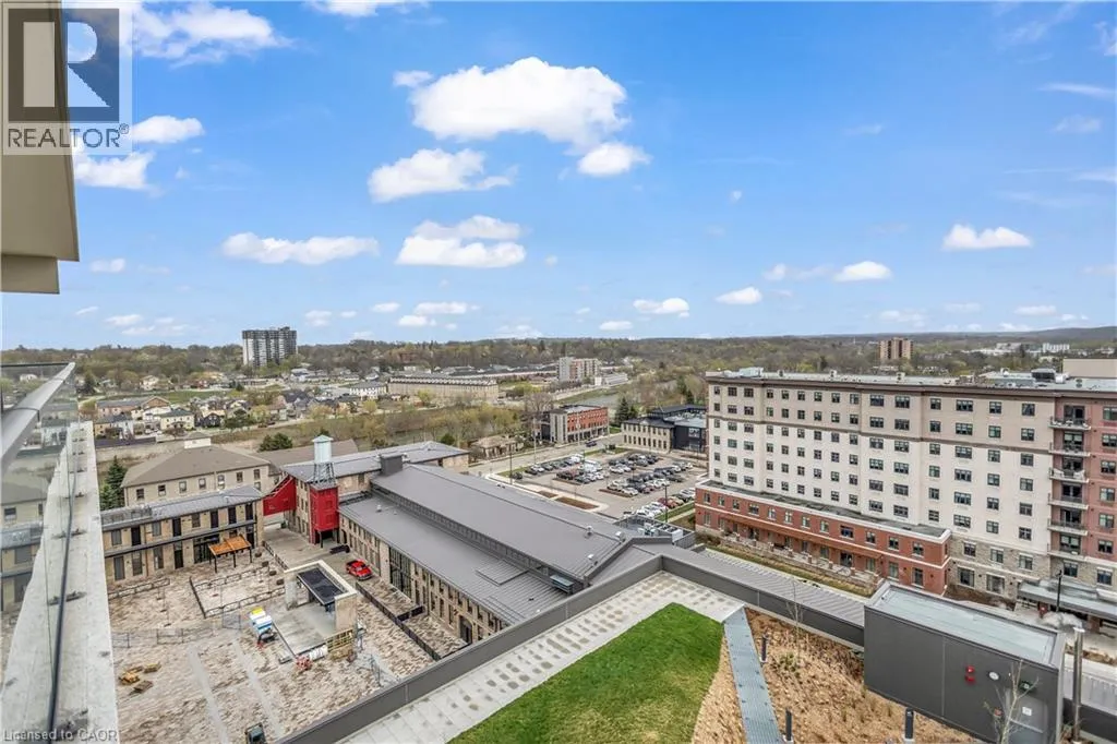St Andrews St to Glebe St 2 BED, 2 BATH CONDO IN THE HIGHLY DESIRED GASLIGHT DISTRICT! This upgraded 1,126 sq. ft. unit offers impressive views of the Grand River and Gaslight Square. Featuring 9-foot ceilings and an open-concept layout, the kitchen and dining area include shaker-style cabinetry, quartz countertops, backsplash, and upgraded appliances. Enjoy premium engineered hardwood throughout, large windows providing plenty of natural light, and in-suite laundry for convenience. Step out onto the spacious balcony with access from both the kitchen and primary bedroom â perfect for taking in the panoramic city views. This unit includes two underground parking spaces and access to exceptional building amenities such as a fitness centre, games room, study/library, and an expansive outdoor terrace with pergolas, fire pits, and BBQ areas overlooking Gaslight Square. (id:27476)