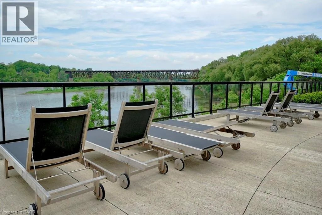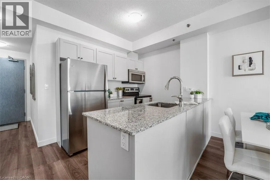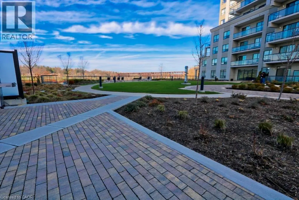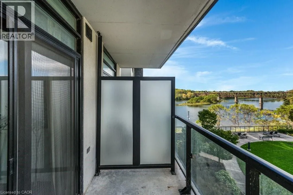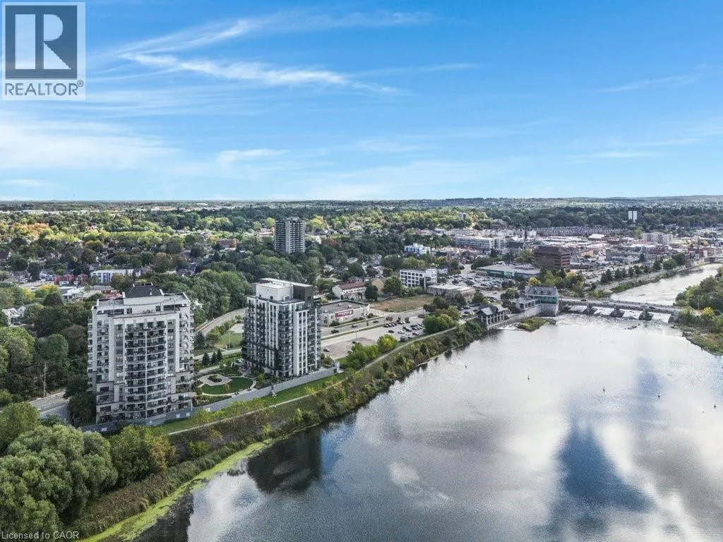 At intersection of Water and Ainslie Streets For lease with immediate occupancy! This beautifully updated one-bedroom condo showcases sweeping views of the Grand River and a bright, spacious living/dining area with an open-concept kitchen and breakfast bar. The kitchen features four stainless steel appliances, while a convenient laundry closet with a stacked washer and dryer adds everyday ease. This freshly painted move-in ready unit offers modern laminate flooring, pot lighting, and granite countertops. Step through the living room patio door to your private balcony and enjoy tranquil river views. The buildingâs expansive riverside terrace provides lush gardens, generous seating, gas fire pits, and gas BBQsâperfect for relaxing or entertaining. Additional amenities include a fitness center, guest suite, party room, storage, and underground parking. Ideally located within walking distance to live theatre, scenic river trails, the farmersâ market, boutique shops, and great restaurants. A must-see! (id:27476)