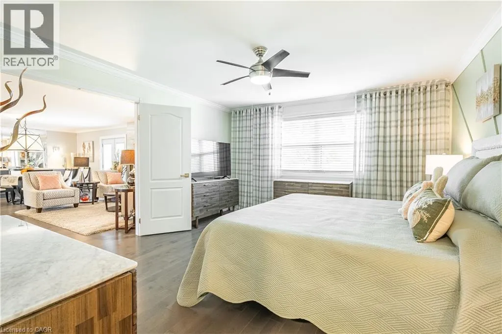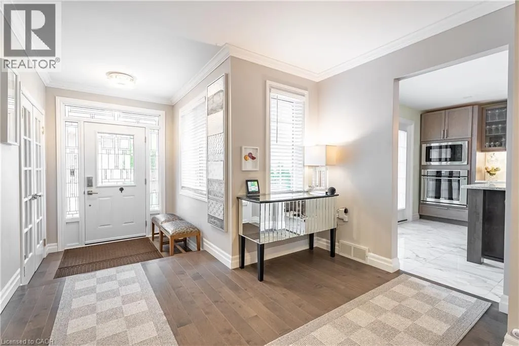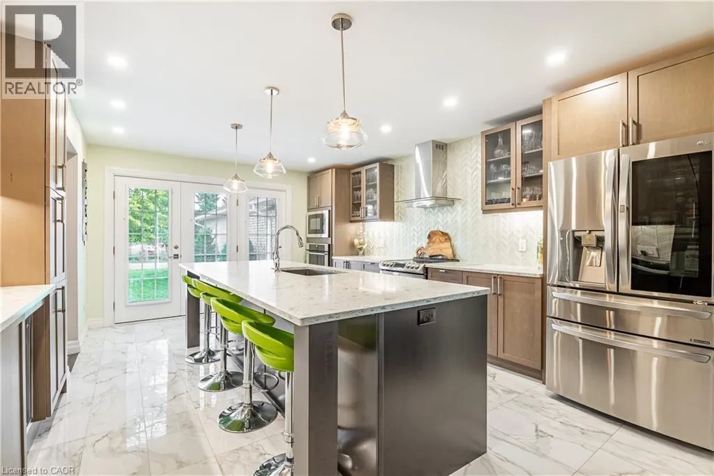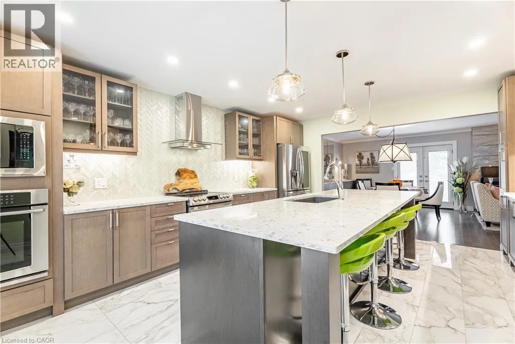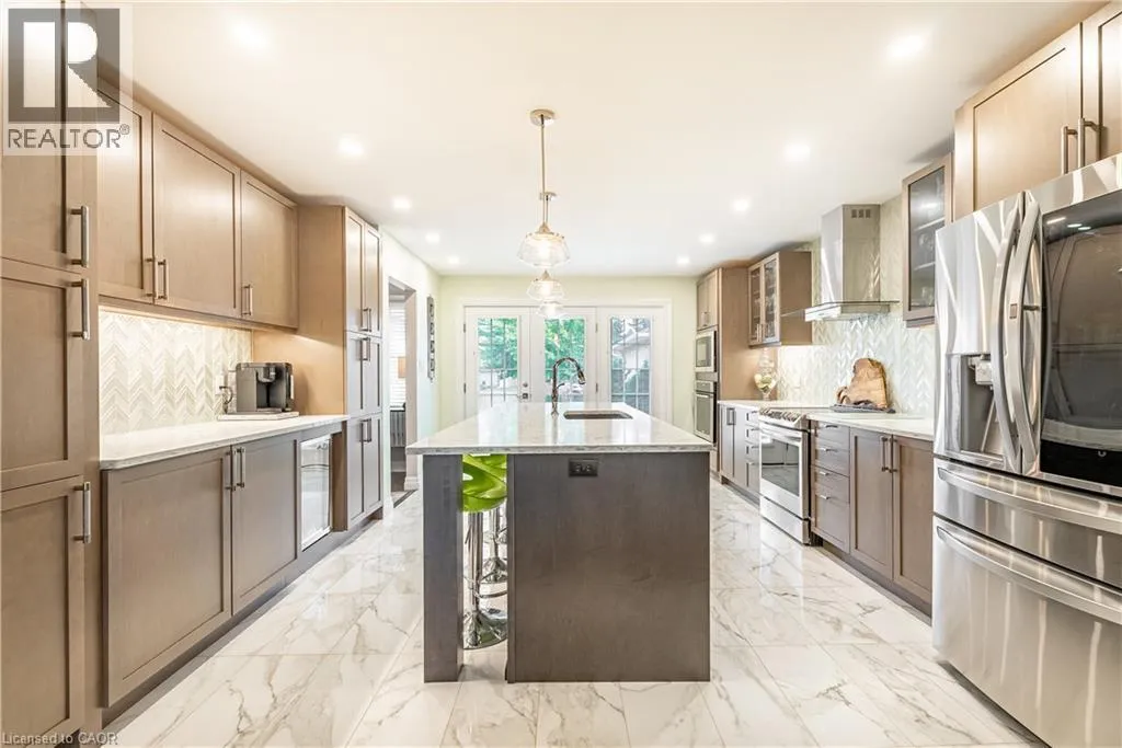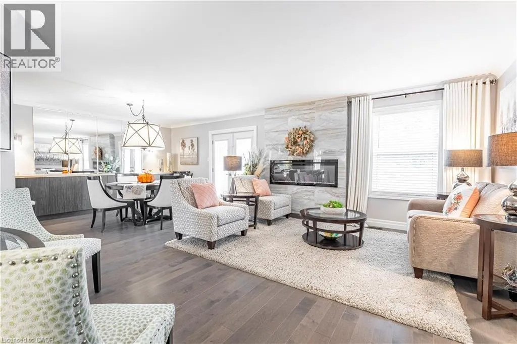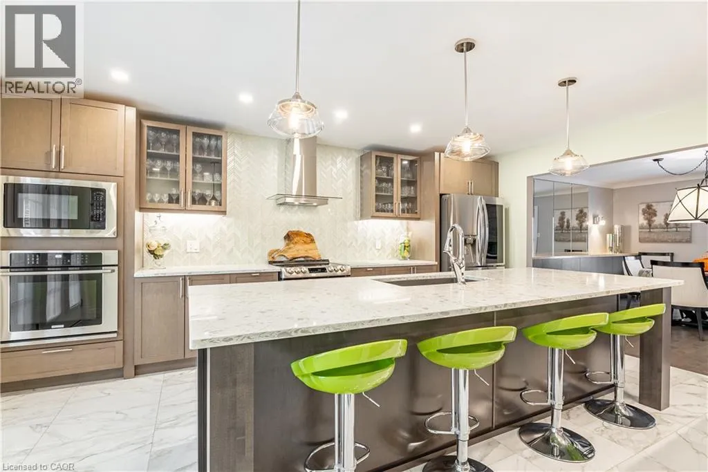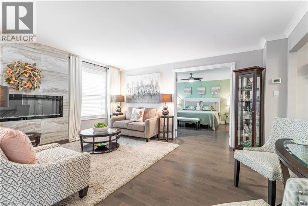 FRANKLIN BLVD TO AVENUE ROAD TO BEASLEY CRES. Welcome to 9â75 Beasley Crescent, where sophistication meets comfort in this totally upgraded 3-bedroom plus den home, designed for modern living and effortless entertaining. Every detail has been thoughtfully crafted with high-end finishes and smart functionality throughout. Step inside to find solid hardwood and marble tile flooring, an inviting electric fireplace with a marble tile surround, and an open-concept layout perfect for gatherings. The chef-inspired kitchen features quartz counters, a large island that seats four, custom cabinetry with pantry, glass tile backsplash, built-in second oven and microwave, coffee bar, and a built-in server in the dining area that blends form and function beautifully. On the main level, the primary suite feels like a boutique hotel retreat with a 5-piece ensuite offering a standalone tub, glass shower, double-sink vanity, and a walk-in closet. Each bedroom is enhanced with ceiling fans for comfort and airflow. The glass-railed staircase leads to a fully finished basement featuring a large guest bedroom with ensuite and walk-in closet, an office, recreation room with gas fireplace, den with closet, laundry room, and ample storage, providing versatile living spaces for guests, work, and relaxation. Step outside to a large composite deck that is perfect for summer barbecues or quiet morning coffee overlooking your private outdoor space. Enjoy resort-style amenities in this friendly community, including a clubhouse with games room, library, pool, and tennis/pickle ball courts. Ideally located close to shopping, dining, trails, and Shades Mills Conservation Area, everything you need is within reach. Move-in ready and loaded with upgrades, this home offers the perfect blend of elegance, comfort, and convenience. Live in luxury at 9â75 Beasley Crescent. Book your private showing today â this one wonât last! (id:27476)