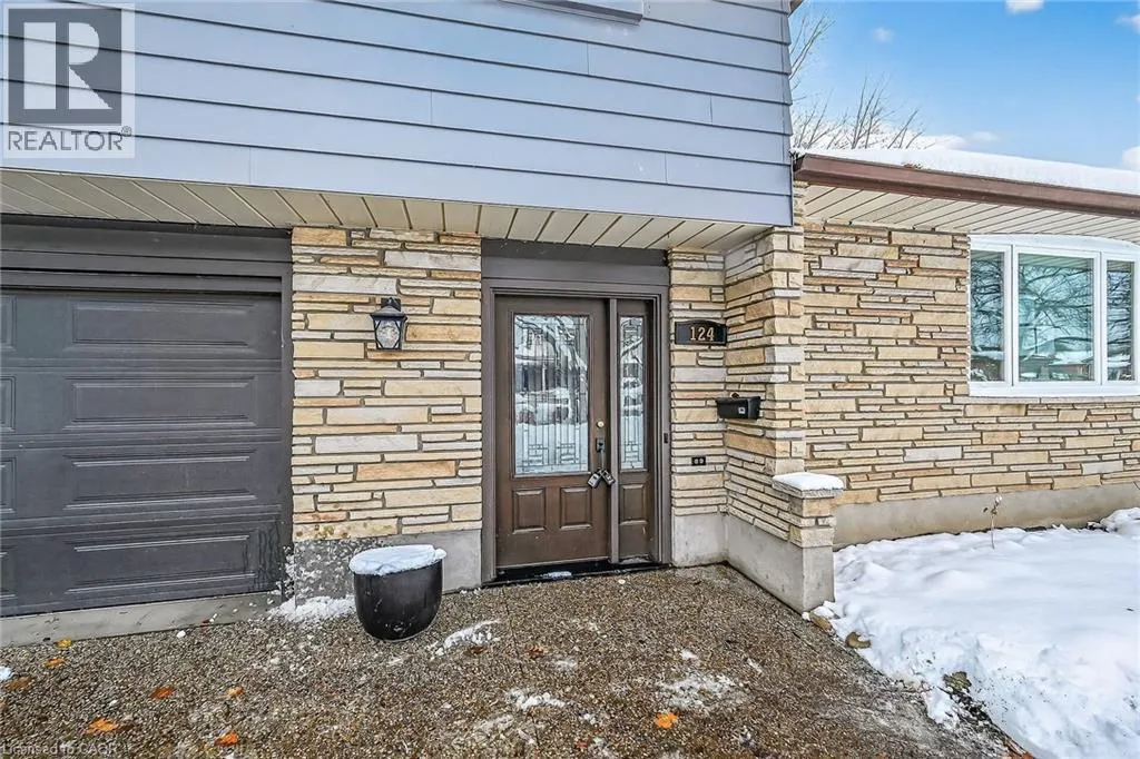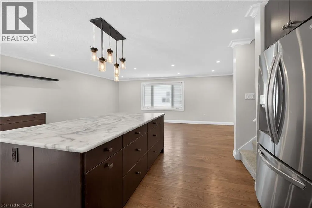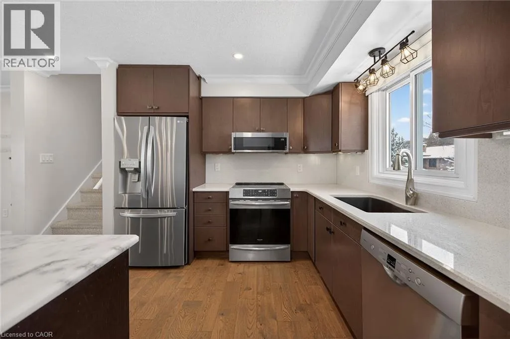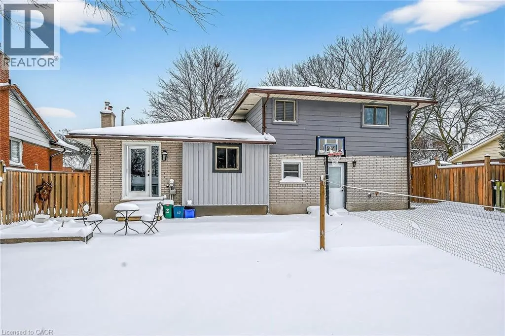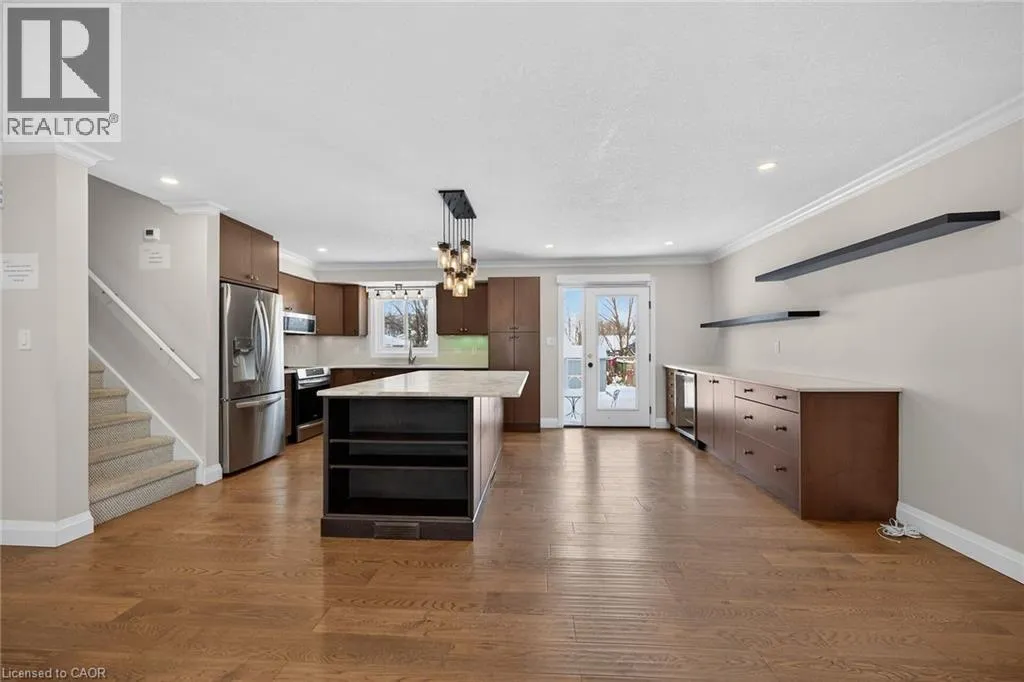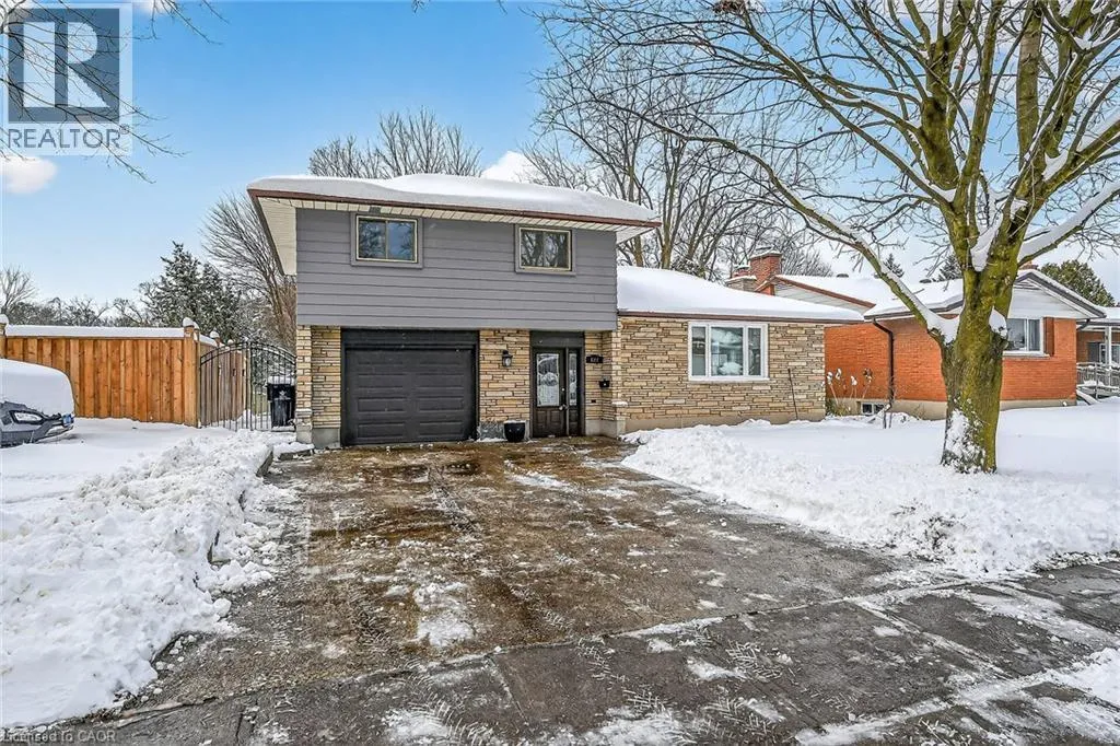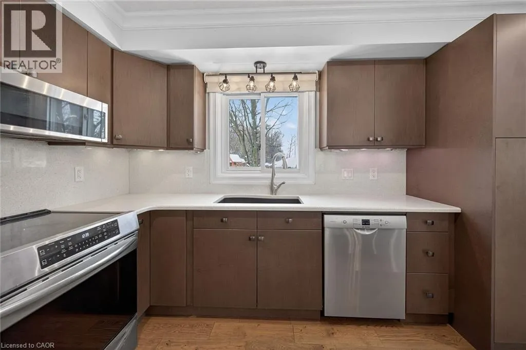 Southwood between White Oak and Westwood Tidy, updated side split in desirable West Galt location. This 3 bedroom 2 bathroom home features a open concept main level. Updated kitchen with abundant cabinetry, solid surface counters and backsplash, pantry and huge island. The sun filled living room and dining room offer crown molding, wide plank hardwood floors and led pot lights. Dining room features patio door to back yard and a servery/coffee bar and open shelves. Bedroom level provides 3 spacious bedrooms and a modern 5 pce. bathroom. The finished lower level provides loads of additional living space. Cozy rec room, kids play area and big laundry room. Private, mature back yard with cement patio area and storage shed. Enjoy the summer shade in the spacious yard while the kids play. Wide double, exposed aggregate driveway, makes a memorable first impression. Recent front entry door. 23 ft X 13 ft garage. Great neighborhood steps to school and park. Don't miss out! (id:27476)