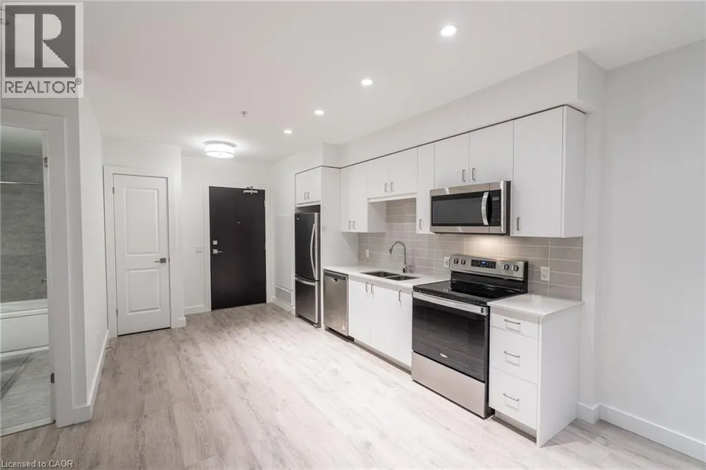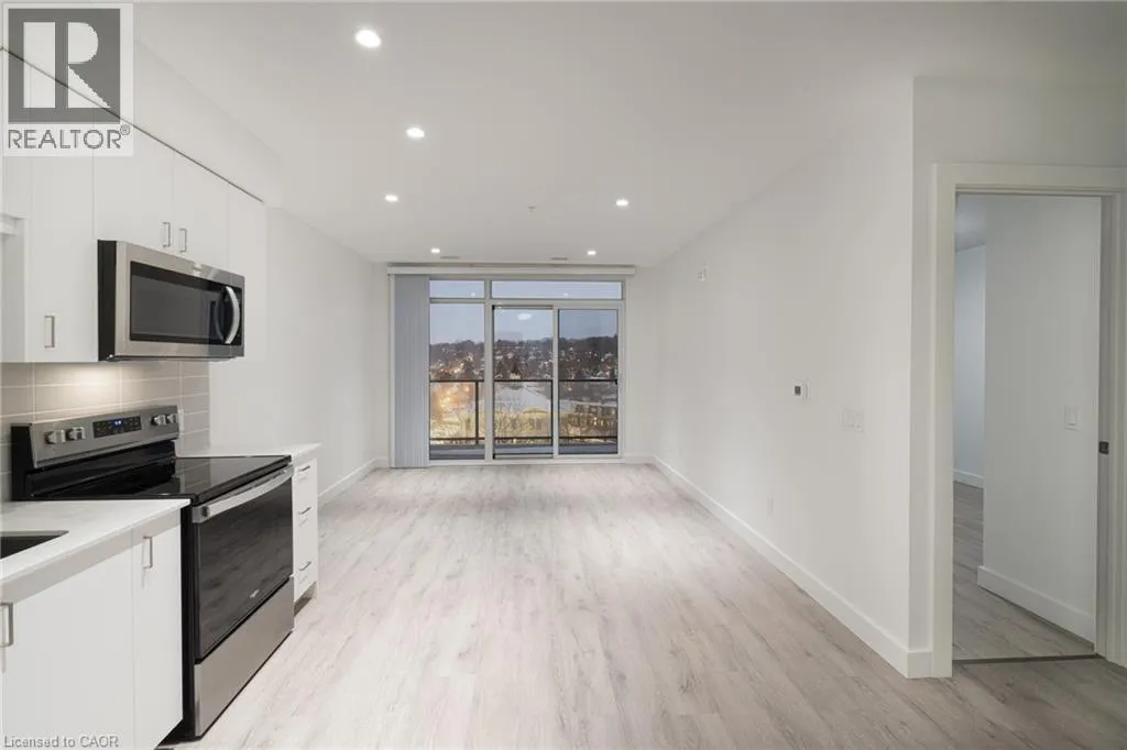 Turn from St. Andrews Welcome to the Gaslight District! Available to move in immediately. Watch the golden sunsets from your 10th floor 1 bedroom 1 bathroom apartment with balcony. Parking is included and in suite laundry. Featuring a spacious eat-in kitchen and modern layout. Building has luxurious amenities at your fingertips. Gym, party room, library/study, large outdoor terrace, yoga studio, bike parking and so much more. Make this stylish lifestyle condo building your home. West Galt has so much to offer with pubs, restaurants, businesses and transit. On the banks of the Grand River with access to Cambridge's breathtaking views. (id:27476)
