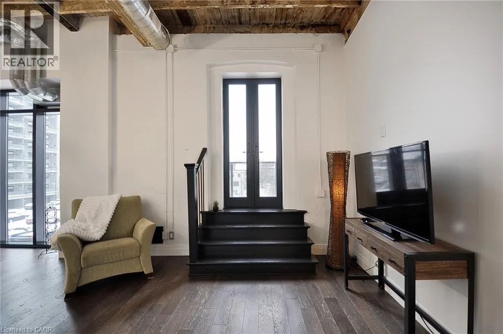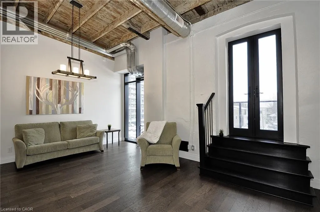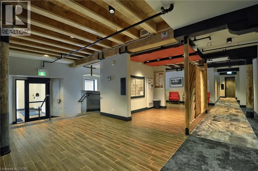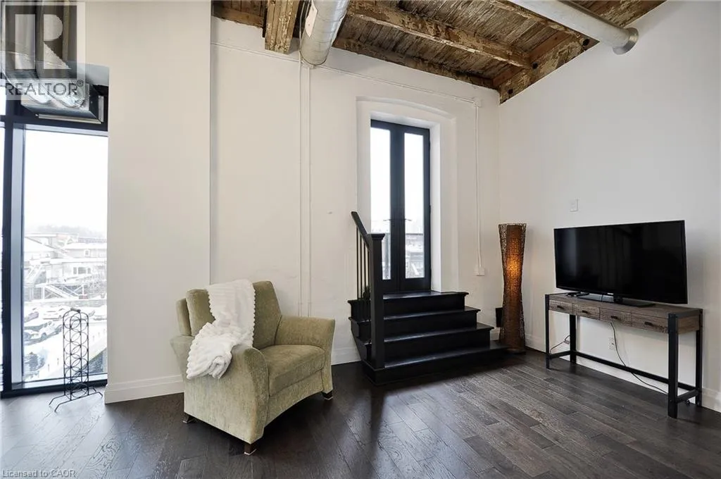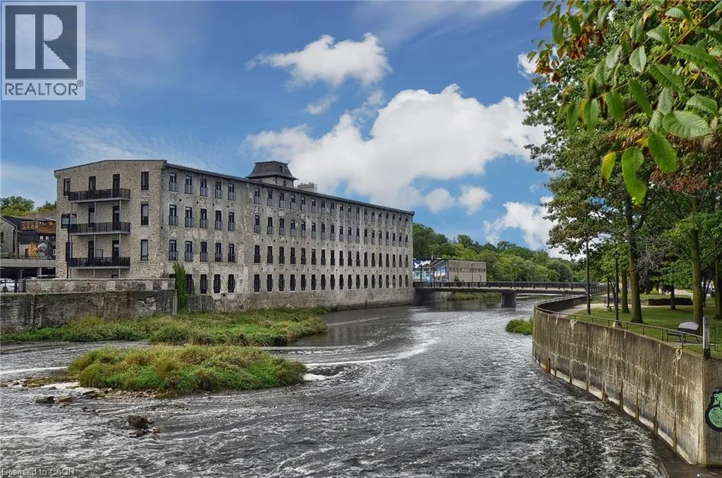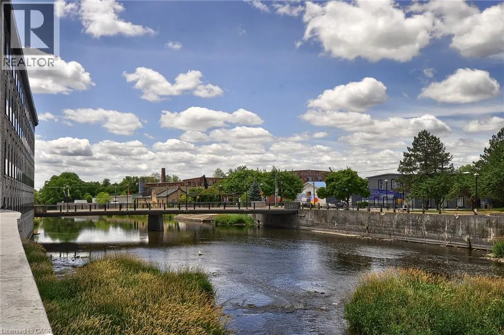 Experience boutique living at Riverbank Lofts, a landmark conversion in the heart of historic downtown Hespeler. This iconic riverside building blends heritage charm with modern sophistication along the banks of the Speed River. This bright one-bedroom condo features soaring ceilings, oversized windows, and exposed wood beams that highlight the buildingâs character. The open-concept living space flows into a contemporary kitchen with quartz countertops and a breakfast bar, perfect for entertaining. Step out onto your private balcony to unwind. The spacious bedroom includes a large walk-in closet, in-suite laundry, and high ceilings throughout. Includes one parking space and access to premium amenities such as three resident lounges, a fitness centre, bike storage, and a dog wash station. Just steps to cafés, shops, parks, and scenic river trails, this is boutique urban living at its finest. (id:27476)