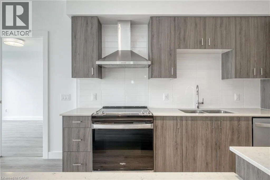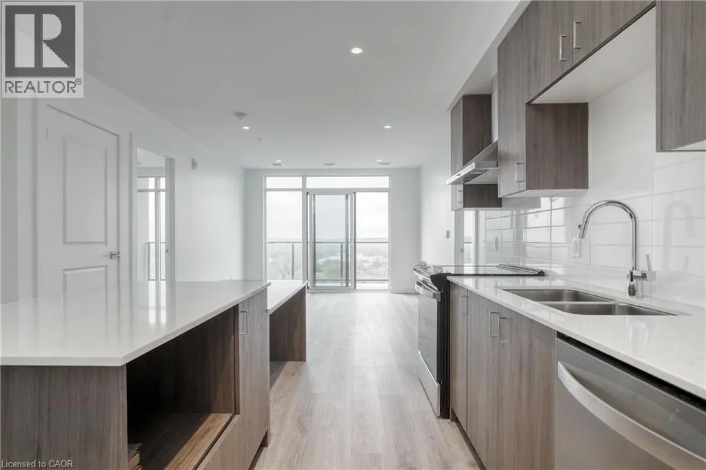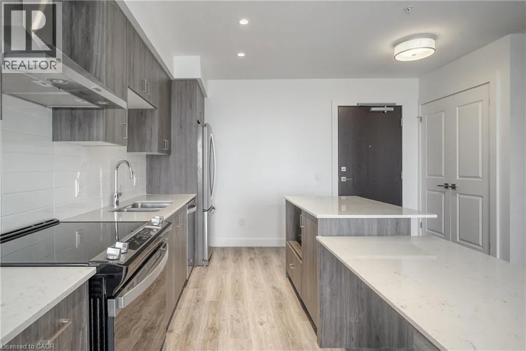 Highway 24 to Concession Street to Grand Ave Located in the vibrant Gaslight District, this stunning 2 bedroom, 2 bathroom residence offers high end finishes and modern design throughout. The suite features nine foot ceilings and wide plank flooring, creating a bright and sophisticated living space. The contemporary kitchen showcases sleek modern cabinetry, quartz countertops, and stainless steel appliances, seamlessly flowing into the open concept living room. Expansive windows fill the home with natural light, while the balcony offers beautiful views of the Grand River. The primary suite is complete with large closets, a private balcony, and a four piece ensuite. The second bedroom is generously sized with excellent closet space, ideal for guests or a home office. Additional conveniences include in suite laundry, one underground parking space, and one locker. Residents of the Gaslight District enjoy premium amenities including a party room, games room, yoga studio, and outdoor terrace with BBQs. Ideally located close to trendy restaurants, shops, schools, and all the best of downtown Cambridge living. (id:27476)