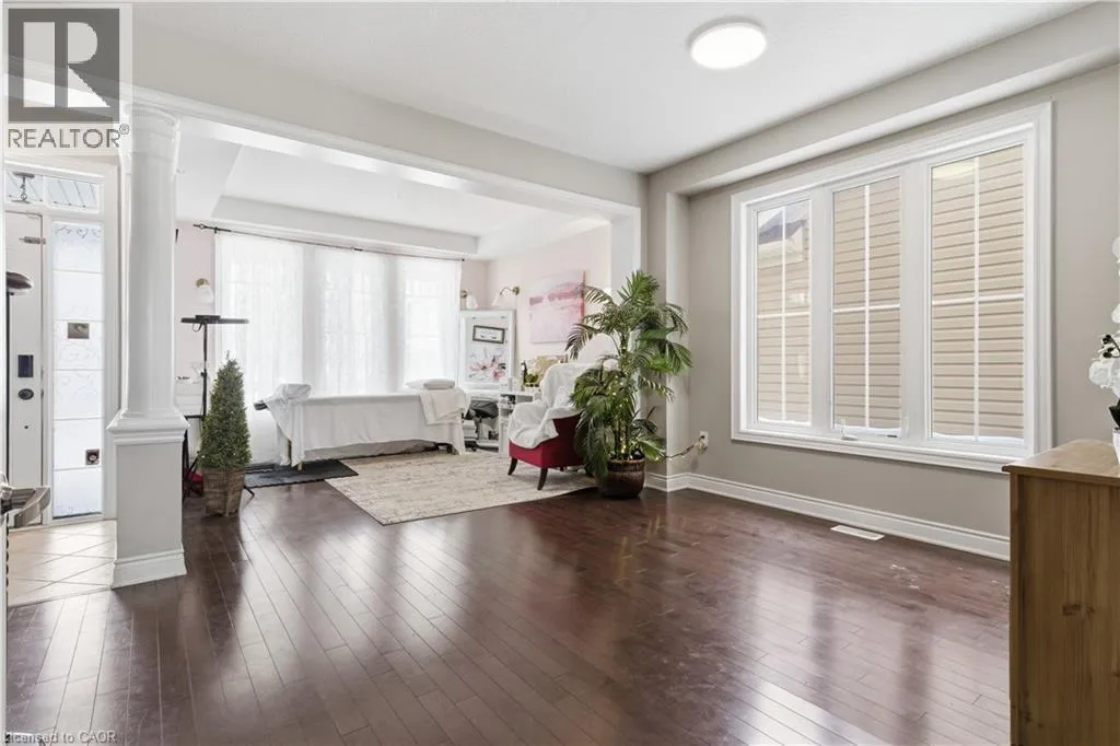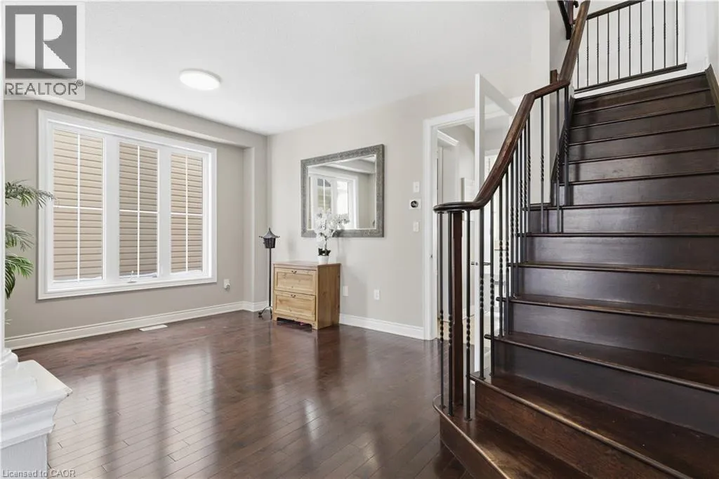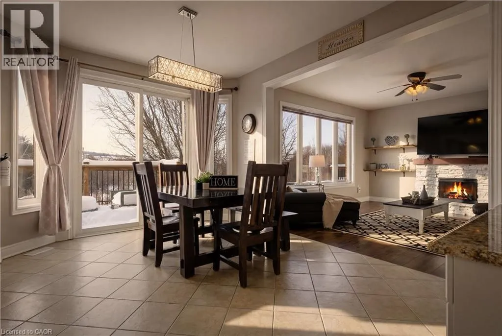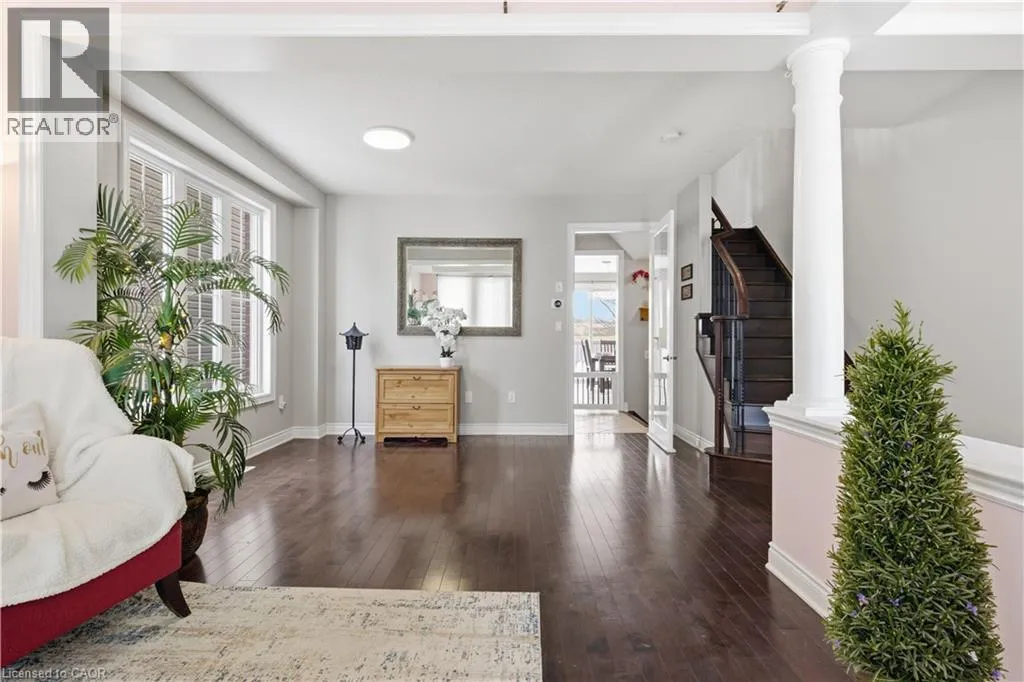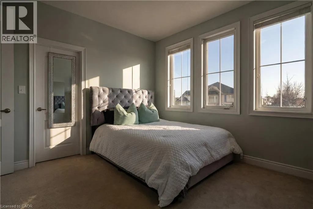 Just minutes to the 401, this spacious Mattamy-built home offers approximately 2,460 square feet of well-designed above-grade living space in the highly sought-after Millpond community of Hespeler, surrounded by prestigious homes. Set on a premium lookout lot backing onto peaceful green space and located just a few doors from the park, this home offers both privacy and convenience. A covered front porch welcomes you into a bright, open-concept layout with large principal rooms and meticulous upkeep throughout. Rare 9-foot ceilings on both the main and second floors are complemented by upgraded 8-foot interior doors. Hardwood floors highlight the living and dining areas, while the eat-in kitchen features a centre island, chefâs desk, and ample cabinetry, ideal for family living and entertaining. The upgraded hardwood staircase with wrought iron spindles leads to the second level, offering four generously sized bedrooms, three with walk-in closets. The primary retreat includes his and hers closets and a spa-inspired ensuite with an upgraded six-foot soaker tub and glass-enclosed shower. Plush upgraded broadloom adds comfort, and the second-floor laundry room includes an upgraded vanity and tub. Walk out from the dinette to a large deck with stairs overlooking scenic greenspace views. The fully fenced backyard also features a concrete patio and an extra-large shed. Additional highlights include central air conditioning, a central vacuum rough-in, water softener, and garage door opener. The partially finished lookout basement offers a large recreation room with pot lights and a spacious fifth bedroom. An exceptional home in a prime location that truly checks all the boxes. **Please note some photos are virtually staged** (id:27476)