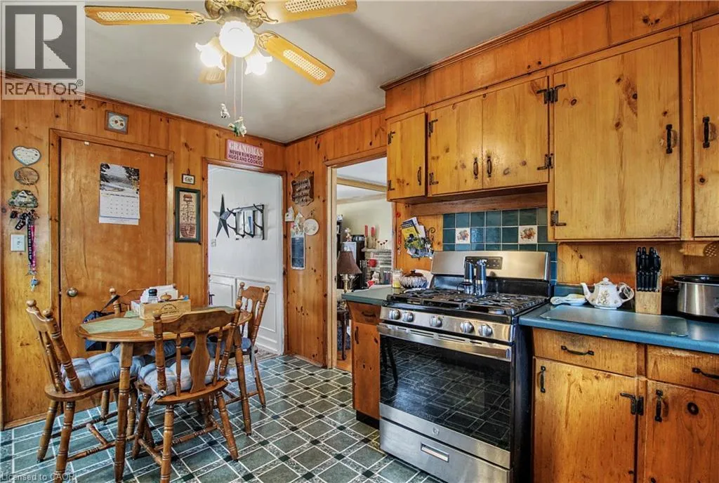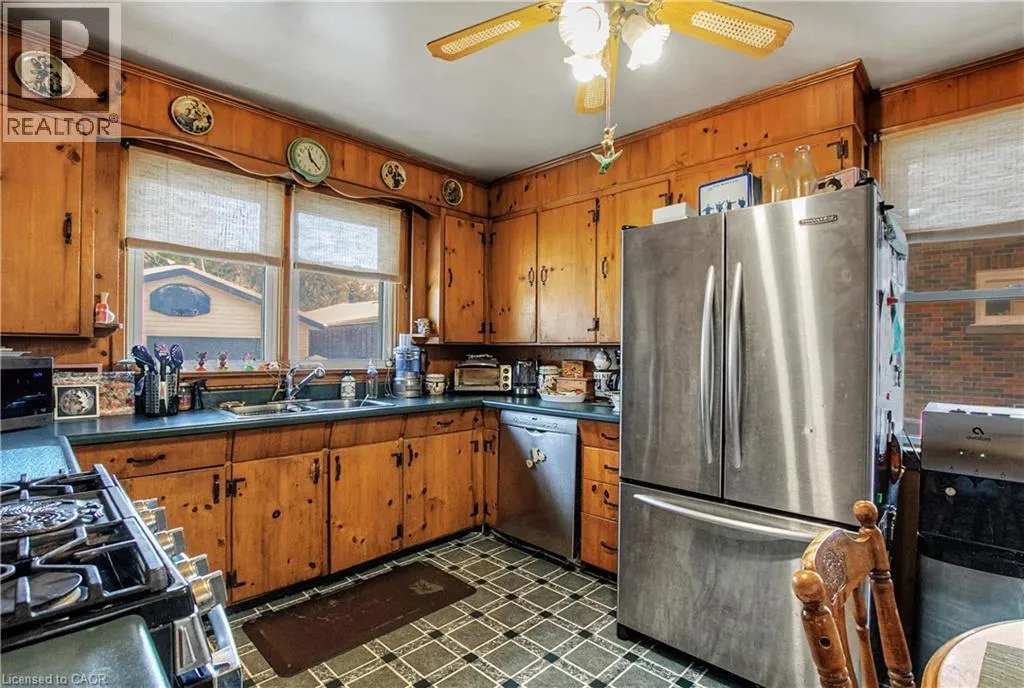 Welcome to this charming two-story home offering a cozy and comforting living space. This home is walking distance to parks, schools and downtown Galt area. The main level features a bright open-concept living and dining area with sliding doors that lead out to a stamped concrete patio, perfect for everyday living, relaxing or hosting guests. The kitchen is well equipped with ample storage, including a pantry and features a gas range (approx. 2 years old), stainless steel refrigerator and a Bosch dishwasher. Upstairs you will find three well-sized bedrooms filled with natural light and good sized closets, and a 3-piece bathroom that was renovated in 2024. The finished basement adds excellent value and flexibility for an in law suite or income potential. It is complete with a second kitchen, good sized bedroom, 3-piece bathroom and a generous sized recreation room with durable laminate flooring. This area is perfect for extended family, guests or additional living space. Oversized garage 21ft. X 21ft. with 2 storage sections. This home has had some major updates in the last two years (2024) which include: Brand new furnace 2026 with a 5 year warranty and first year with free service, high end laminate flooring in the basement, a new driveway, a cement stamped walkway out front, a 21X19 cement stamped pad at the back, egress windows and new window wells all around, new bathroom upstairs, new drains from the main kitchen sink to the main stack in the basement. New drain from the upstairs bathroom to the main floor bathroom. From the main drain (stack) pipe there is a new drain pipe all the way out to the main flush out. The foundation was re-built 9 ft down to the footings with cement re-bar and the basement wrapped in Blueskin WP200 and sealed from the back right corner to the front left corner. With it's warm character, functional layout and income potential this home is ready to welcome its next owner. (id:27476)