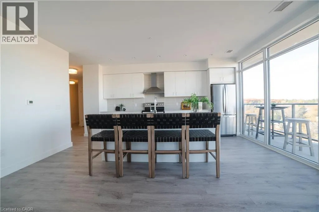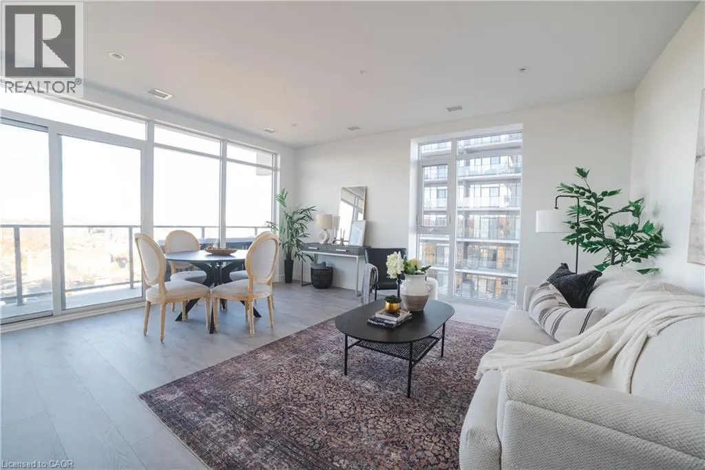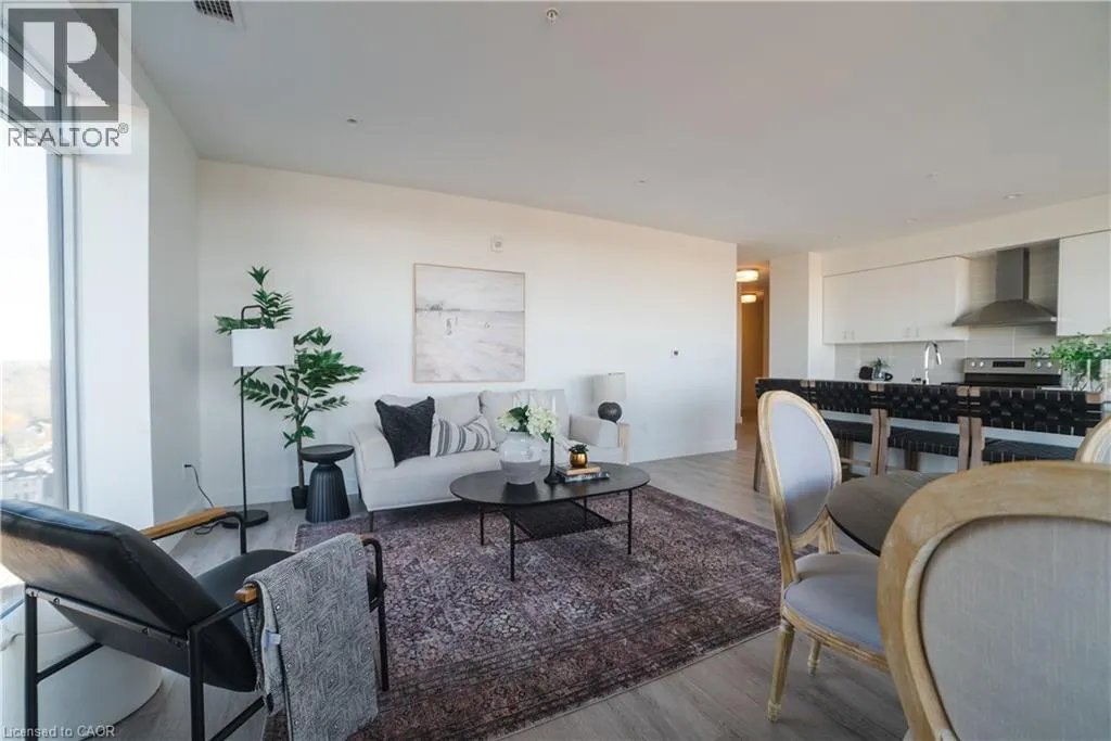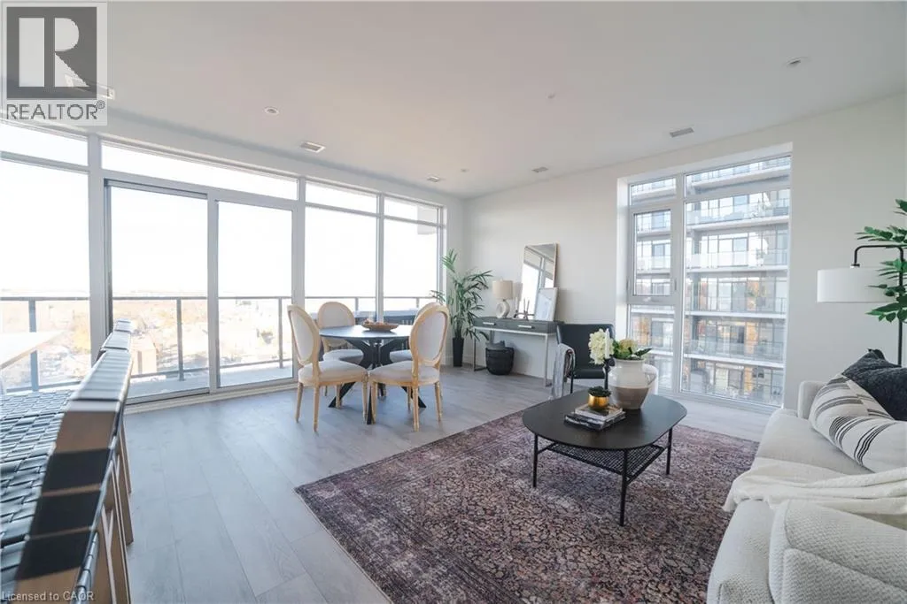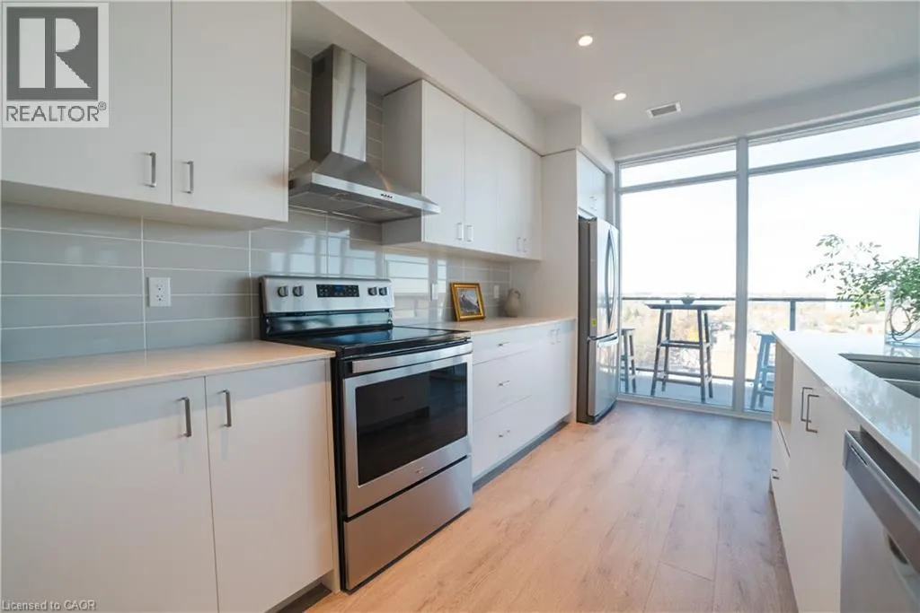 St Andrews St to Glebe St Located in the heart of historic downtown Galt, this beautiful condo is part of the vibrant Gaslight Districtâa new center for residential, commercial, retail, dining, art, and culture. Here, life, work, and leisure come together to create an unparalleled living experience. This impressive unit has nine-foot painted ceilings, wide-plank light flooring, and premium finishes throughout. The spacious kitchen features modern cabinetry with designer hardware, quartz countertops, a tile backsplash, an oversized island with an under-mount sink and gooseneck faucet, and stainless steel appliances. The open-concept design flows seamlessly from the kitchen into a generous living and dining area, ideal for entertaining. Floor-to-ceiling windows and access to a large balcony let natural light flood the space. The primary suite offers his & her closets, glass doors leading to the balcony, and a luxurious four-piece ensuite with dual sinks and a walk-in shower. A second bedroom with floor-to-ceiling windows, a four-piece bath with a tub and shower combo, and in-suite laundry complete this premium unit. This condo also includes two parking spaces for your convenience. Residents enjoy access to an array of amenities, including a welcoming lobby with seating, secure video-monitored entry, a fitness area with a spacious yoga and Pilates studio, a games room with billiards, ping-pong, and a large TV, a catering kitchen, a private dining room, and a cozy library. The lounge opens onto a spacious outdoor terrace overlooking Gaslight Square, featuring multiple seating areas, pergolas, fire pits, and a BBQ area for outdoor relaxation. (id:27476)