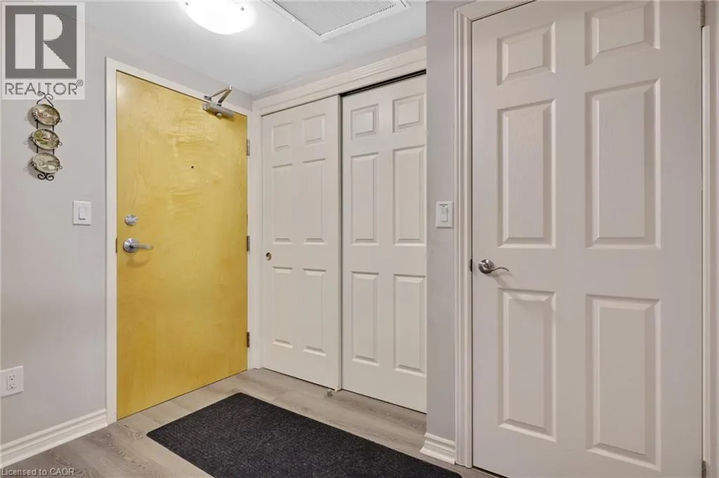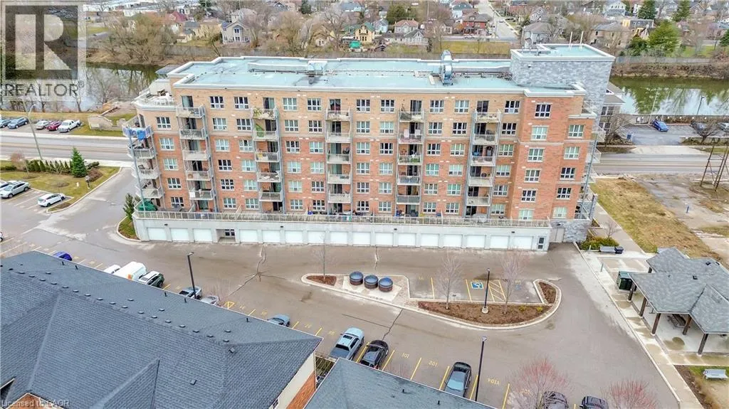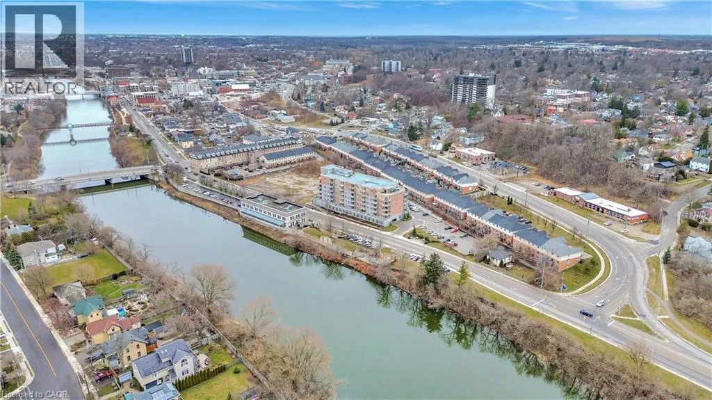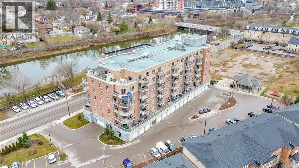 Exceptional Condo in Stunning, Historic Downtown Galt Seize the opportunity to own a pristine, move-in ready condo overlooking the picturesque historic downtown Galt. Built in 2016, the prestigious Riverfront Condos are renowned for their superior design and quality craftsmanship. This solid concrete mid-rise, featuring a striking brick and stone exterior, stands seven stories tall and offers something for everyone. Unit 503 boasts a spacious, open-concept floor plan with 2 bedrooms and 2 full bathroomsâhighlighted by a luxurious walk-in closet and ensuite in the primary bedroom. The upgraded kitchen shines with elegant countertops and black appliances, perfect for both everyday living and entertaining. With just under 900 square feet of thoughtfully designed interior space, step out onto your private balcony to savour breathtaking sunrises and western views of the Grand River from the shared rooftop patio and charming downtown Galt. Convenience is key â this unit includes one owned parking spot along with ample visitor parking. Enjoy being just minutes from all your favourite amenities: the vibrant new Gaslight District, upscale coffee shops, fine dining, scenic hiking trails, water activities, boutique shopping, theatres, and bustling local markets. Galt is a community that beautifully blends its historic charm with a modern, forward-thinking spirit. Exciting developments are underway, including the upcoming second phase of the Light Rail Transit connecting Galt to KW, as well as new condos and the entertaining gaslight district just steps away, expanding residential and commercial spaces along the Grand River. With quick access to Highway 401 (just 15 minutes away) and Highway 8 towards Hamilton, this location offers incredible connectivity without sacrificing tranquility. Discover why Galt Cambridge is quickly becoming one of the most sought-after places to live â embrace this exceptional lifestyle today! (id:27476)