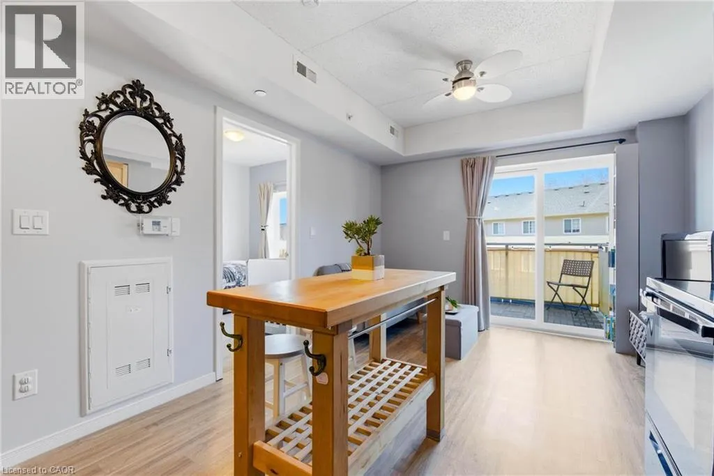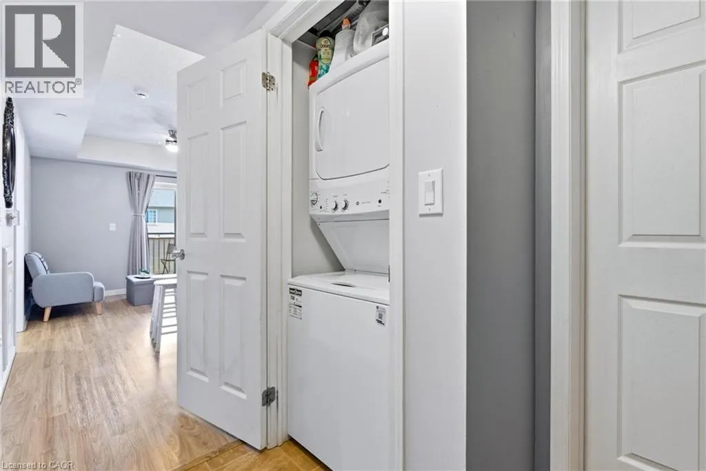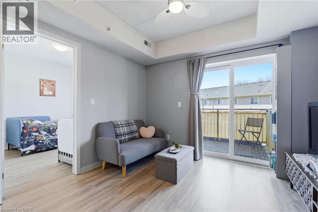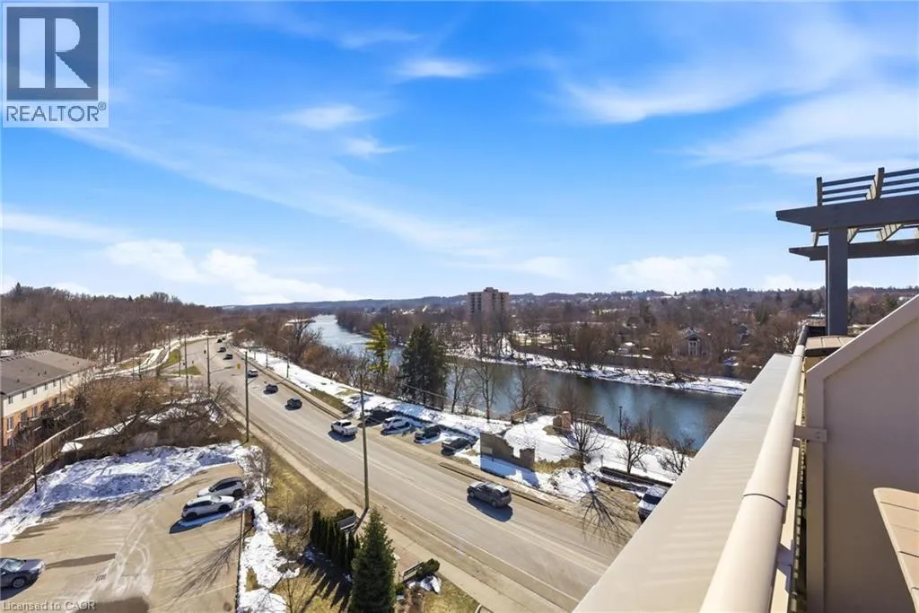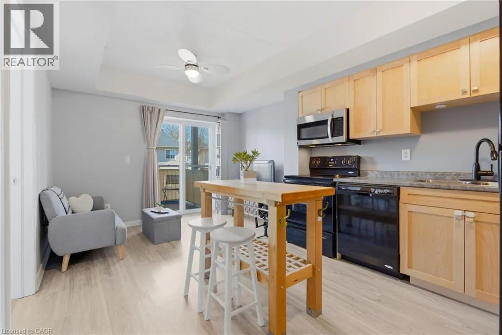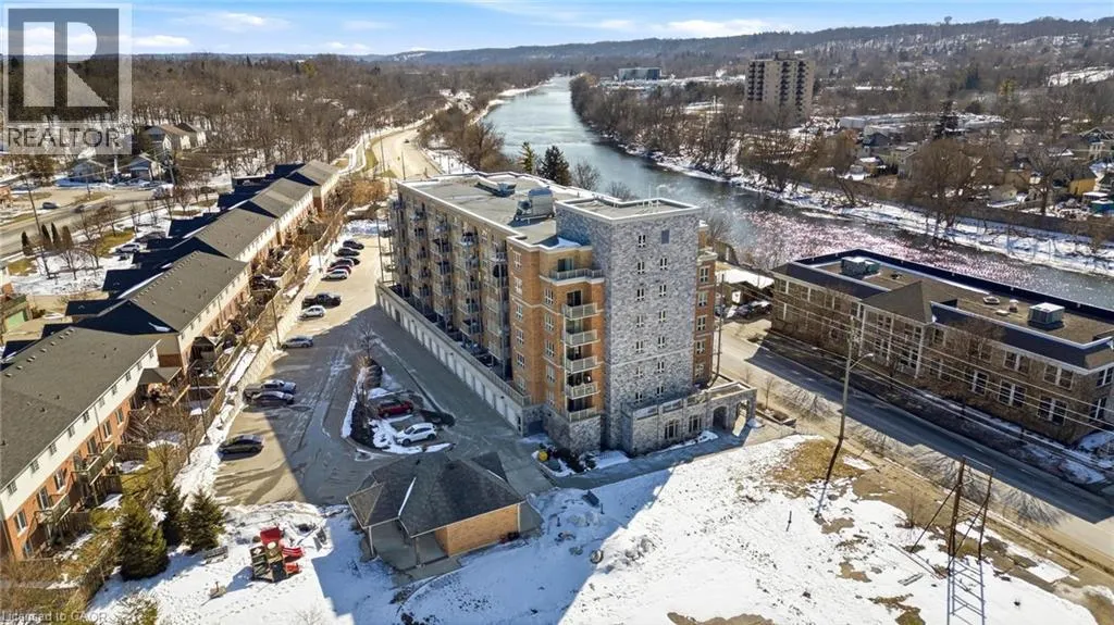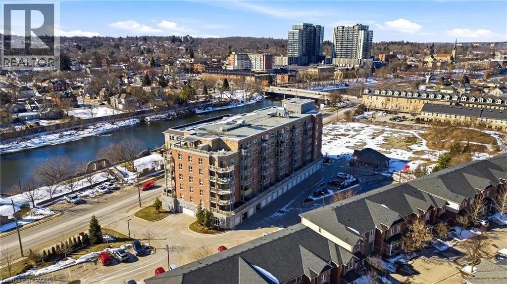 Welcome to RiverFront Condominiums, ideally located along the Grand River and steps from scenic walking trails while remaining close to historic downtown Galt, amenities, shopping, dining, and transit. This bright and functional one-bedroom suite offers an open-concept kitchen and living area with modern flooring throughout. The kitchen features ample cabinetry, full-sized appliances, and a movable central island for additional prep space and seating. The living area provides access to a private balcony, perfect for morning coffee or evening relaxation. The spacious bedroom includes double closets and large windows for natural light. The four-piece bathroom is well maintained with a full tub and shower combination. Additional features include in-suite laundry with a newer washer and dryer (2024). Building amenities include bike storage, a rooftop patio with south-facing river views and a BBQ area, and a playground for children. This suite is an excellent opportunity for first-time buyers, professionals, downsizers, or investors seeking a low-maintenance property alongside the Grand River. (id:27476)