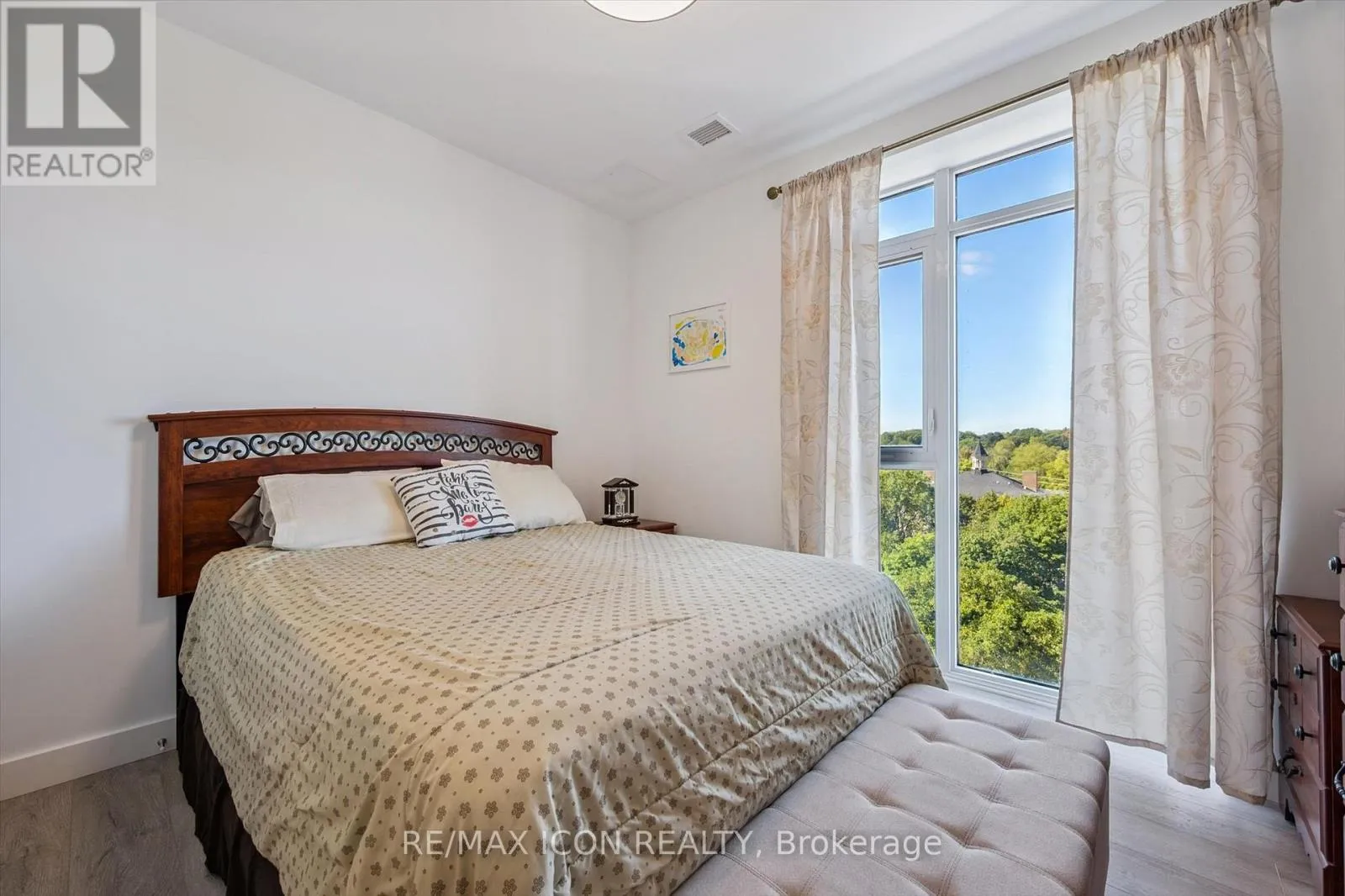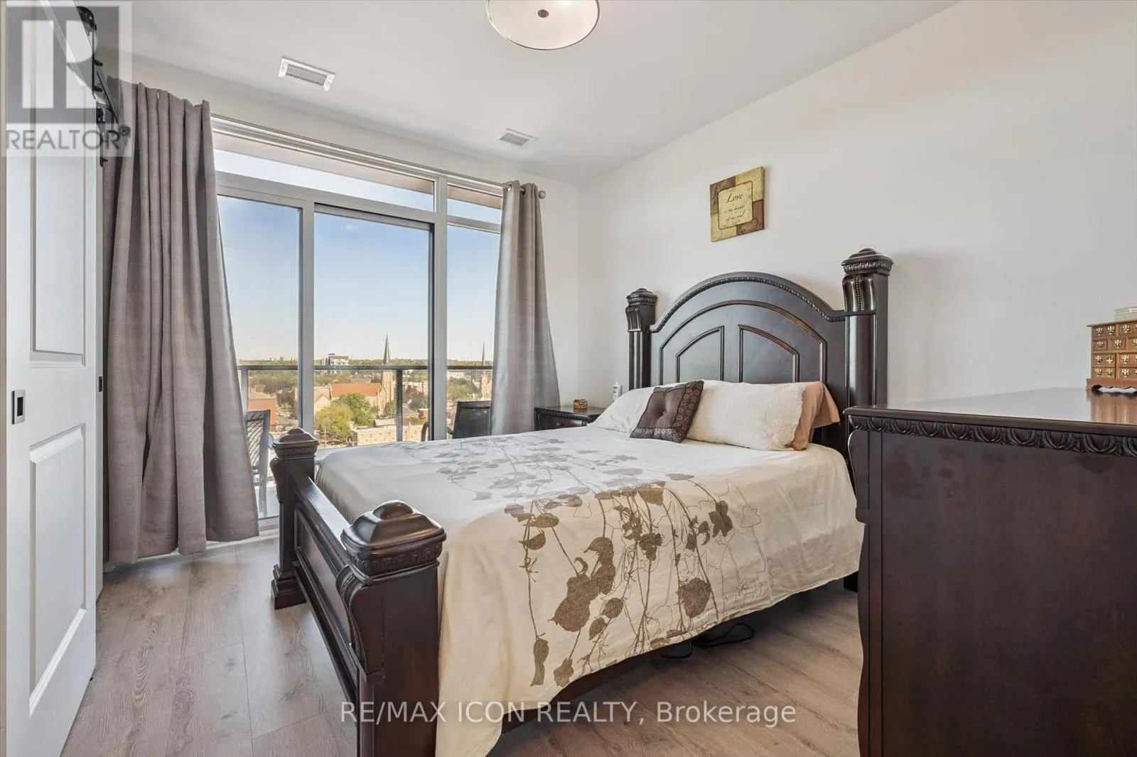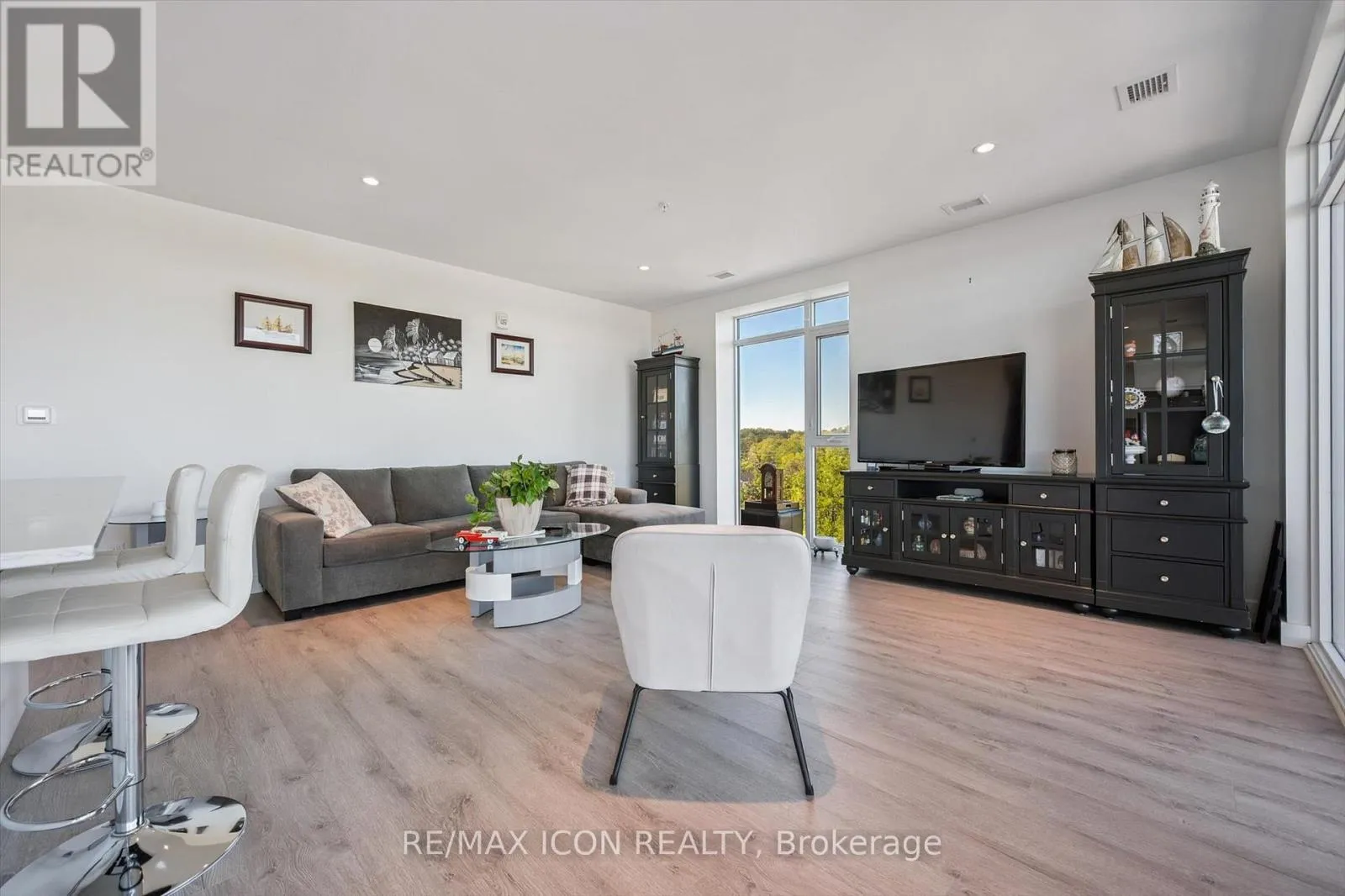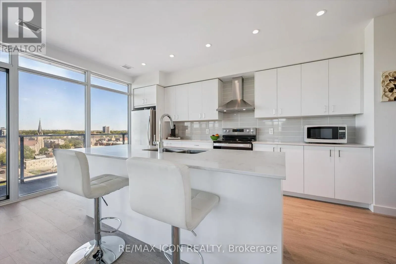 Cross Streets: St Andrews. ** Directions: St Andrews to Glebe. STUNNING VIEWS from this 9th-floor corner unit in the vibrant Gaslight District! Discover this beautiful 2-bedroom, 2-bathroom condo just steps from the Grand River, offering spectacular treed views over historic West Galt. Featuring 9-foot ceilings, laminate flooring, and an open-concept design, this home perfectly blends modern style with everyday comfort. The spacious living area flows seamlessly into a contemporary kitchen complete with sleek white cabinetry, quartz countertops, upgraded stainless steel appliances, and a large island ideal for cooking, dining, and entertaining. Step out onto the full-width balcony-accessible from both the living room and the primary suite-and take in the beautiful outdoor space. The primary bedroom offers two closets and a 4-piece ensuite with double sinks and a walk-in shower. A second bedroom, additional 4-piece bathroom, and convenient in-suite laundry complete the thoughtfully designed layout. One parking space is included. As a corner unit, enjoy extra windows and sweeping views to the north and west, filling the space with natural light. Residents enjoy exceptional amenities including multiple lounges, a games room with billiards and ping pong, a state-of-the-art fitness and yoga studio, stylish party room with bar, co-working spaces, and stunning outdoor terraces overlooking Gaslight Square-featuring fire pits, pergolas, and BBQ areas. Step outside and embrace the vibrant downtown lifestyle- walk along the Grand River trails, explore nearby cafés and shops, or visit the weekend Farmer's Market. Live in the heart of the Gaslight District, surrounded by incredible restaurants, events, and entertainment. Maintenance fees include gas and internet. Book your private showing today! (id:27476)
