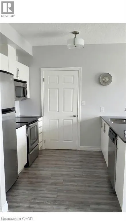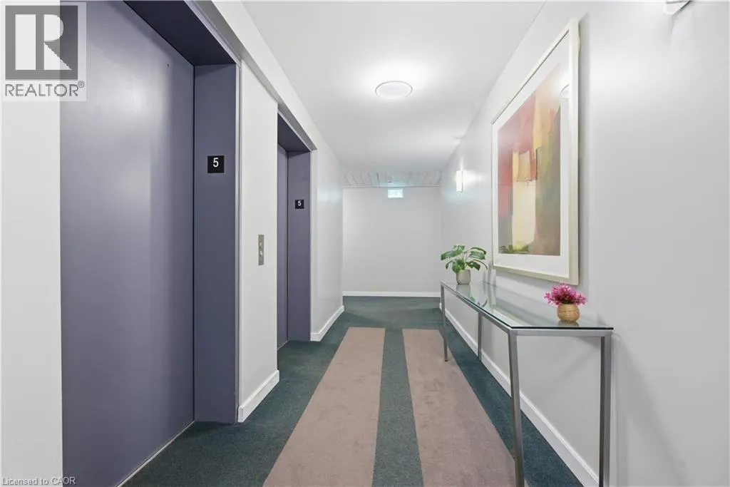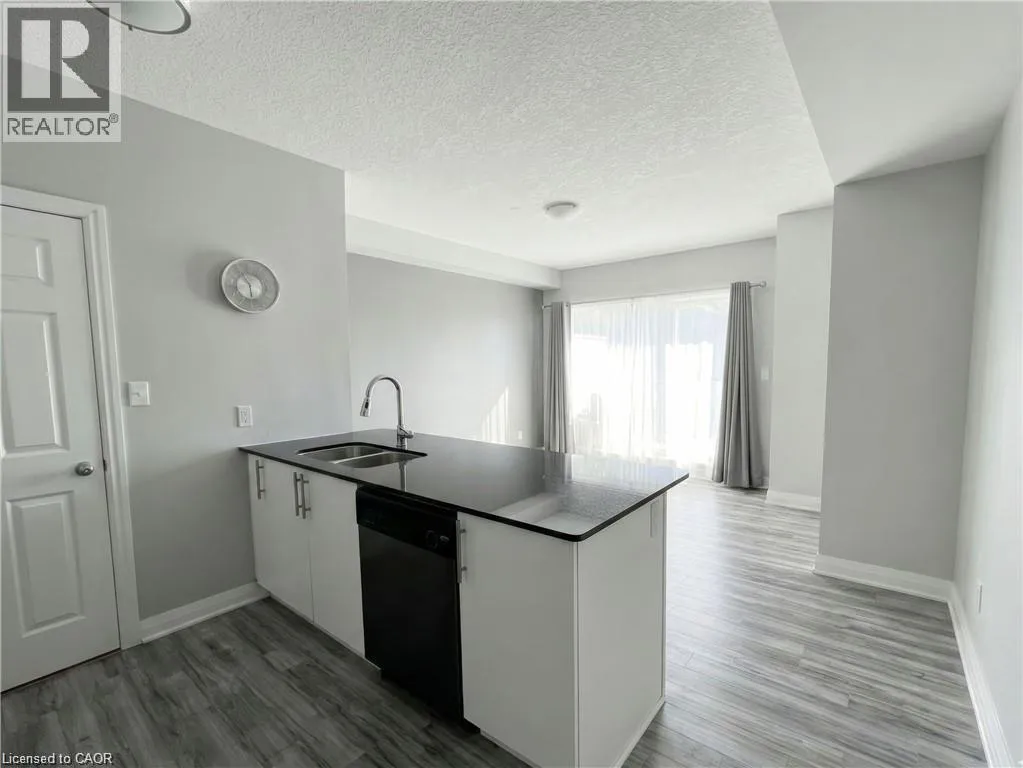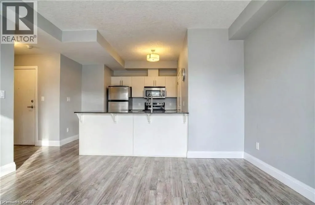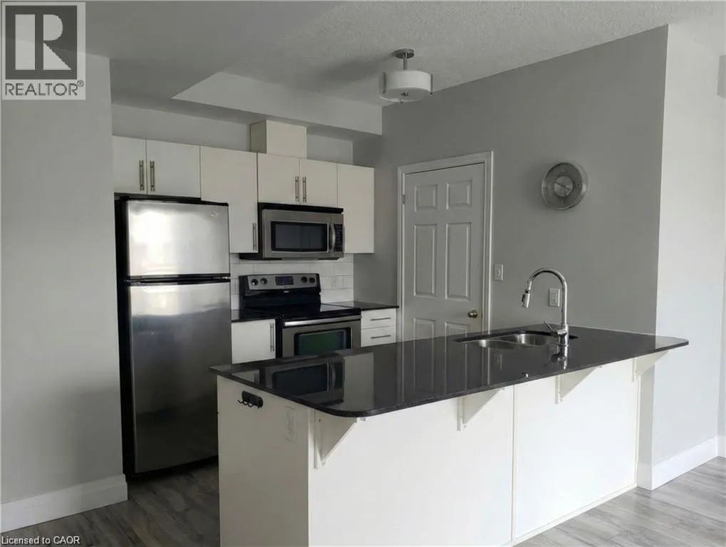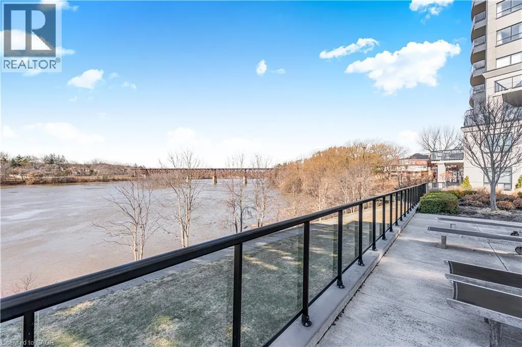 Welcome to Waterscape, a well-located condo community along the Grand River in historic Downtown Galt. This bright and functional 2-bedroom, 1-bathroom condo offers a great opportunity for first-time buyers, downsizers, or investors looking for low-maintenance living in a prime location. The open-concept layout features a modern kitchen with ample cabinetry, granite countertops, and stainless steel appliances, flowing seamlessly into the living area-perfect for everyday living or entertaining. Large windows bring in plenty of natural light, while the private balcony provides a quiet outdoor space to relax. Enjoy the convenience of in-suite laundry, underground parking, and a storage locker. Condo fees include heating, cooling, and water, helping keep monthly expenses predictable and affordable. The building offers secure controlled entry, a fitness room, party/lounge space, and a rooftop terrace with BBQs and seating-ideal for entertaining or enjoying views of the river. Located just steps from scenic walking trails, the Cambridge Mill, Gaslight District, farmers' market, shops, dining, and theatre, everything you need is within walking distance. Experience easy condo living in one of Cambridge's most desirable downtown locations. (id:27476)