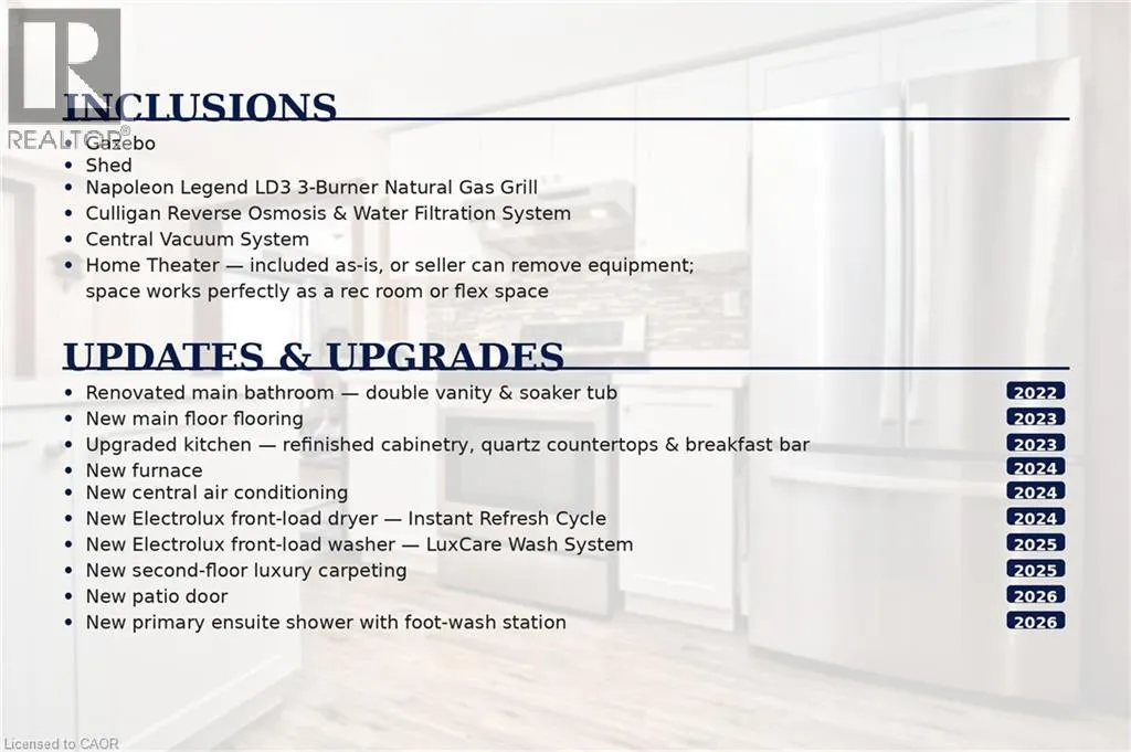 Langlaw GPS Step into this beautifully updated 3-bed, 2-full-bath, 2-half-bath detached home offering a rare blend of comfort, style, and standout features. Located in a family-friendly neighbourhood, this home has been thoughtfully upgraded top to bottom, giving buyers true peace of mind and exceptional value.The main floor features new flooring (2023), a new patio door (2026), and an upgraded kitchen with refinished cabinetry, quartz countertops, and a breakfast bar. Upstairs: new luxury carpeting (2025), a fully renovated main bathroom with double vanity and soaker tub (2022), and a new custom shower with foot-wash station in the primary ensuite (2026). New furnace and central air (2024), updated washer and dryer, central vacuum, and a Culligan water filtration system complete the list of practical upgrades.A fully insulated, sound-controlled home theater is included - or the seller can remove the equipment, leaving you with a great rec room or flex space. Outside: gazebo, shed, and a Napoleon natural gas grill perfect for summer entertaining.The home also features a steel roof, giving you peace of mind knowing you may never have to replace your roof for decades to come.With premium finishes, major mechanicals updated, a steel roof built to last, and a flexible bonus space, this home is truly move-in ready and stands out in today's market. (id:27476)