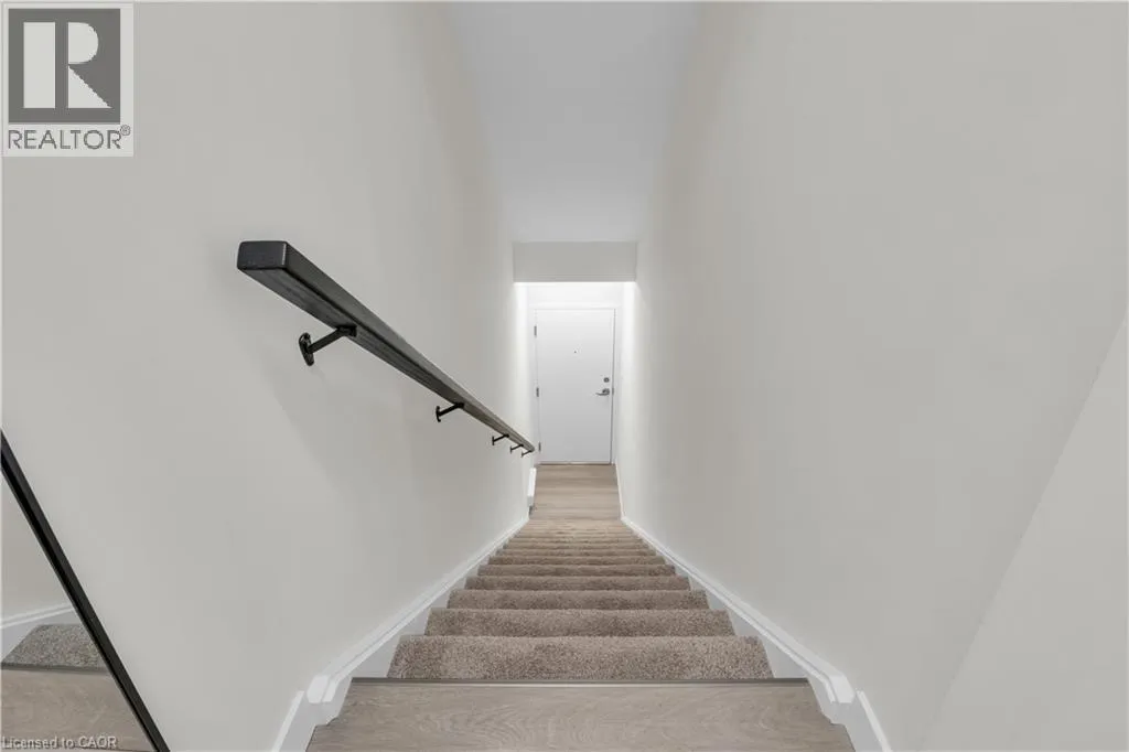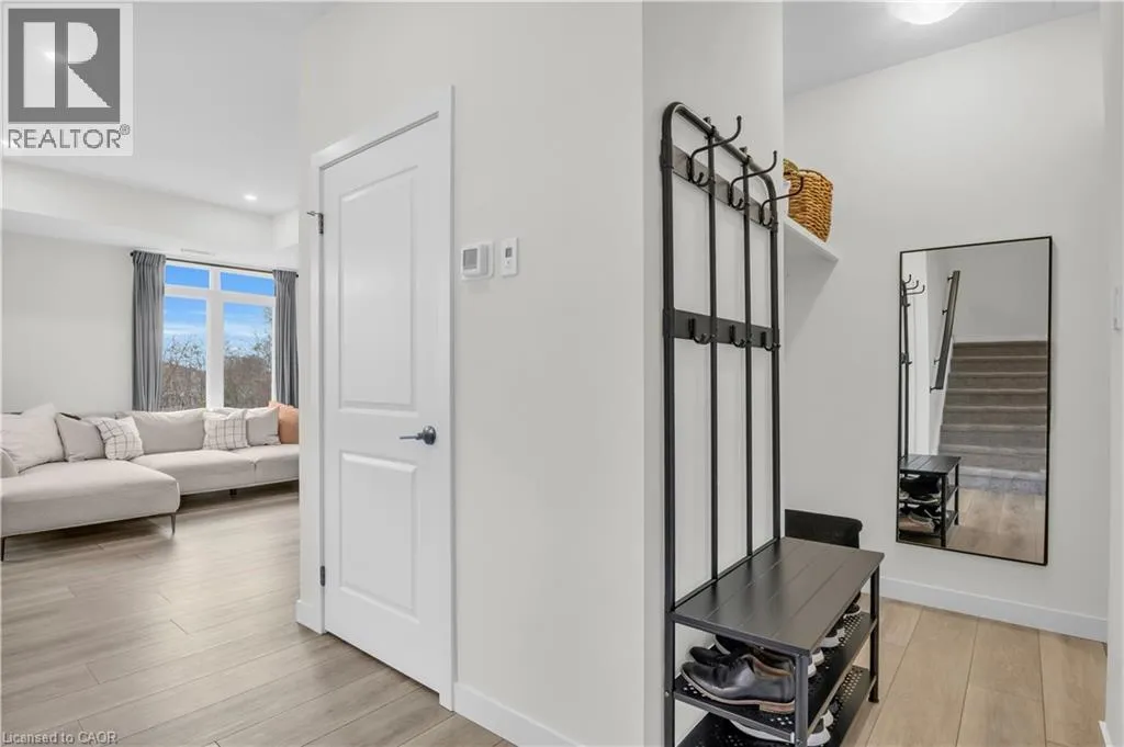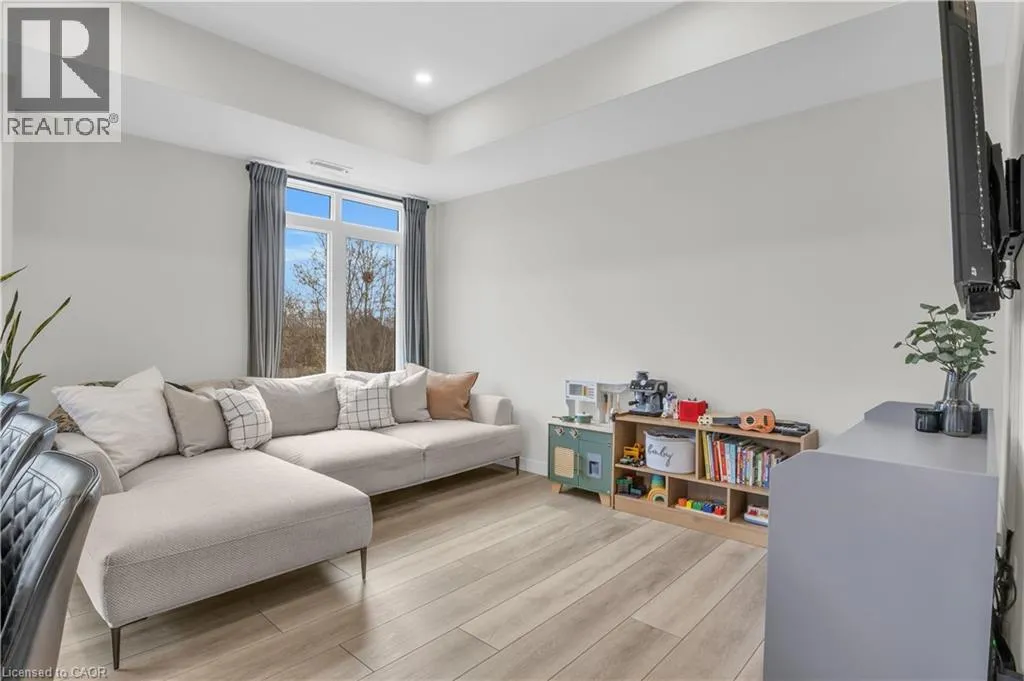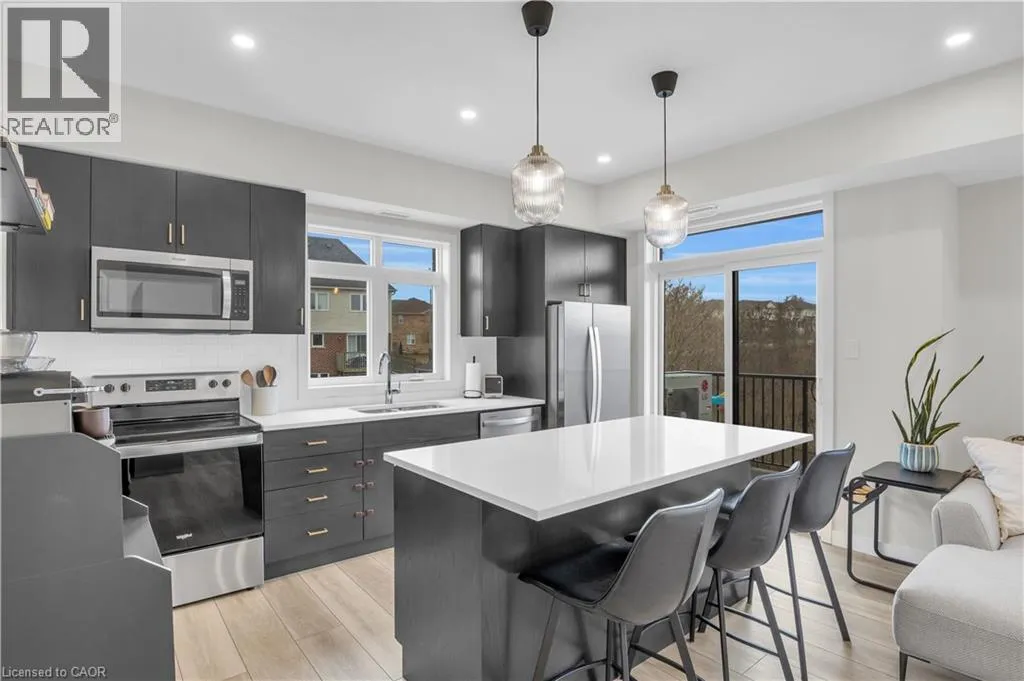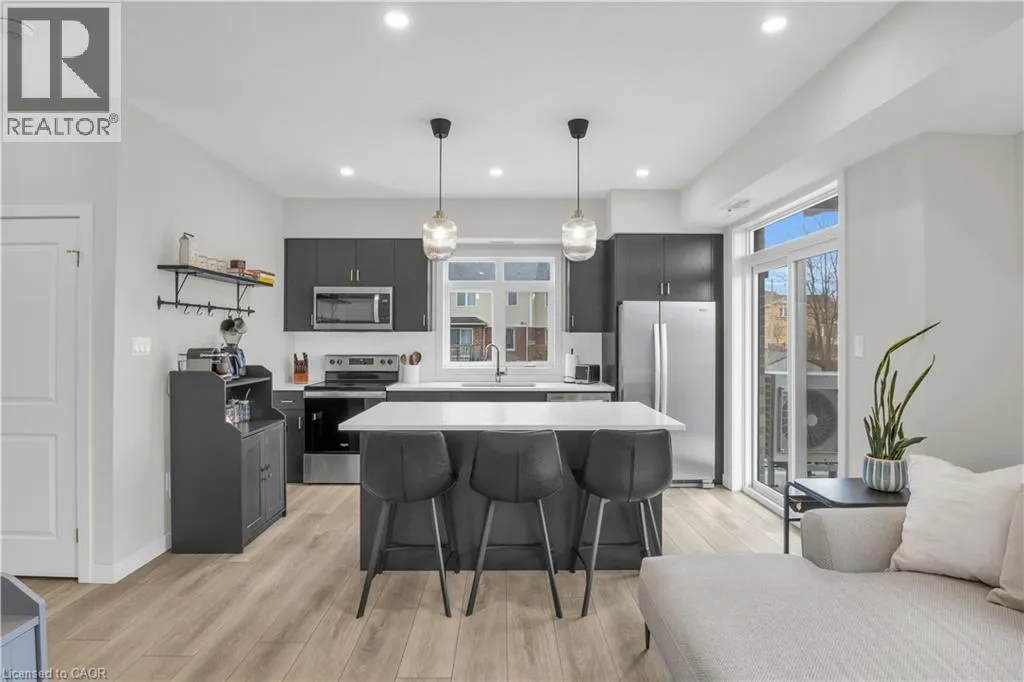 FRANKLIN BLVD TO MYERS RD Welcome to 56-405 Myers Road in Cambridge! This bright and beautifully designed main floor end-unit stacked townhouse offers two bedrooms, two balconies, and a seamless blend of modern finishes and natural surroundings. As an end unit, the additional windows bring in an abundance of natural light, creating a warm and inviting atmosphere throughout. Backing onto peaceful trails and greenspace, this home offers a rare sense of privacy and a connection to nature, with both balconies facing the greenery. One balcony is conveniently located off the kitchenâperfect for morning coffee or evening unwindingâwhile the second is accessed from the bedroom, offering another quiet outdoor retreat. The open-concept layout is both functional and stylish, effortlessly connecting the living, dining, and kitchen areas. The kitchen is a standout feature, complete with stainless steel appliances, quartz countertops, ample cabinetry, and a large island with pendant lightingâideal for gathering, cooking, or casual dining. Quartz surfaces continue into the bathrooms, adding a polished and cohesive feel throughout the home. Both bedrooms are well-sized and thoughtfully laid out, with the primary suite featuring its own ensuite with a glass shower. Ensuite laundry and a dedicated parking space add to the everyday convenience. Set in a well-connected neighbourhood close to schools, parks, shopping, and recreational amenities, this home offers a comfortable and vibrant lifestyle with nature right at your doorstep. (id:27476)