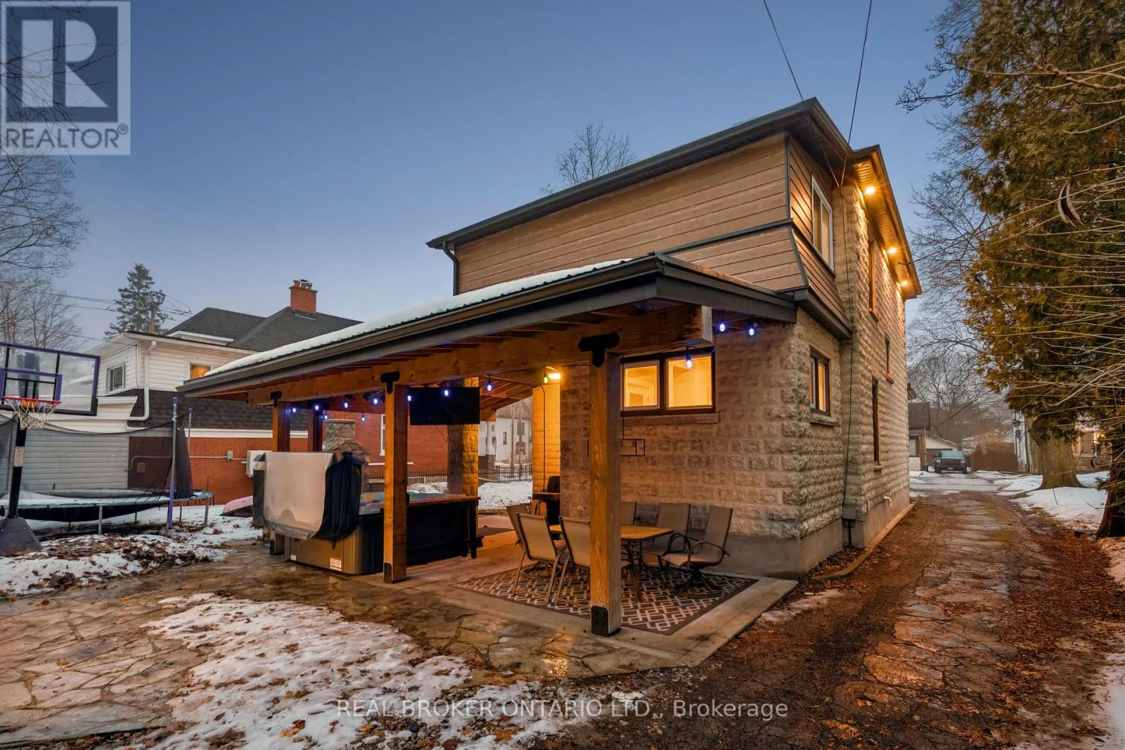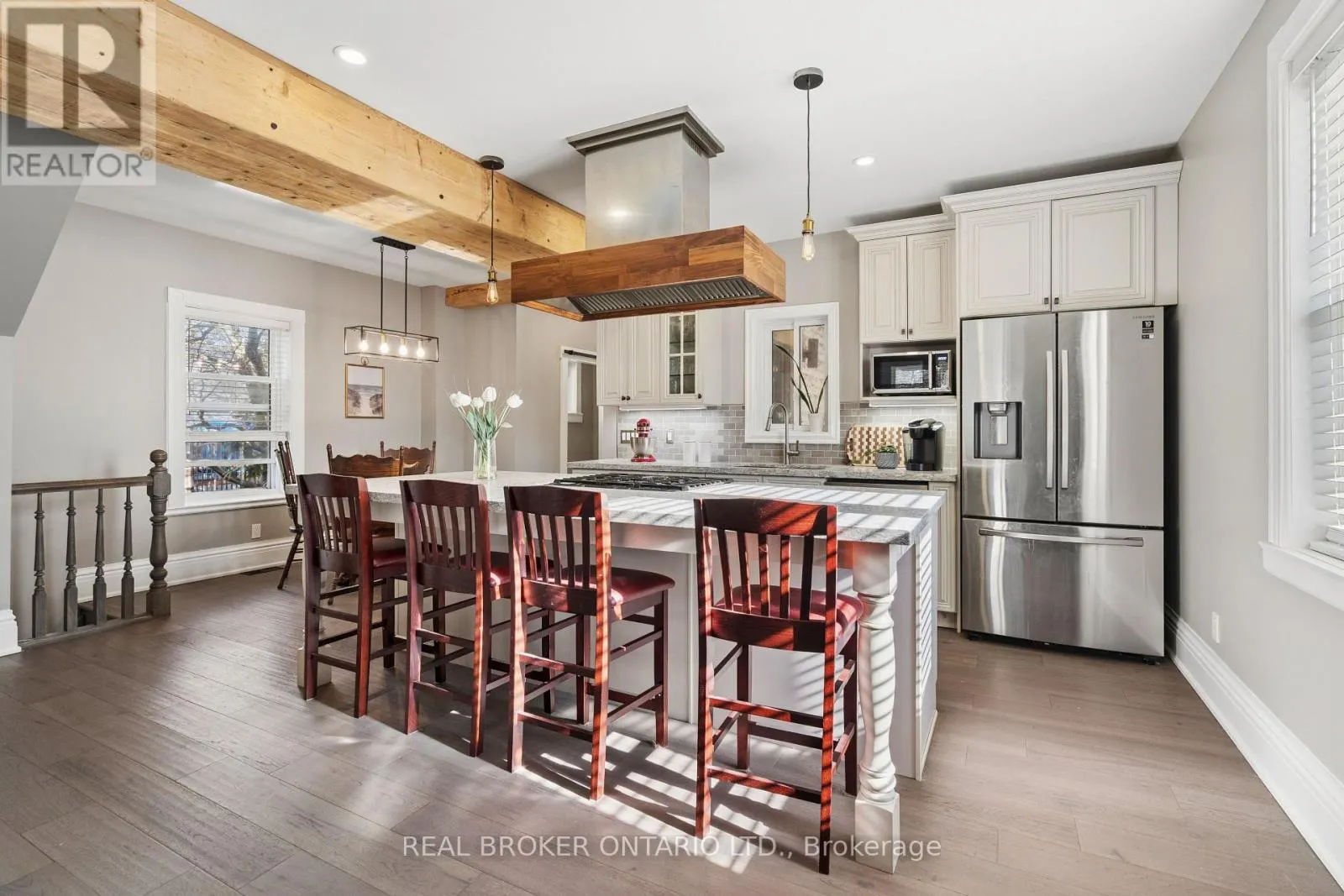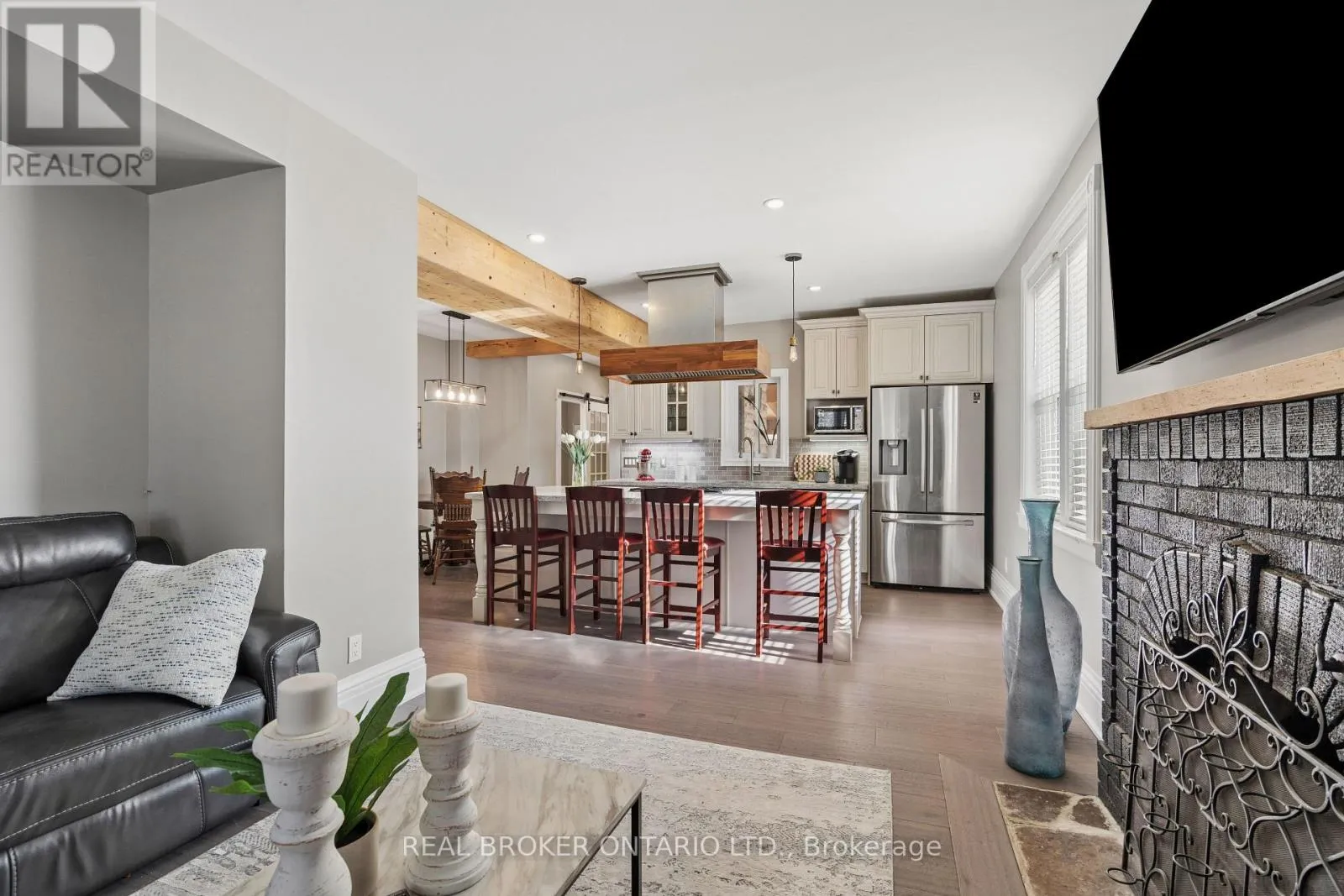 Cross Streets: King St E & Lowther St S. ** Directions: King St E to Lowther St S to Hamilton St. Welcome to 855 Hamilton Street in Cambridge's historic Preston neighbourhood, where timeless character meets modern family living. This beautifully updated 1,300 sq ft detached century home sits on a generous 55 x 110 ft lot, offering the perfect balance of charm, comfort, and space for everyday living and entertaining. The main floor features engineered hardwood flooring, pot lights, and a warm, inviting living room centered around a cozy wood-burning fireplace. The renovated open-concept kitchen is the heart of the home, showcasing a massive quartz island with built-in gas range and statement hood vent, stainless steel appliances, pendant lighting, and plenty of space for family gatherings. The dining area flows seamlessly from the kitchen, creating an ideal layout for hosting and everyday meals. A 2-piece bathroom and walkout to the backyard complete the main level. Upstairs you'll find three bedrooms with engineered hardwood throughout. The spacious primary suite features a walk-in closet and an open-concept 5-piece ensuite, while the additional bedrooms share a 5-piece semi-ensuite, providing convenience for family living. The backyard is designed for relaxing and entertaining, featuring a covered patio with electricity, hot tub, and built-in stone fireplace, creating the perfect setting for evenings with family and friends. A rare highlight is the detached three-car garage, currently set up with one bay as a games room or gym, along with parking for three vehicles in the driveway. Major updates completed between 2018-2019 include new wiring, plumbing, kitchen, bathrooms, and flooring, providing modern comfort while maintaining the charm of this beautiful century home. Located close to parks, schools, and amenities in the desirable Preston community, this home offers a fantastic opportunity for families looking for character, space, and thoughtful updates. (id:27476)