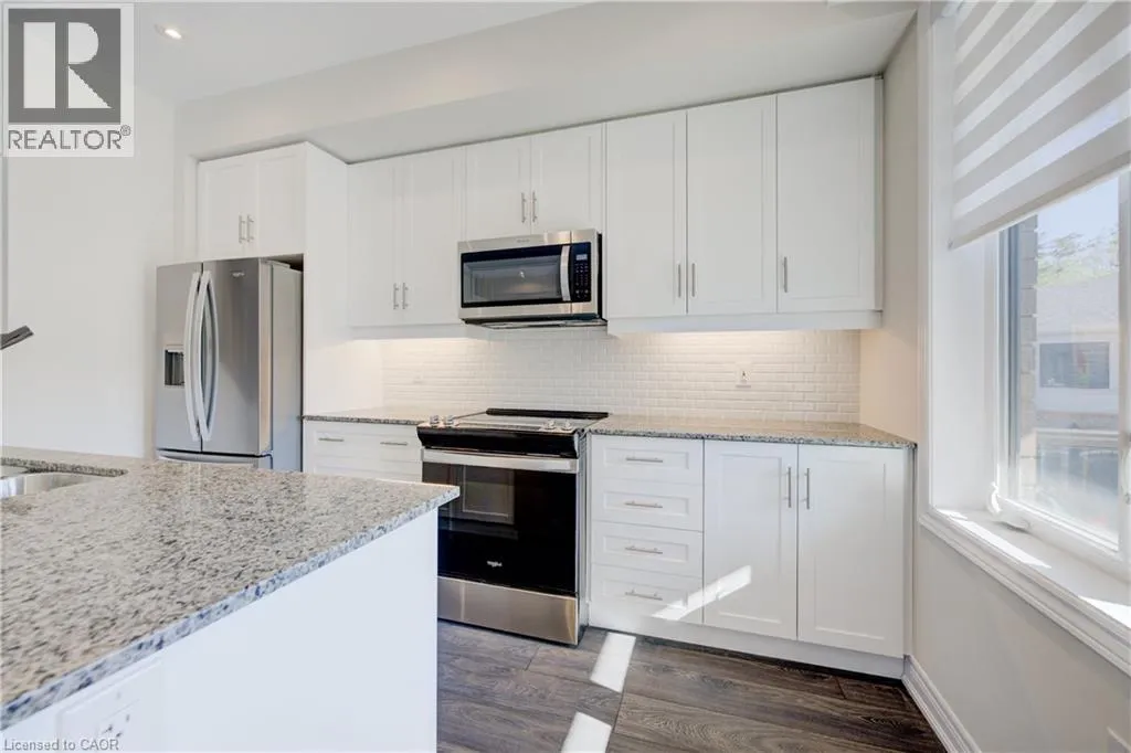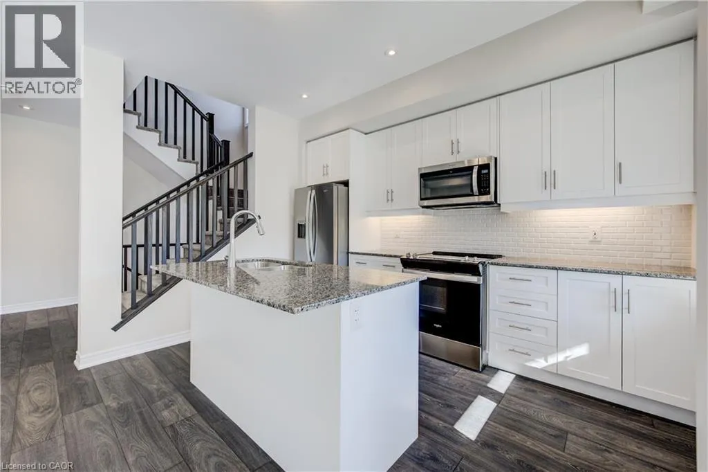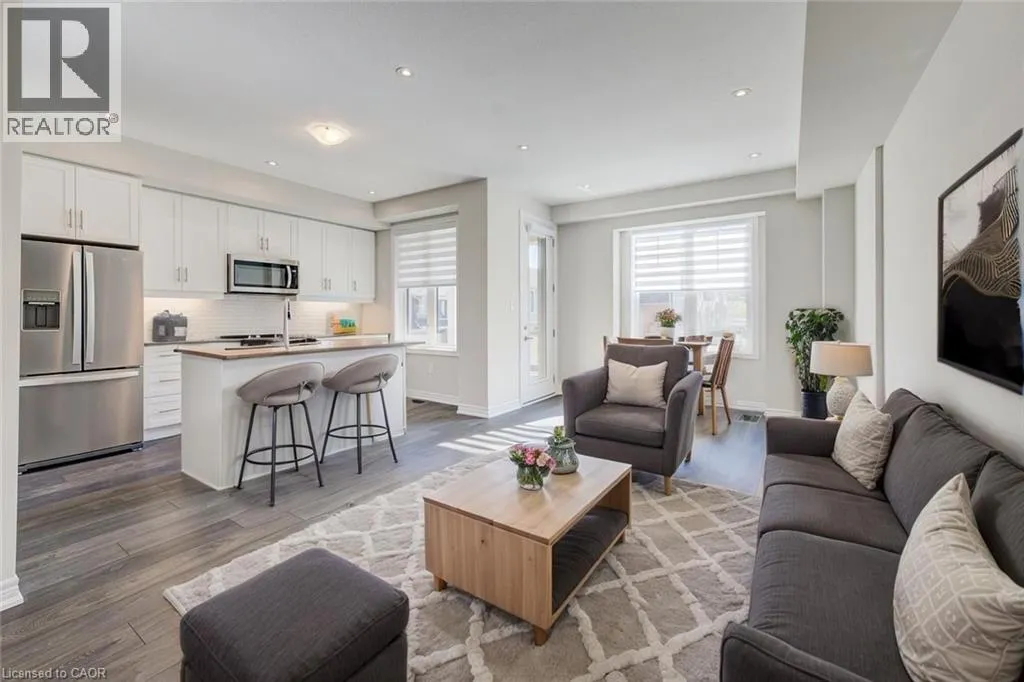 PINEBUSH ROAD STYLISH. SPACIOUS. STEPS FROM IT ALL. Welcome to your next chapter in this modern townhomeâ#116-10 Birmingham Drive, Cambridge. Tucked into a vibrant and walkable community, this home spans 3 thoughtfully designed levels and offers over 1,350 sq ft of sun-filled living space. From the moment you step inside, youâre greeted by contemporary finishes and a bright, open-concept layout that feels both welcoming and functional. The heart of the home is the main living areaâanchored by a sleek kitchen featuring granite countertops, stainless steel appliances, custom 39â upper cabinetry with LED lighting, and a breakfast bar perfect for casual meals or morning coffees. The adjoining family room flows effortlessly to a private, covered terrace balconyâan ideal spot to relax and unwind. Upstairs, the primary retreat is your private escape, complete with a walk-in closet, private balcony, and upgraded blackout blinds. A second bedroom offers ample space for guests, family, or a home office, while designer carpet and mirrored closets elevate the space. The 4pc bathroom completes this level. The ground level offers bonus flexibility with in-suite laundry and convenient interior access to the garageâplus a second private entrance and your own driveway. With two-car parking (garage + driveway), upgraded pot lights, smart storage, smart exterior lights, 200AMP panel, and custom window treatments throughout, every detail has been carefully curated. Located just minutes from shops, restaurants, parks, schools, and highway access, this move-in-ready home checks every box. Whether you're a first-time buyer, busy professional, or savvy investorâthis is one you donât want to miss. Photos are Virtually staged. (id:27476)