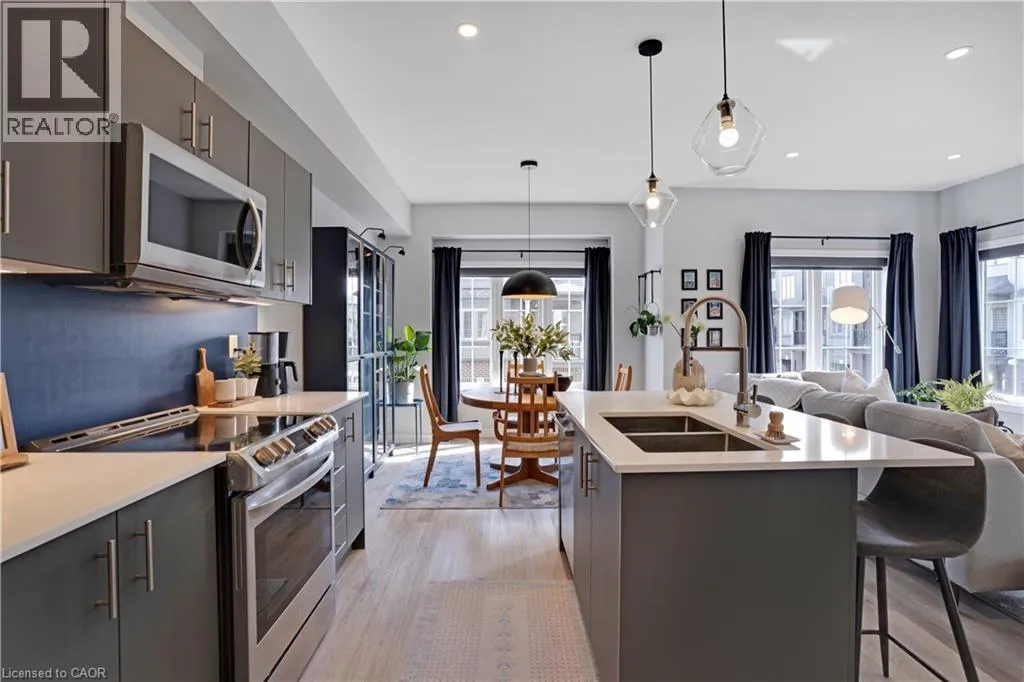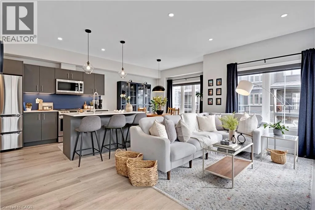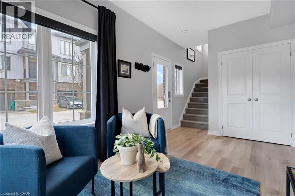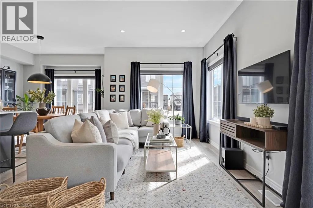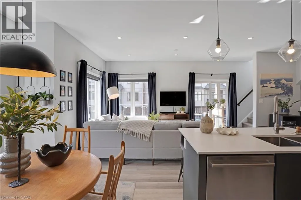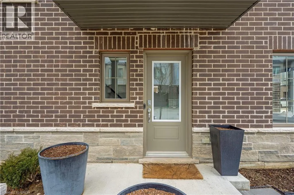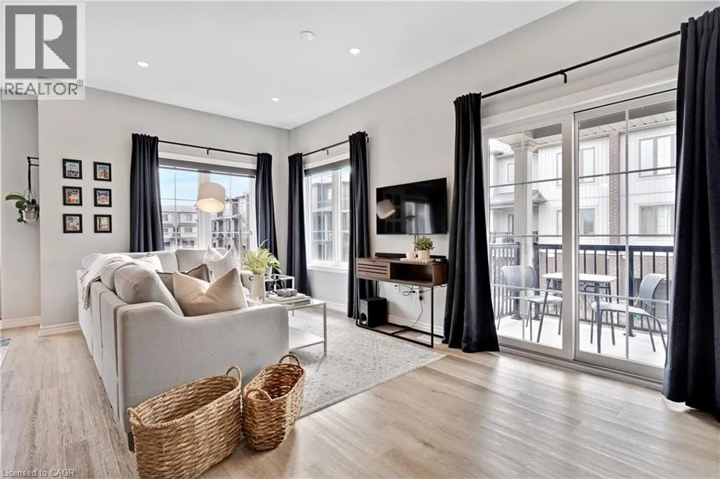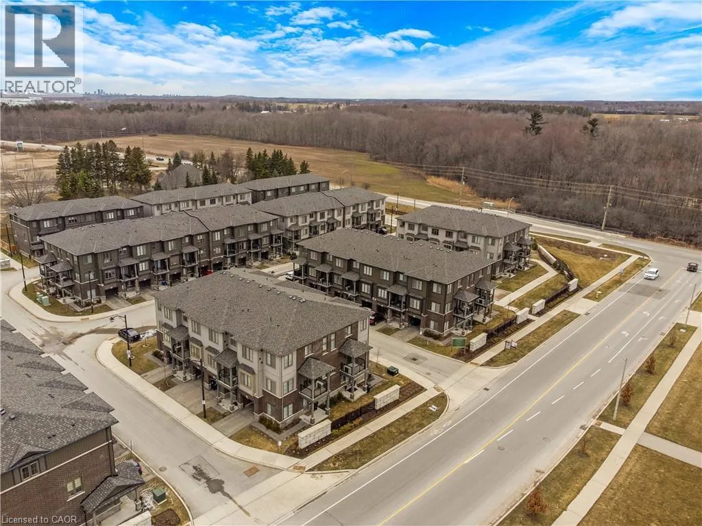 Maple Grove Rd to Compass Trail Welcome to this well-kept end-unit, three-level townhouse offering a bright, practical layout and plenty of natural light throughout. As you walk in, youâll find a flexible bonus space on the bottom level that can easily be used as a second living area, home office, or mudroom, with convenient access to the garage. The second floor is where youâll spend most of your time, with an open-concept layout that feels both comfortable and inviting. The kitchen features quartz countertops, a large island, and a walk-in pantry, with plenty of room for cooking and gathering. The dining area flows naturally into the living room, where oversized windows bring in lots of light and create a warm, easy going atmosphere. Youâll also find a powder room and in-suite laundry on this level for added convenience. Upstairs, the third level includes a spacious primary bedroom along with a second generously sized bedroom, making it a great setup for a small family, professionals, or anyone needing a bit of extra space. The large windows continue throughout, giving the home a bright and airy feel from top to bottom. Being an end unit, youâll enjoy additional privacy and extra windows that really make a difference in how the space feels. Located just steps from public transit and only minutes to Highway 401, Kitchener, Waterloo, parks, shopping, and everyday amenities, this is a great opportunity to own a comfortable, well-located home in a growing community. (id:27476)