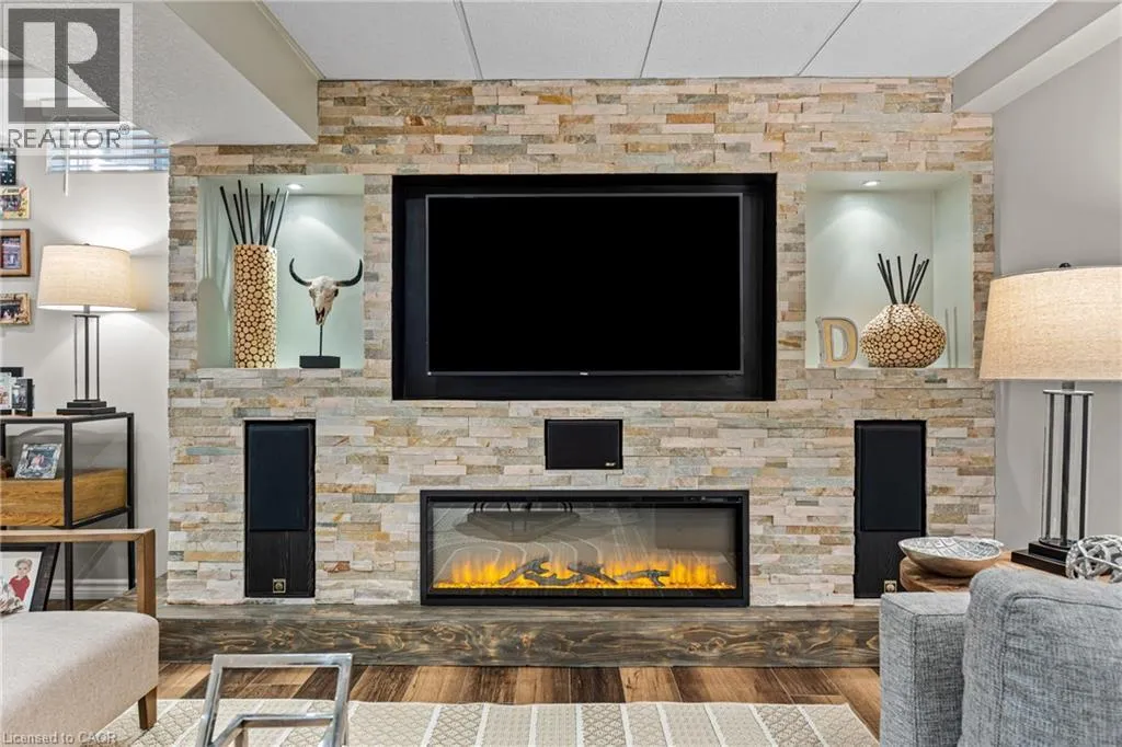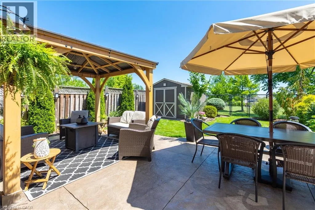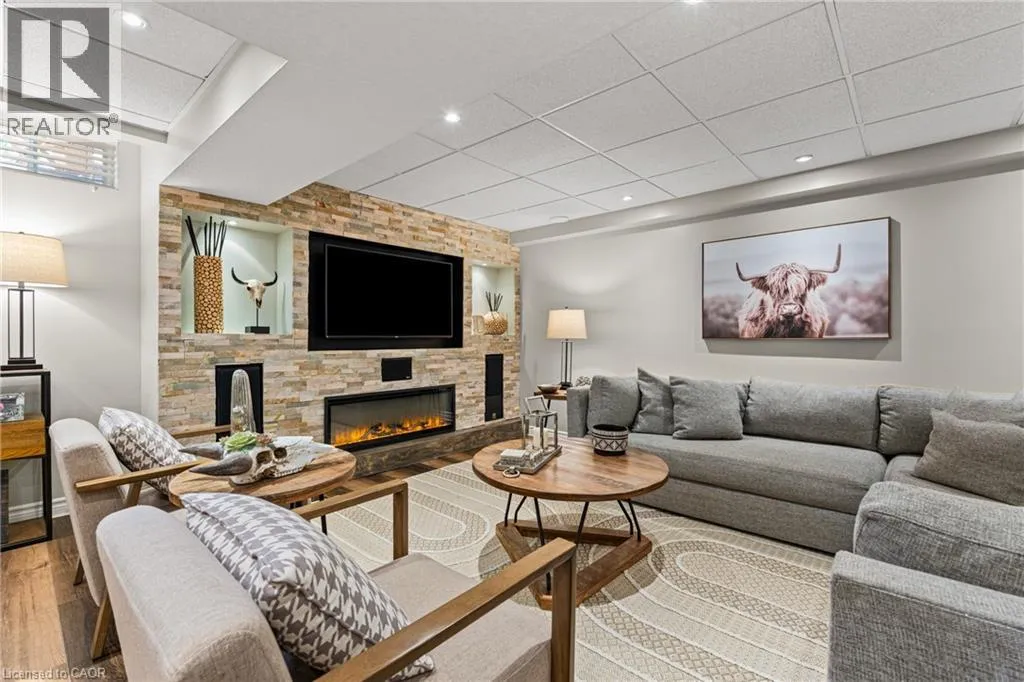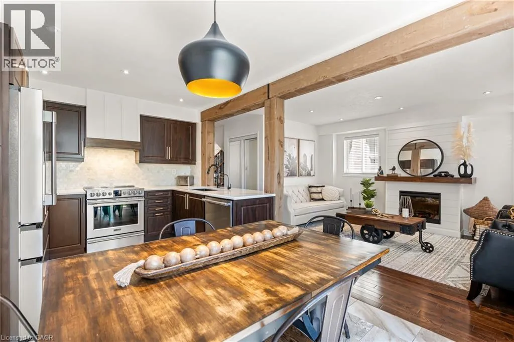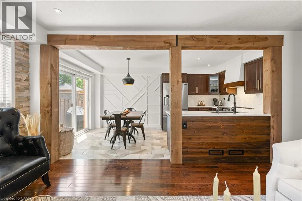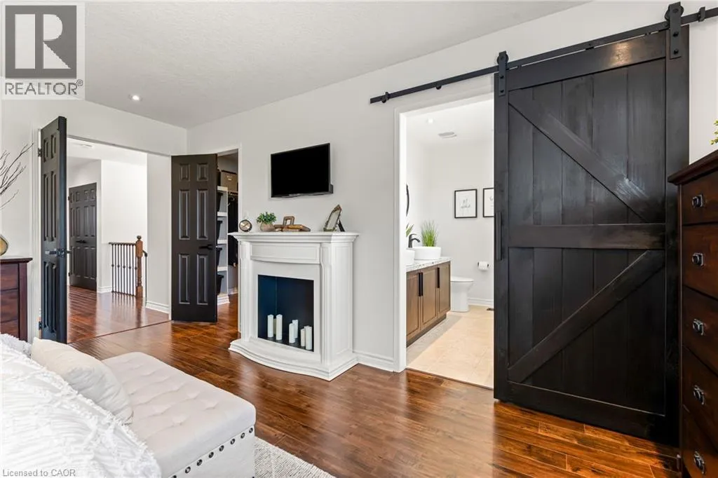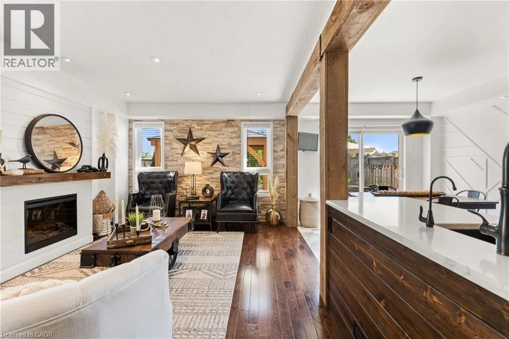 Cheese Factory to Carpenter Every detail of this property is on point. The finishes inside and out are magazine worthy. With over 2,400 sq ft of usable space across all three floors, thereâs plenty of room for the whole family. As soon as you arrive, youâll notice the landscaping, aggregate stone driveway, stamped concrete accents, walkway to the backyard, and contemporary front door. Inside, you'll find custom details throughout, including feature walls, upgraded lighting, hardwood and ceramic flooring, and wide luxury vinyl plank. The main level features a spacious, light-filled living room, a stylish powder room, an access door to the garage, a formal dining room, and a large kitchen with quartz counters, Frigidaire Professional appliances, a custom hood fan, black fixtures, and sliders to the backyard. Step outside to the stamped concrete patio with a custom gazebo lounge, separate dining area, storage shed, and views of the park. Upstairs offers a primary suite with a five-piece ensuite and an oversized walk-in closet that can easily double as an office space. Two additional bedrooms (one with its own walk-in closet) and upper-level laundry complete the space. The finished basement is ideal for entertaining, featuring a custom media wall, fireplace, beverage bar with wine fridge, and ample storage. Located very close to schools, parks, trails, transit, shopping, and major highways. (id:27476)