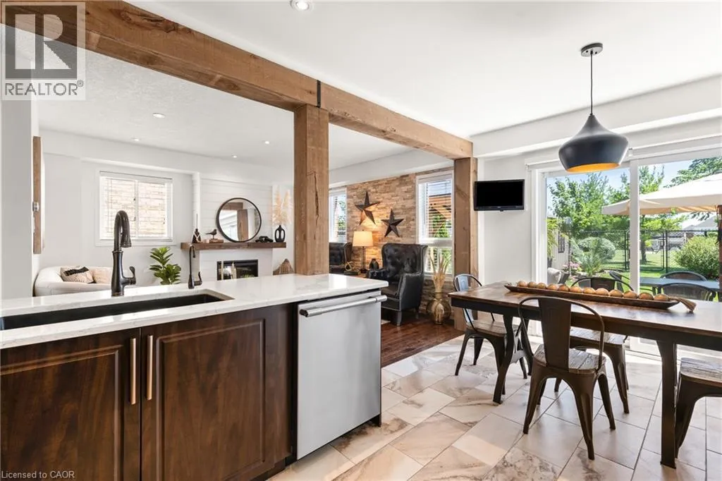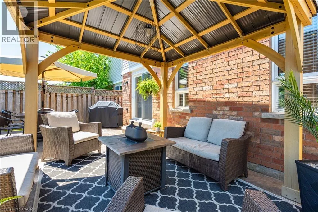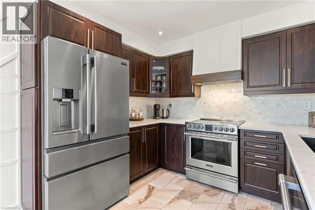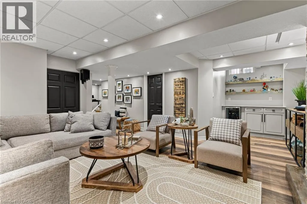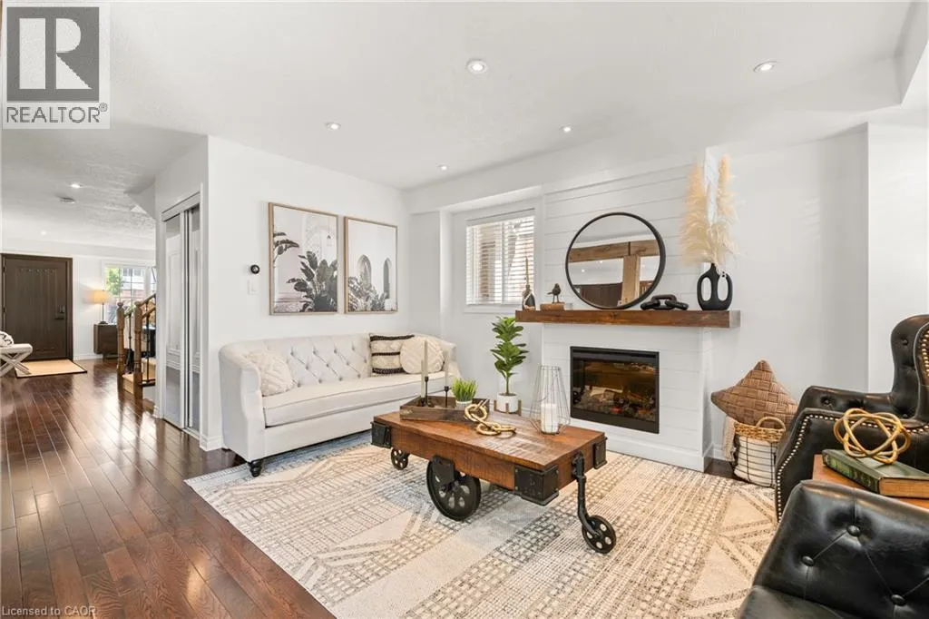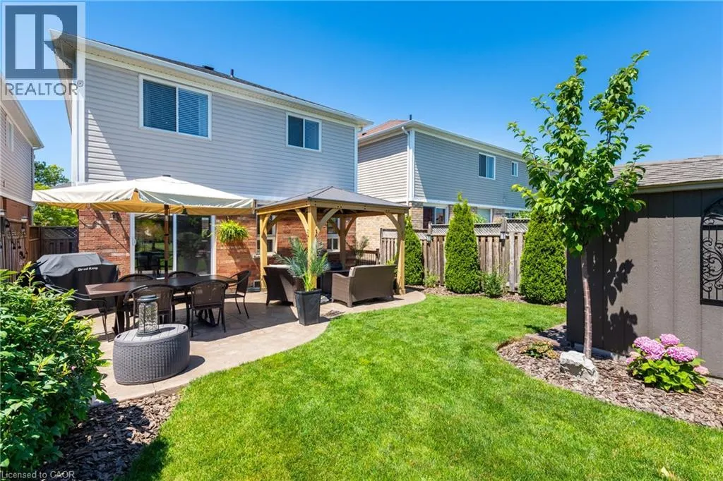 Cheese Factory to Carpenter Every detail of this property is on point. The finishes inside and out are magazine worthy. With over 2,400 sq ft of usable space across all three floors, thereâs plenty of room for the whole family. As soon as you arrive, youâll notice the landscaping, aggregate stone driveway, stamped concrete accents, walkway to the backyard, and contemporary front door. Inside, you'll find custom details throughout, including feature walls, upgraded lighting, hardwood and ceramic flooring, and wide luxury vinyl plank. The main level features a spacious, light-filled living room, a stylish powder room, an access door to the garage, a formal dining room, and a large kitchen with quartz counters, Frigidaire Professional appliances, a custom hood fan, black fixtures, and sliders to the backyard. Step outside to the stamped concrete patio with a custom gazebo lounge, separate dining area, storage shed, and views of the park. Upstairs offers a primary suite with a five-piece ensuite and an oversized walk-in closet that can easily double as an office space. Two additional bedrooms (one with its own walk-in closet) and upper-level laundry complete the space. The finished basement is ideal for entertaining, featuring a custom media wall, fireplace, beverage bar with wine fridge, and ample storage. Located very close to schools, parks, trails, transit, shopping, and major highways. (id:27476)