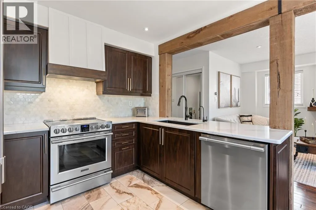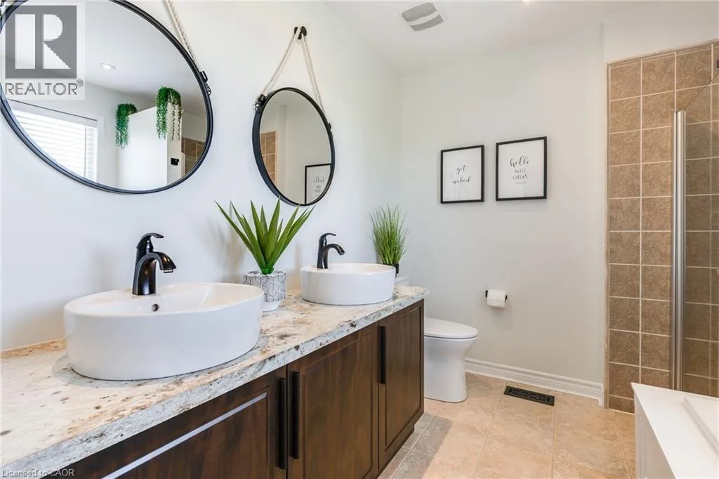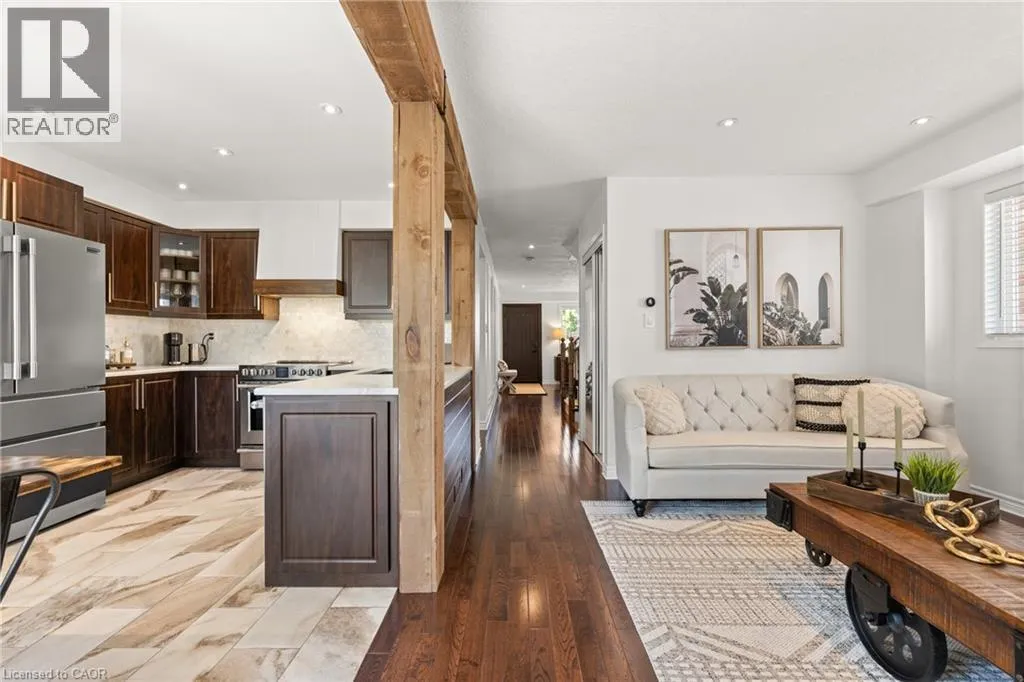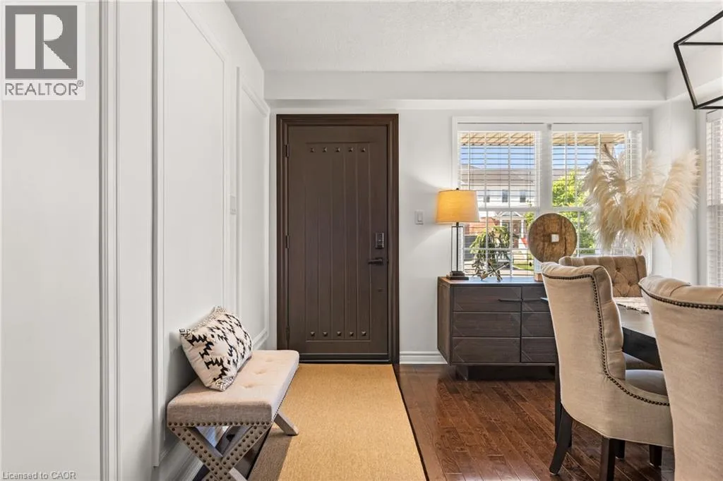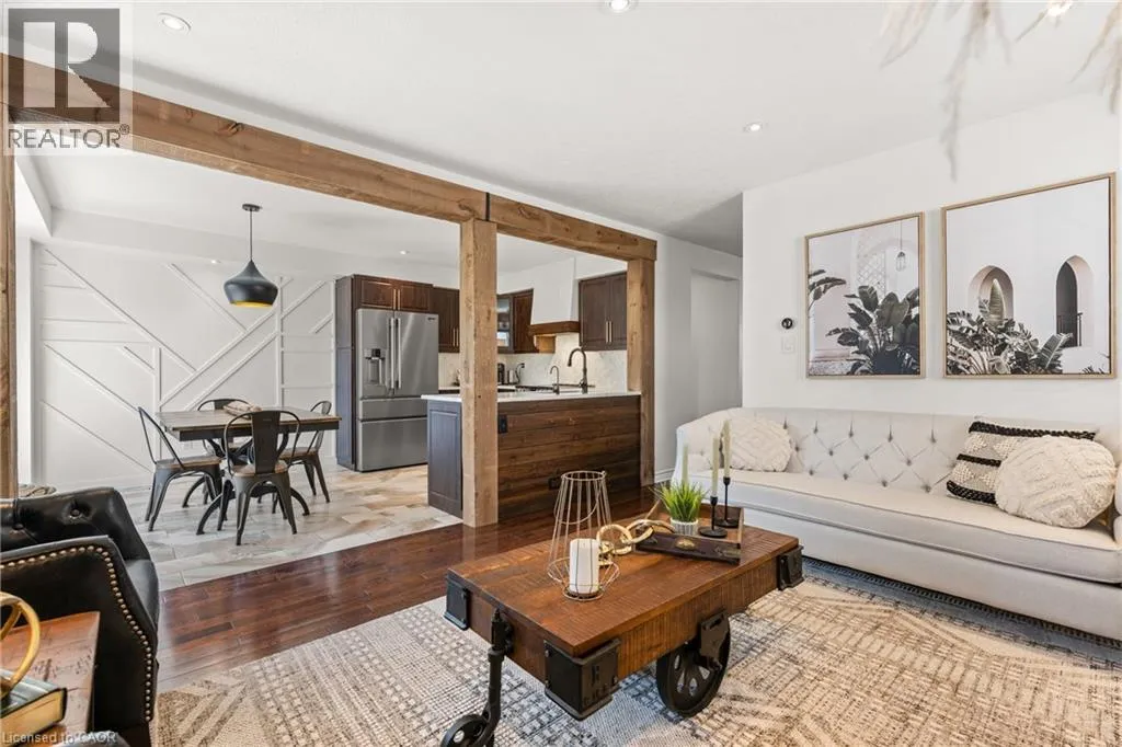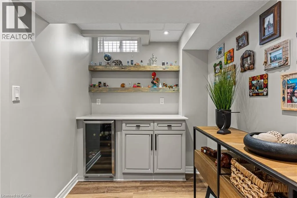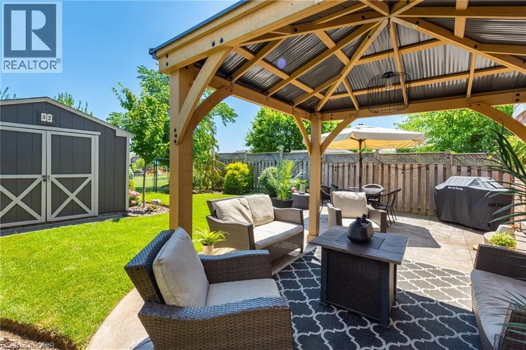 Cheese Factory to Carpenter Every detail of this property is on point. The finishes inside and out are magazine worthy. With over 2,400 sq ft of usable space across all three floors, thereâs plenty of room for the whole family. As soon as you arrive, youâll notice the landscaping, aggregate stone driveway, stamped concrete accents, walkway to the backyard, and contemporary front door. Inside, you'll find custom details throughout, including feature walls, upgraded lighting, hardwood and ceramic flooring, and wide luxury vinyl plank. The main level features a spacious, light-filled living room, a stylish powder room, an access door to the garage, a formal dining room, and a large kitchen with quartz counters, Frigidaire Professional appliances, a custom hood fan, black fixtures, and sliders to the backyard. Step outside to the stamped concrete patio with a custom gazebo lounge, separate dining area, storage shed, and views of the park. Upstairs offers a primary suite with a five-piece ensuite and an oversized walk-in closet that can easily double as an office space. Two additional bedrooms (one with its own walk-in closet) and upper-level laundry complete the space. The finished basement is ideal for entertaining, featuring a custom media wall, fireplace, beverage bar with wine fridge, and ample storage. Located very close to schools, parks, trails, transit, shopping, and major highways. (id:27476)