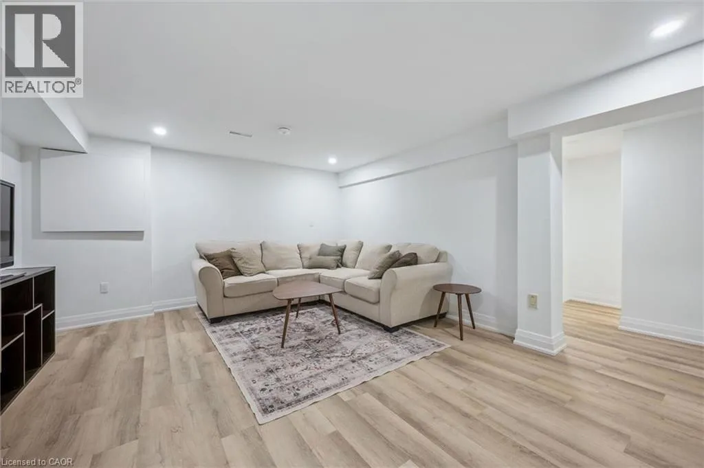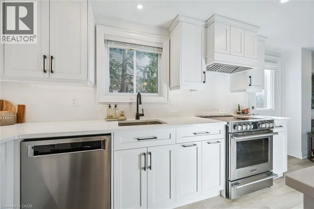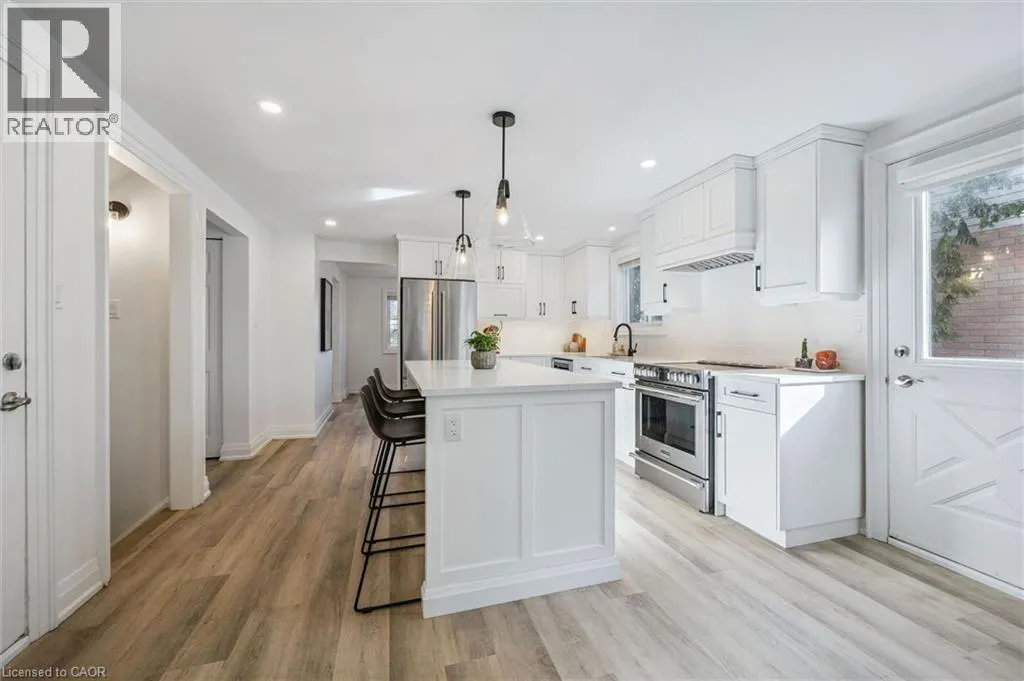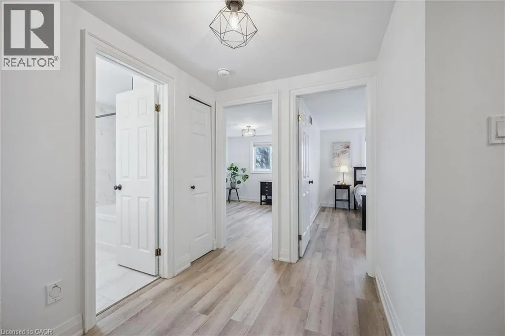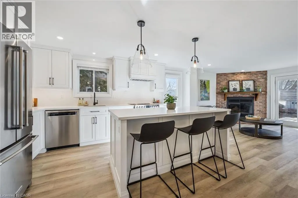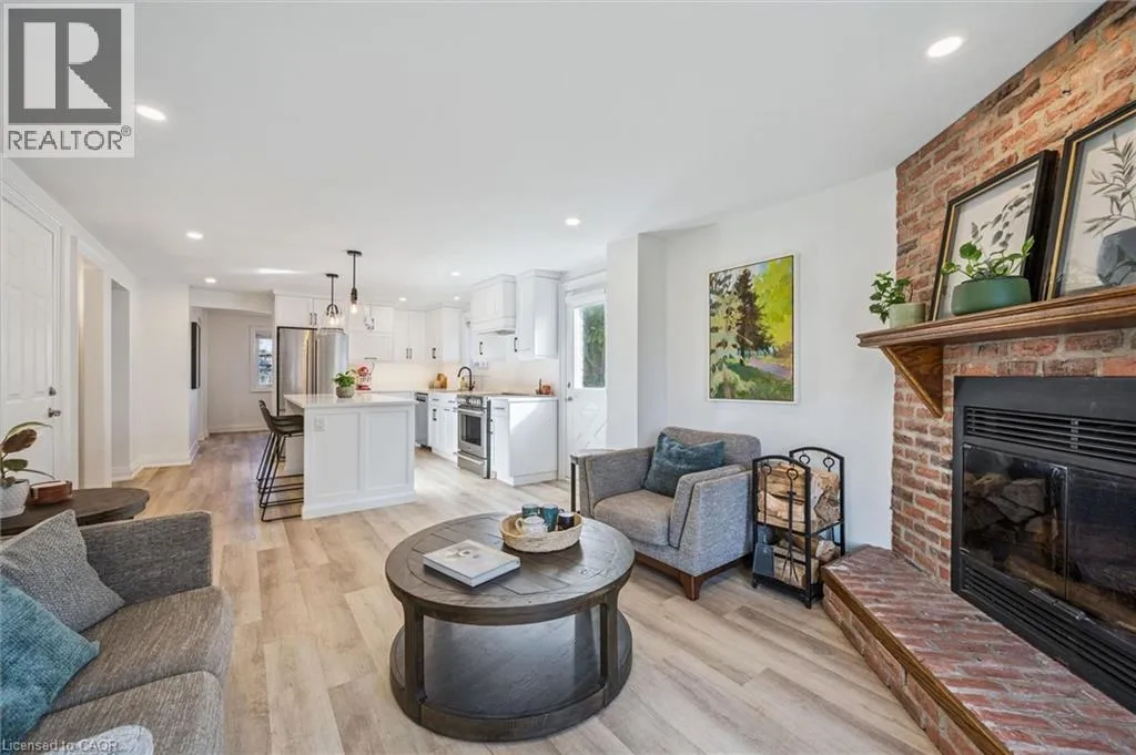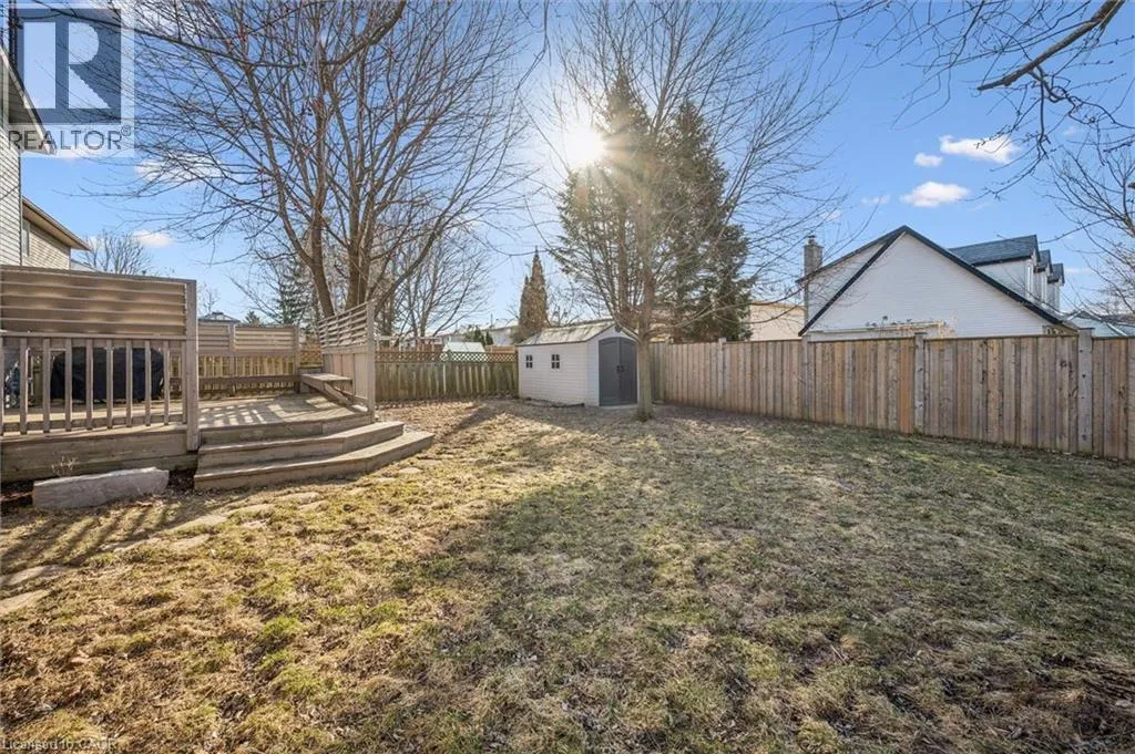 Myers Rd to Enfield Dr Fully Finished Family Home in Desirable South Cambridge - Beautifully updated and move-in ready 4-bedroom home with a double car garage, conveniently located in family-friendly South Cambridge neighbourhood with quick access to Highways 8 and 24, and walking distance to schools, churches, Churchill Park, and scenic Grand River trails. Step inside to a bright, carpet-free interior showcasing large windows and luxury vinyl plank and porcelain tile flooring throughout. The main floor offers a functional layout with formal living and dining rooms at the front, leading to an inviting open-concept family room at the rear, complete with a cozy wood-burning fireplace and garden door walkout to the backyard deck. The stylish, designer kitchen is a true highlightâfeaturing a large island with breakfast bar, quartz countertops, tiled backsplash, stainless steel appliances, and under-cabinet lighting. Upstairs, a modern wood staircase with black spindles leads to four spacious bedrooms and two updated bathrooms finished with quartz countertops and sleek black hardware. The oversized primary suite includes dual closets and a private 3-piece ensuite with walk-in shower, while a 4-piece main bath with tiled tub and shower serves the additional bedrooms. The fully finished basement provides more versatile living space with rec. room, dedicated office with closet, and an updated 3-piece bathroom with tiled walk-in shower. The unfinished laundry/mechanical room offers excellent storage and features an updated furnace (2019), tankless water heater (2025), water softener (2025), and washer/dryer (2025). Outside, enjoy enhanced curb appeal from the mature trees and low-maintenance landscaping that frame the home. A double-wide concrete driveway and two car garage provide parking for 4 vehicles, while a gate opens to a spacious, fully fenced backyard that is great for relaxing or entertaining and completed by a large deck with privacy screens, mature trees, and a garden shed. (id:27476)