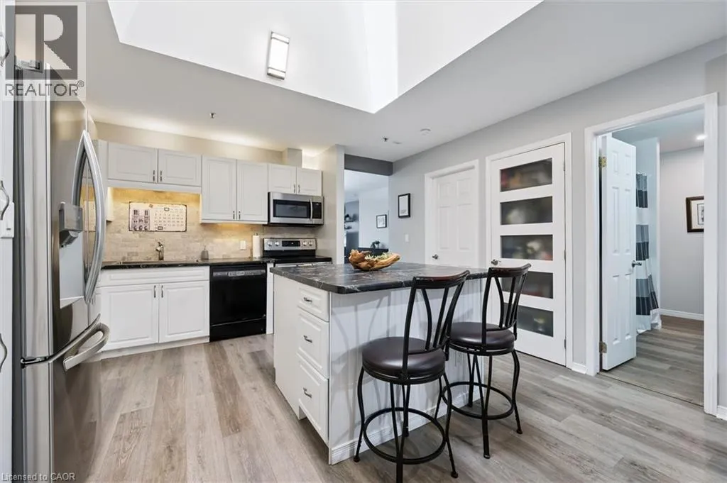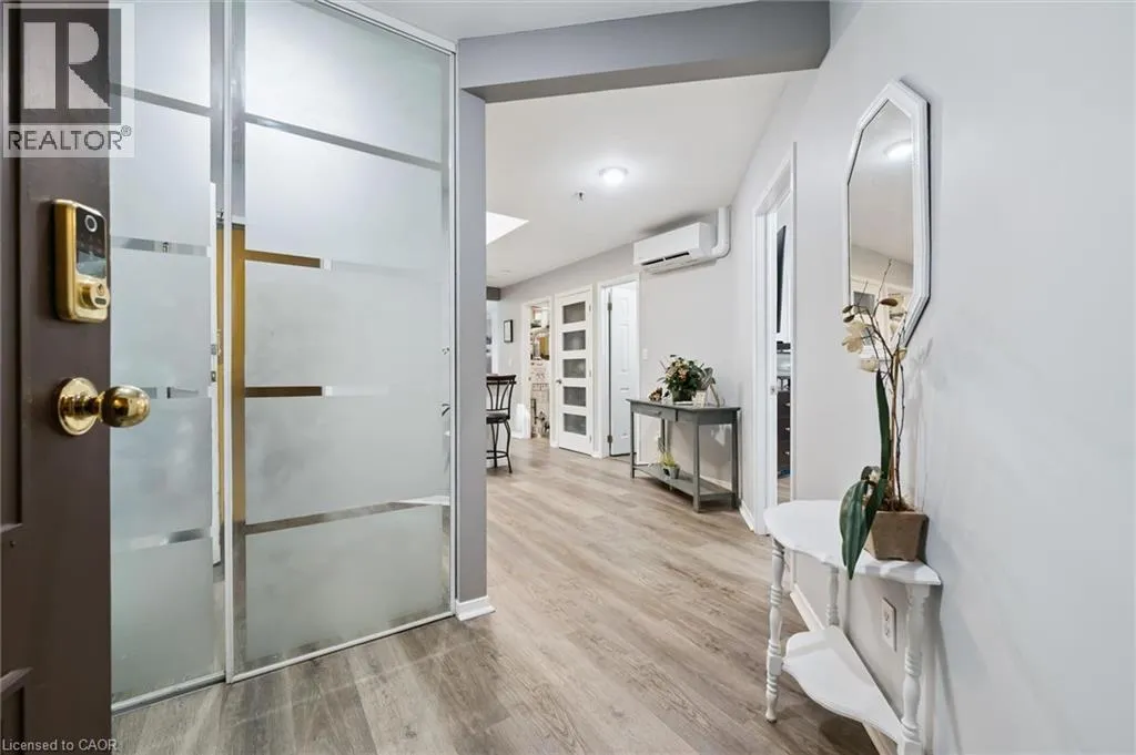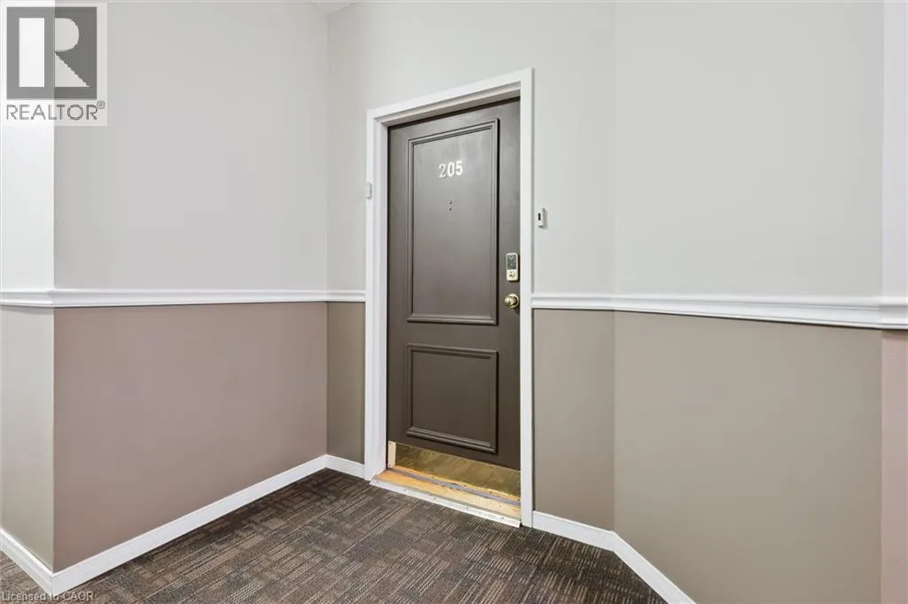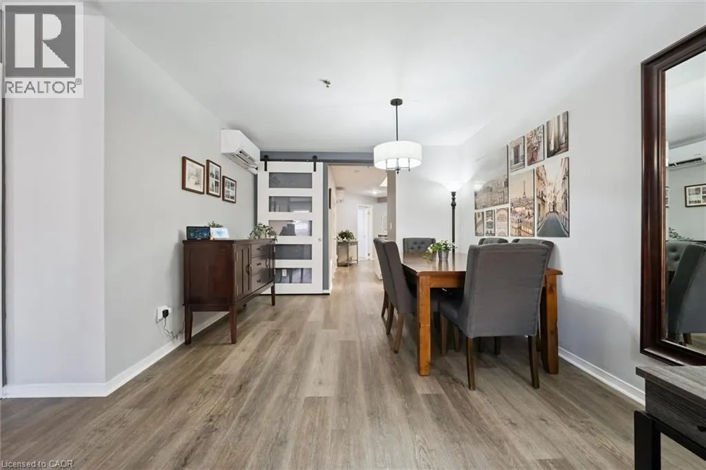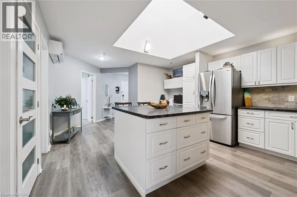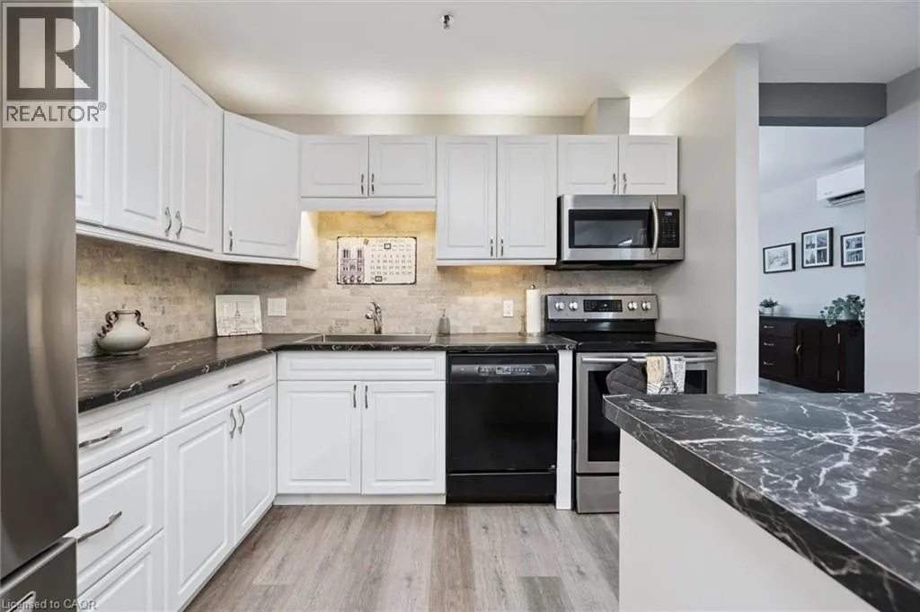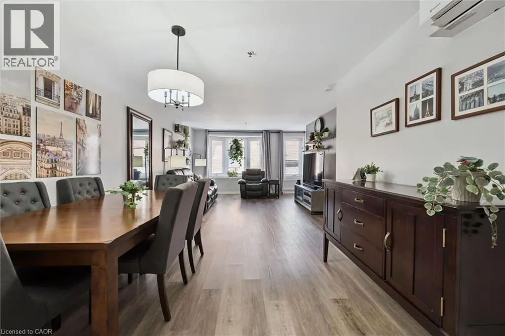 Low maintenance, convenient living. Welcome to Unit #205 - 1009 Queenston Rd located in the Preston area of Cambridge. This spacious 2 bedroom, 2 bathroom condo offers loads of updates including luxury vinyl flooring, a newer kitchen and bathrooms. As you enter the unit there is a large double closet, and on the right is the 2nd bedroom. This bedroom is also attached to the 4-piece main bathroom, leading to the open, bright white kitchen with large island. There is also a useful space currently being used as a home office. Close by the kitchen is the laundry room complete with a small workshop. Steps away is the dining room, prefect for those family gatherings attached to a sizeable living room. At the back of the unit you have the primary bedroom with a walk in closet, and 3 piece ensuite bathroom. This unit also comes with a storage locker, and designated parking spot located in the garage, currently with EV compatible hookup. Located very close to shops, restaurants, parks, public transit and quick highway access this is a great opportunity to be in a well established community. Another key update is the 2 efficient ductless splits this unit offers, providing heat and A/C. Please book your showing today! (id:27476)